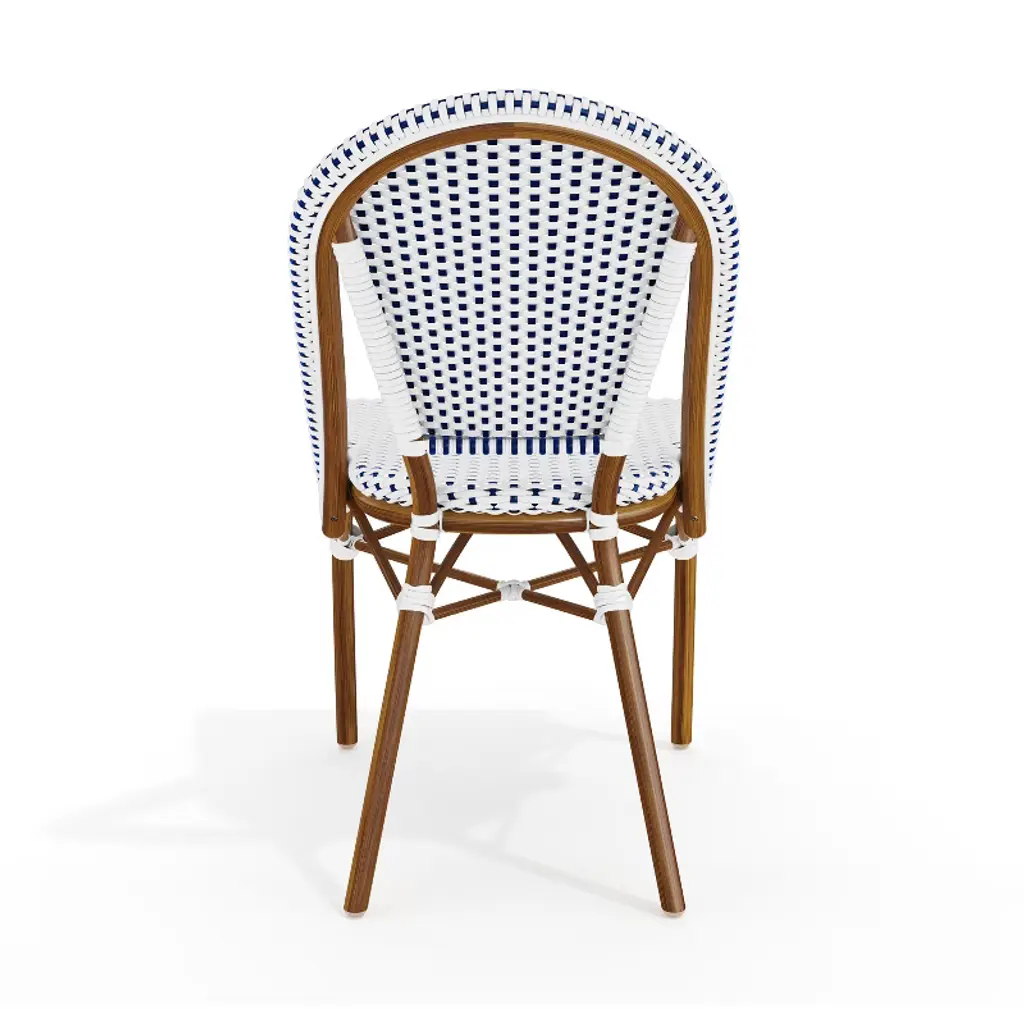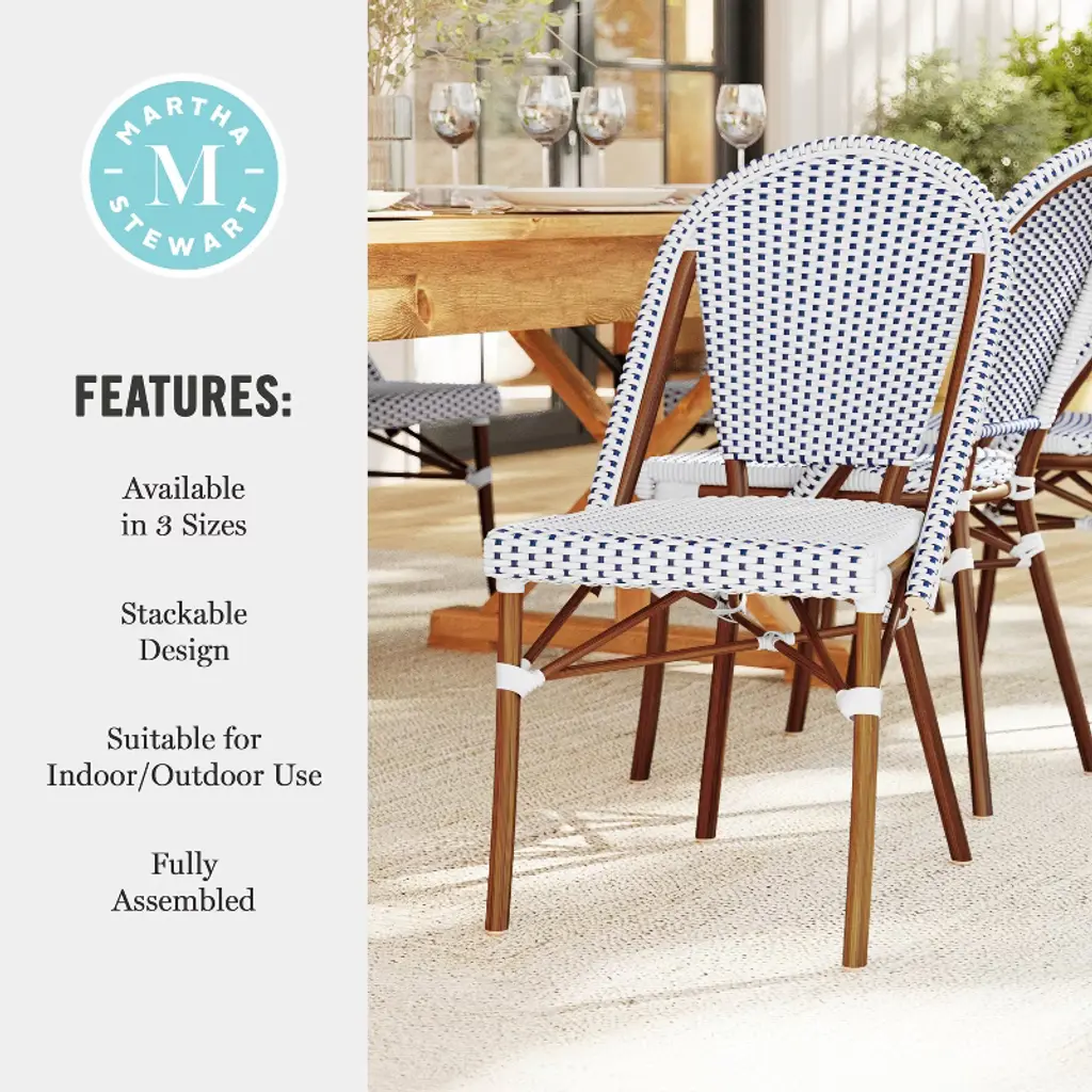Martha Stewart Lily Pond Indoor-outdoor Stackable Bistro Chair With Natural Woodgrain Aluminum Finish Frame And White/navy Woven Rattan Back And Seat