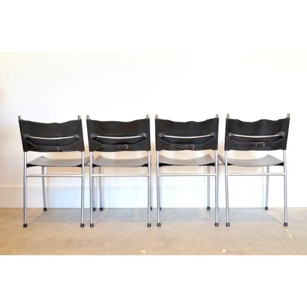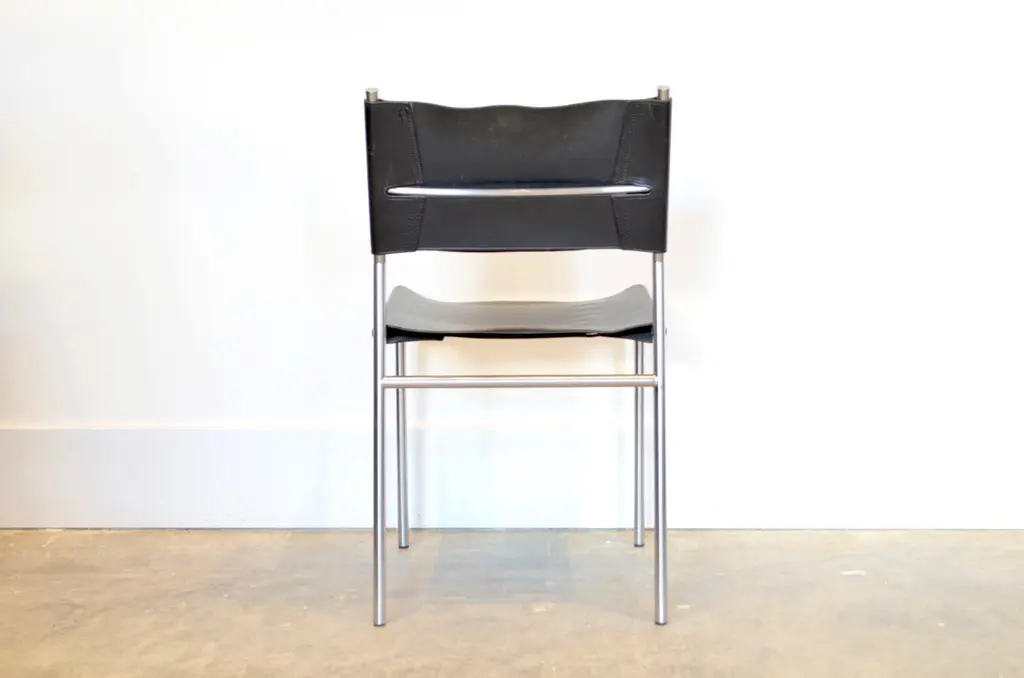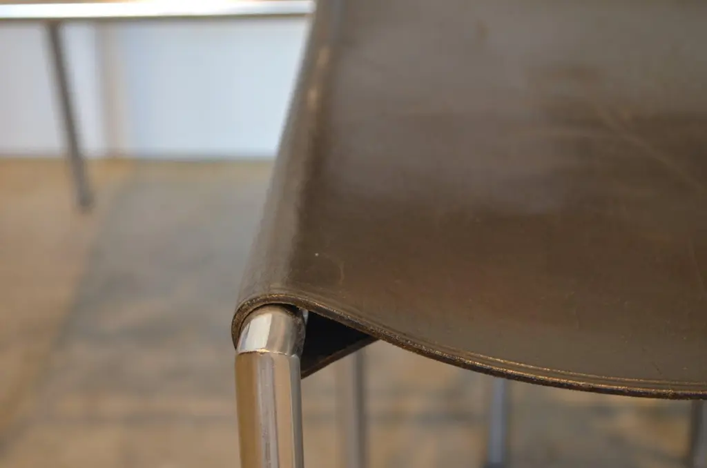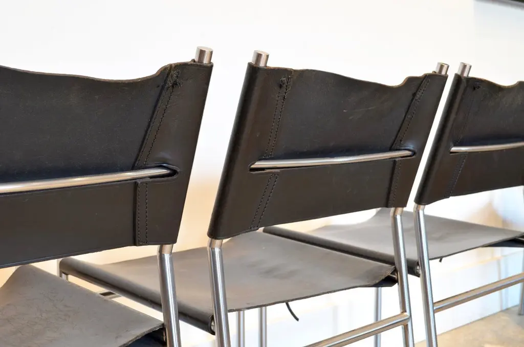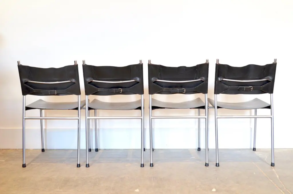 'SE06' style by Martin Visser.Materials: Patinated black leather seat and backs with chrome tubular frames. Approx: 17.5”w x 19.5”d x 30.5”h, seat height: 17.5”h. 2 styles available, additional photos and descriptions available upon request. Character enhanced by patina and wear. Four have black rubber feet and a buckle at the back, the rest have a straight back and straight legs with no rubber feet.