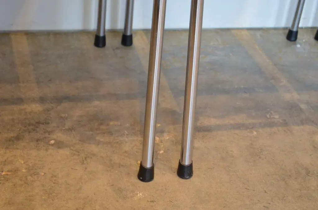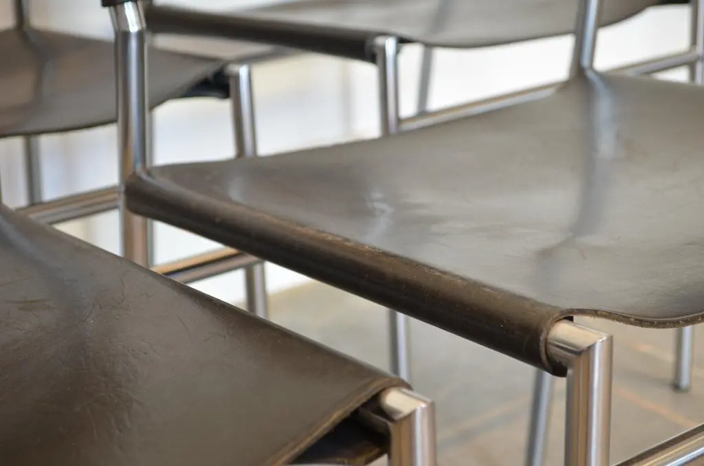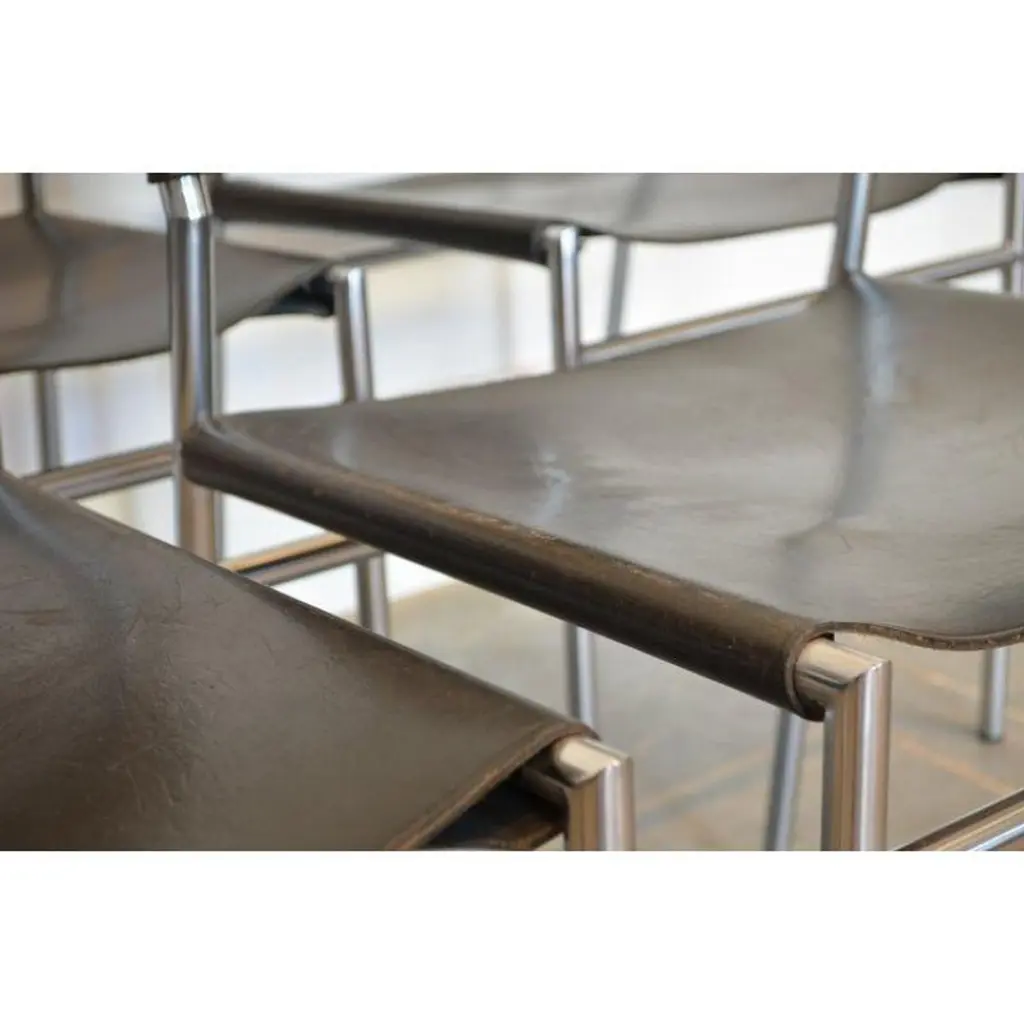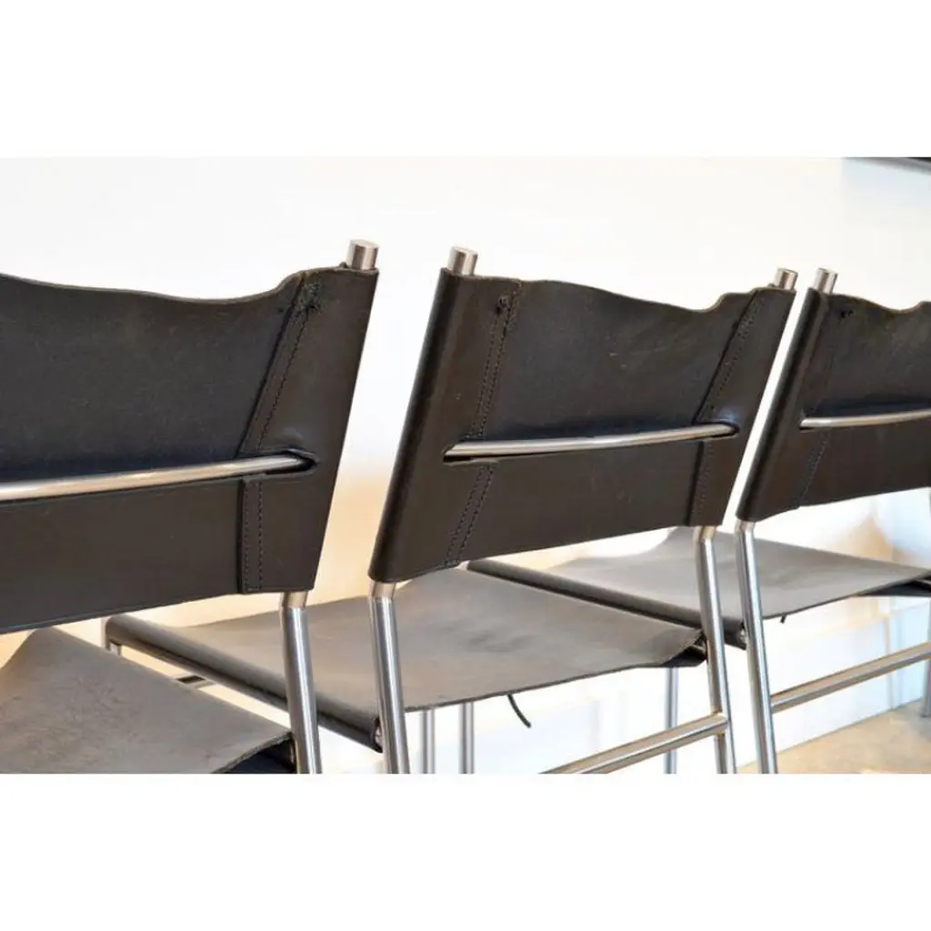 'SE06' style by Martin Visser.Materials: Patinated black leather seat and backs with chrome tubular frames. Approx: 17.5”w x 19.5”d x 30.5”h, seat height: 17.5”h. 2 styles available, additional photos and descriptions available upon request. Character enhanced by patina and wear. Four have black rubber feet and a buckle at the back, the rest have a straight back and straight legs with no rubber feet.
