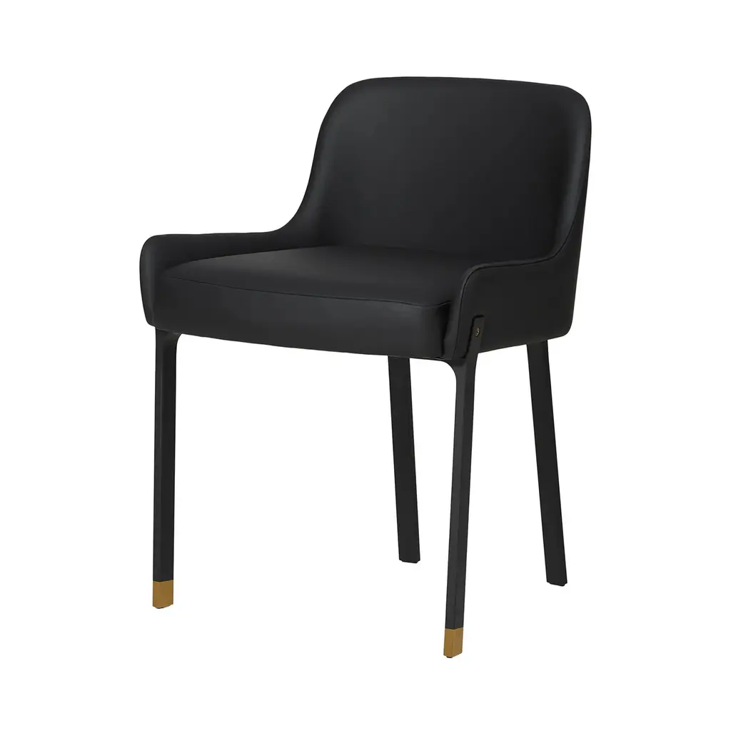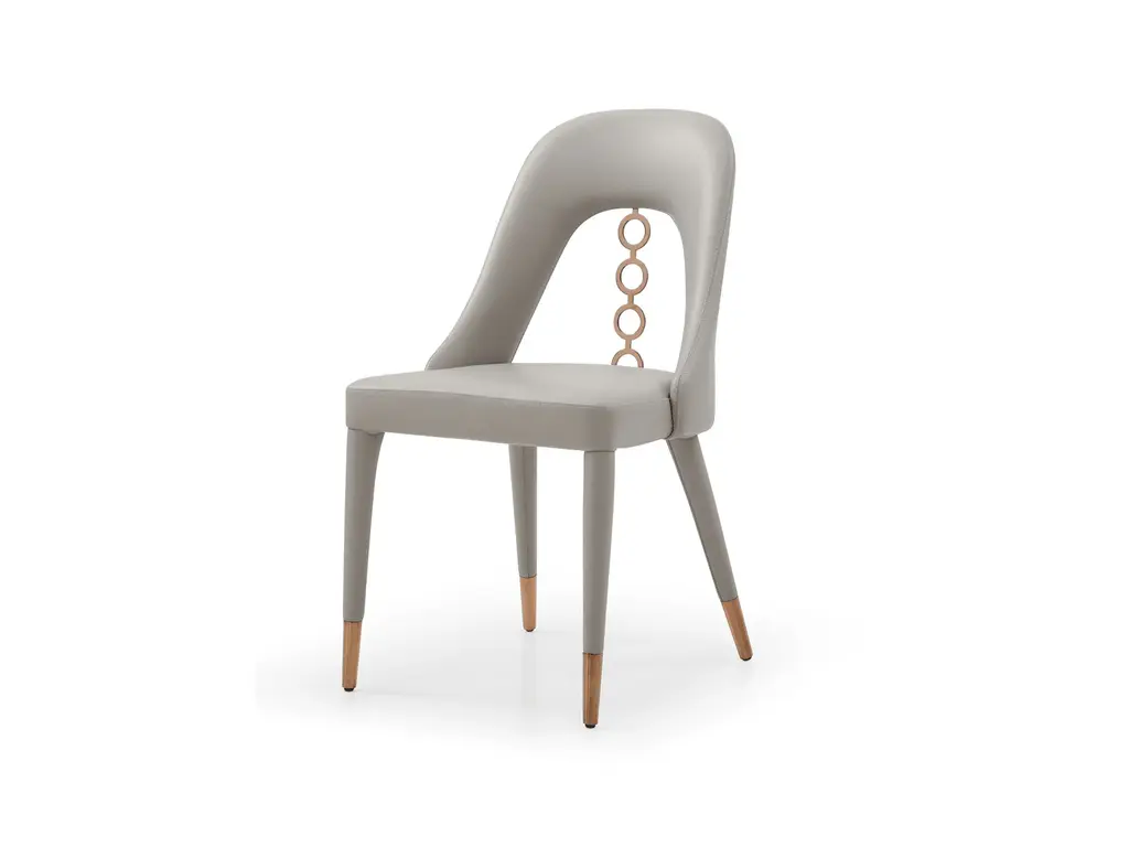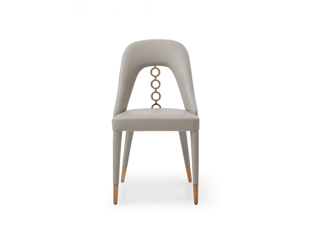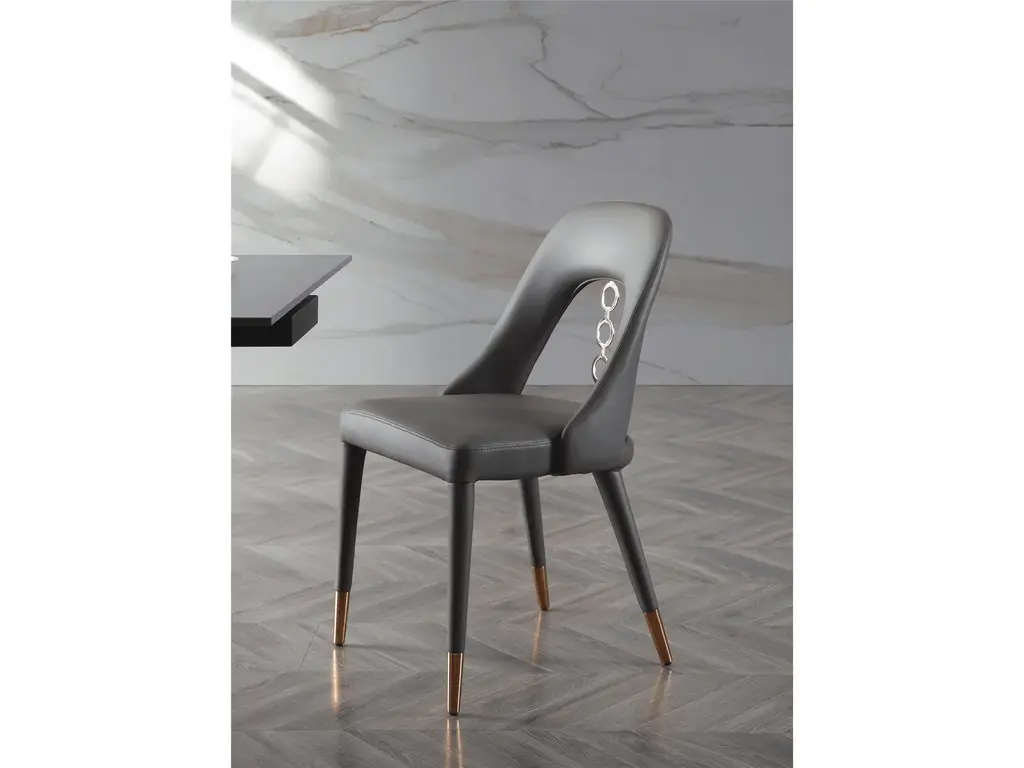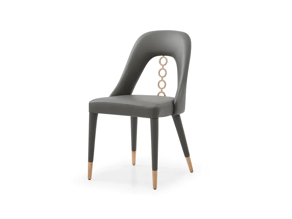Marva Dining Chair, Dark Gray or Light Gray Fully Upholstered Faux Leather with Steel Frame, Feet Caps and 4 Rings on the Back in Rose Gold Stainless Steel.