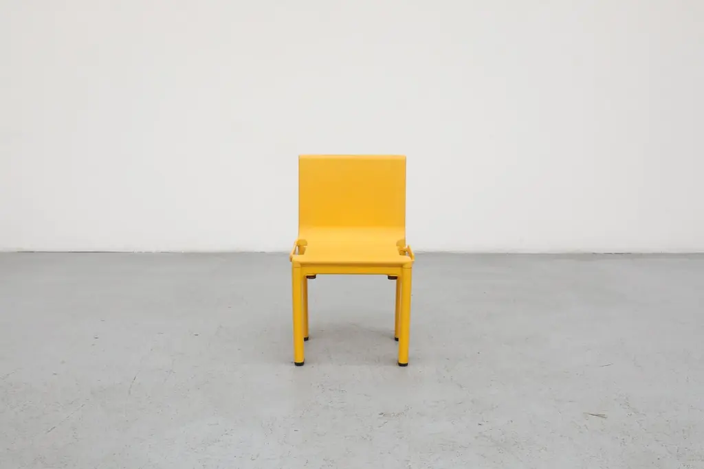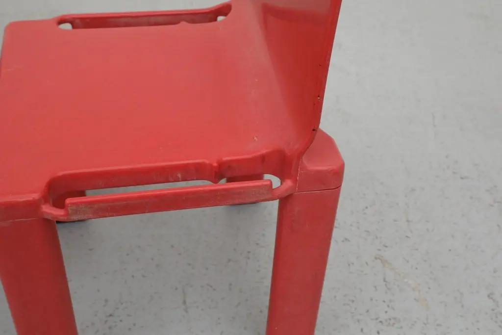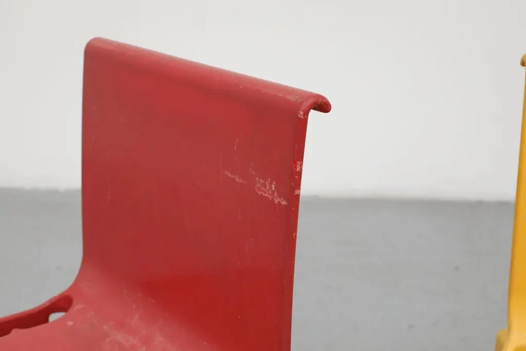 A delightful and highly functional set of "Sistema Scuola" children's chairs, designed by Masayuki Matsukaze for the renowned Italian manufacturer Kartell in the 1970s. These chairs embody Kartell's innovative spirit, leveraging advanced plastic molding techniques to create resilient and visually appealing furniture for educational settings and modern homes.Crafted from durable polypropylene, these chairs were designed with active use in mind. Their robust construction and playful aesthetic are a testament to their original purpose: enduring the rigors of a school environment while inspiring young minds. Each chair is designed to stack, allowing for versatile use and efficient storage. Their compact size makes them perfect for a child's room, a creative play area, or even as a charming accent piece.We love the enduring appeal of these chairs; their vibrant colors – yellow, red, and blue – still pop, bringing a touch of nostalgic charm and bold modernity to any space. These are not just chairs; they are a piece of design history, ready for new adventures. Four chairs are currently available: one yellow, two red, and one blue, and are sold individually.In very original condition with wear and scratching consistent with kids play and use over the ages!