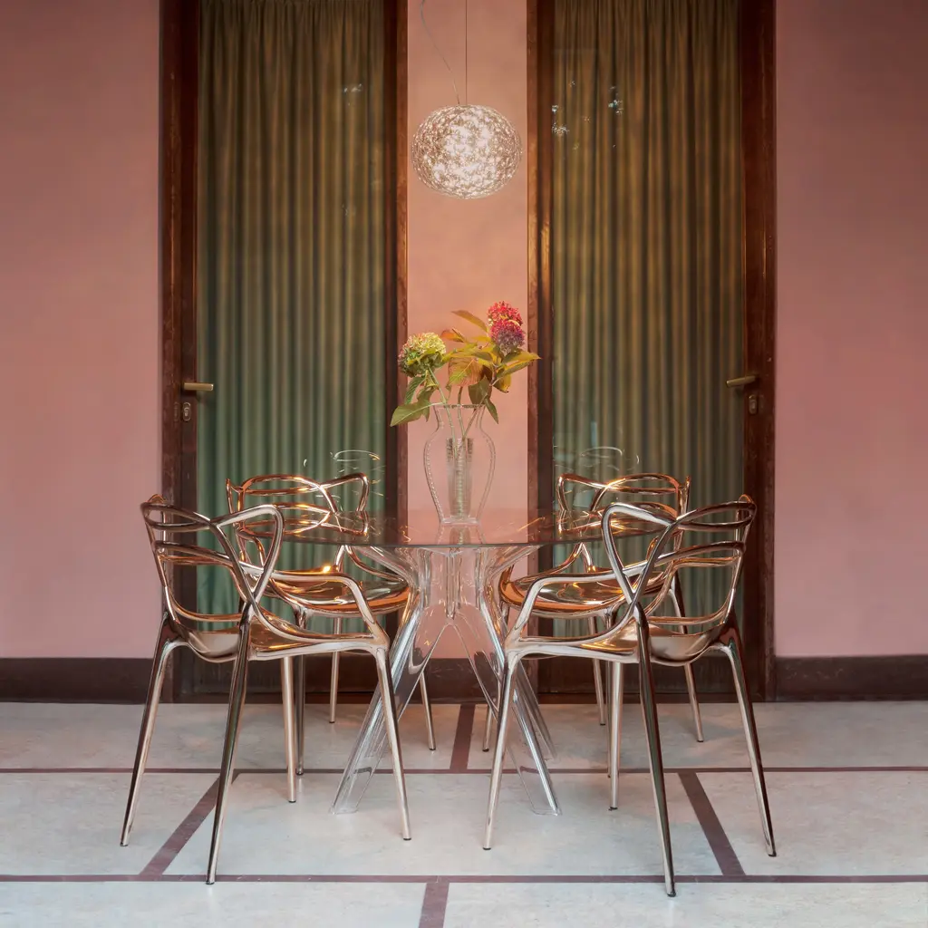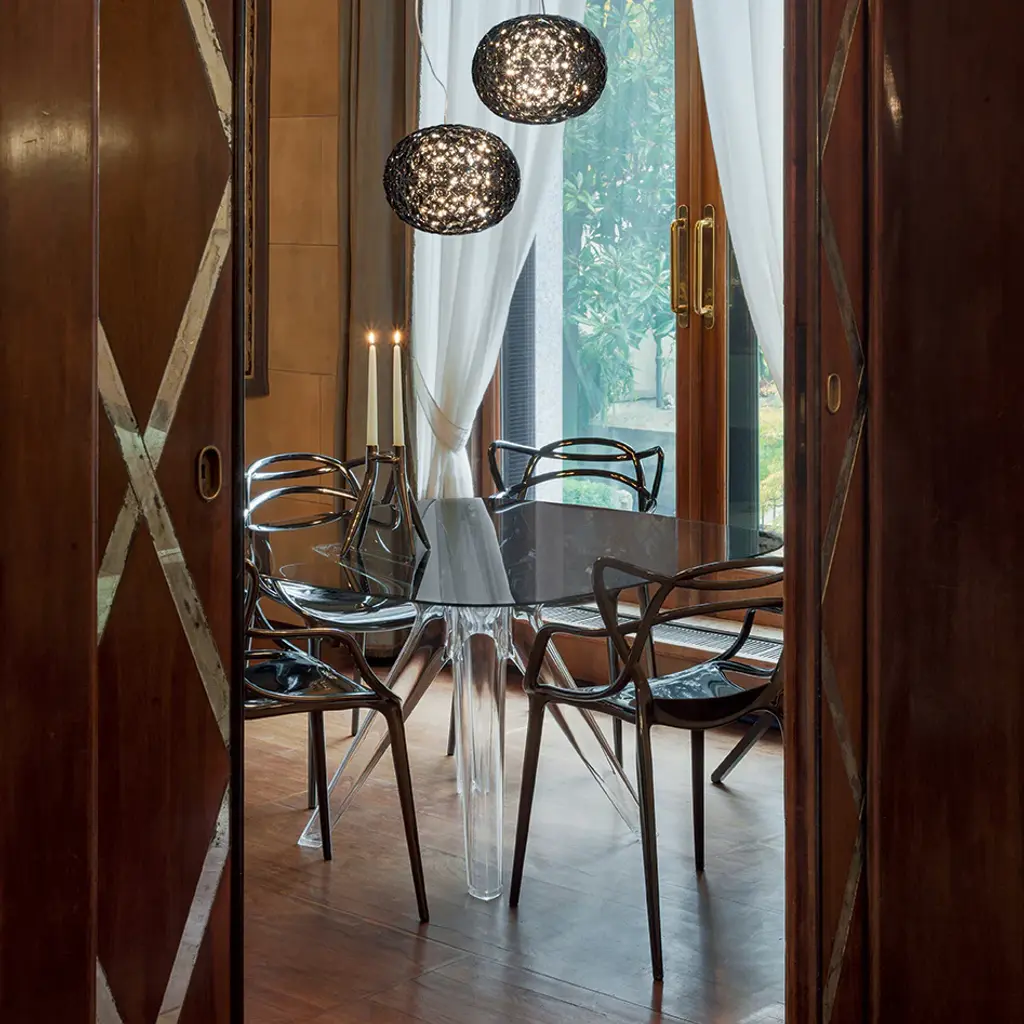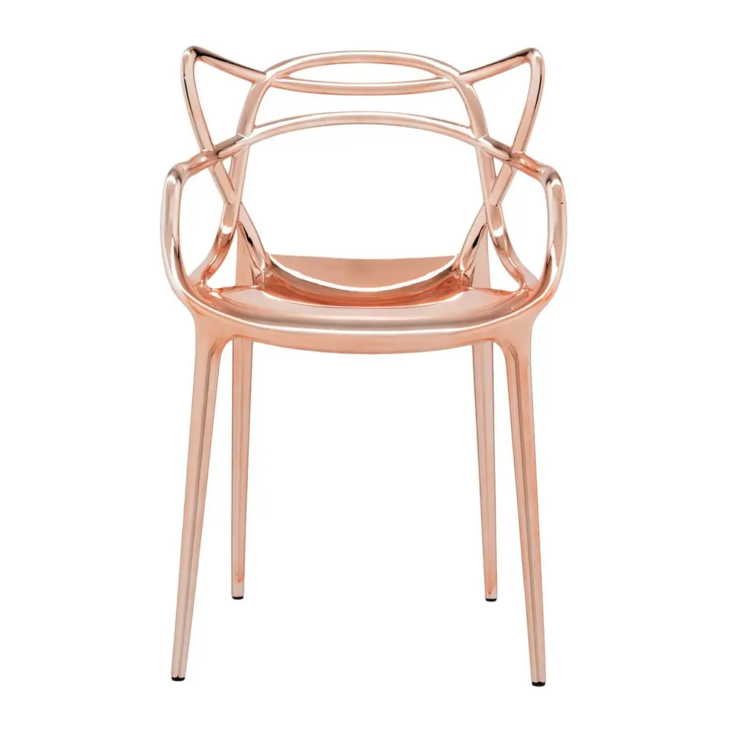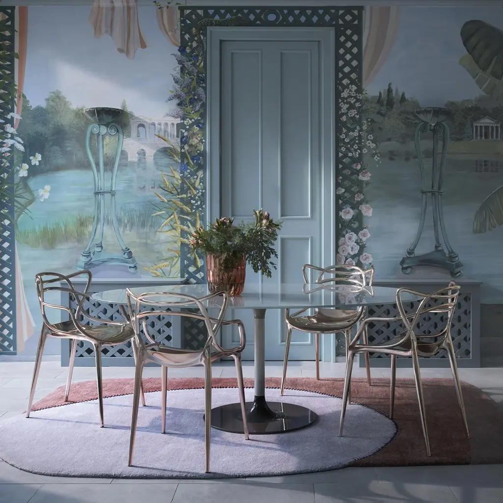 The Masters Metal Arm Chair by Kartell is a powerful tribute to three iconic designs, re-interpreted by the creative genius of Phillipe Starck. The unmistakable silhouettes of "Series 7" by Arne Jacobsen, the "Tulip Armchair" by Eero Saarinen and the "Eiffel Chair" by Charles Eames are interwoven into a modern day icon, through the fusion of original and engaging styles. Light, practical, and eye-catching, this dining chair is ready to be used both indoors and out, and stacked for easy storage when not in use.Highlights