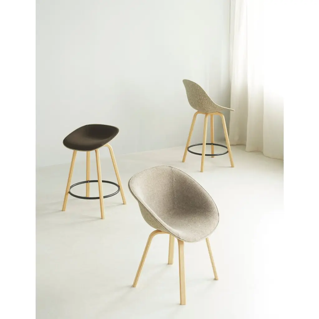 Normann Copenhagen's Mat bar chair features a timeless and clean-lined design. The versatile chair's minimalist look sits effortlessly in various rooms and spaces, from home dining rooms to restaurants and office boardrooms. The bar chair is part of the Mat collection, designed by Foersom & Hiort-Lorenzon. The name of the series, "Mat", stands for "material," reflecting the chair's construction from a groundbreaking blend of hemp and polyester fibers. This material is the outcome of years of research and development, contributing not only to the chair's simple appearance but also to its environmental sustainability. The Mat collection is designed for full recyclability, allowing for the disassembly and repurposing of its components into new products.