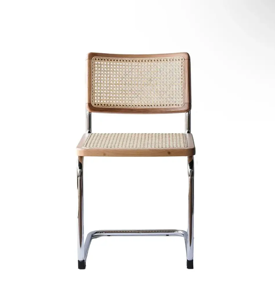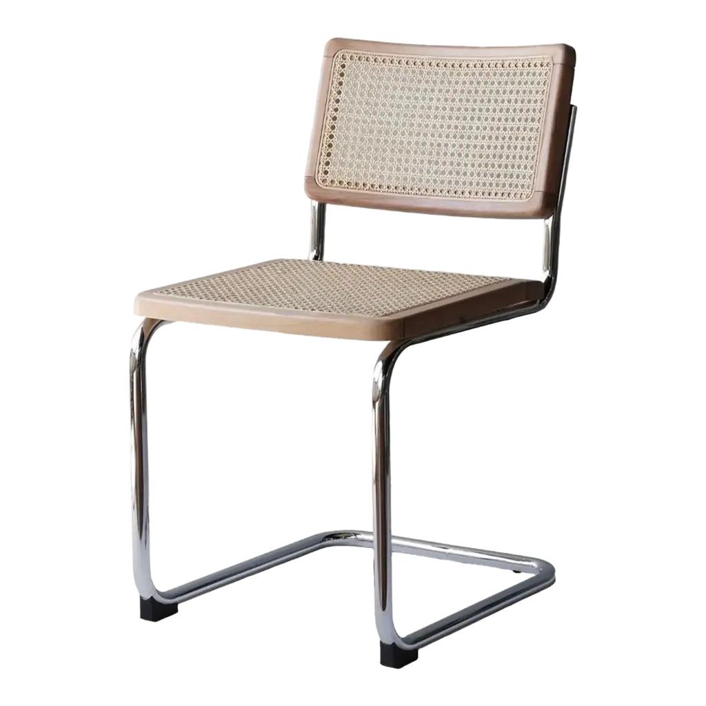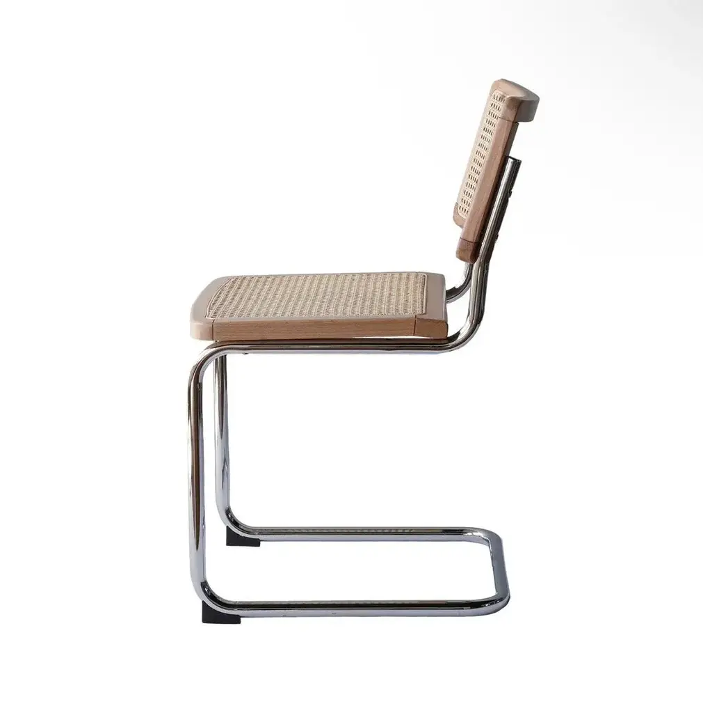 New Special Order Item. The Lena Dining Chair is a reproduction of a classic 1960s floating chair design. The frame is a shiny stainless steel, adorned with a beech-wood-framed, rattan-weave seat and back.