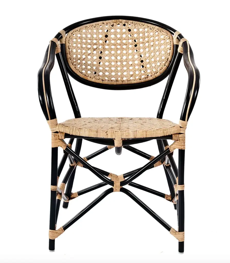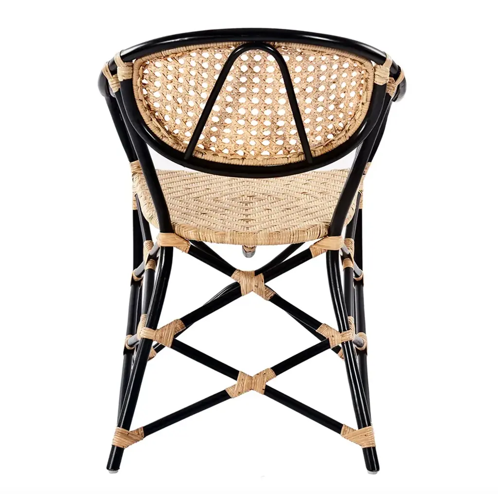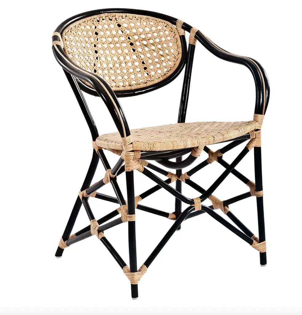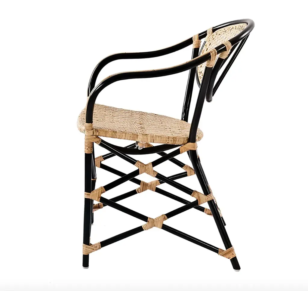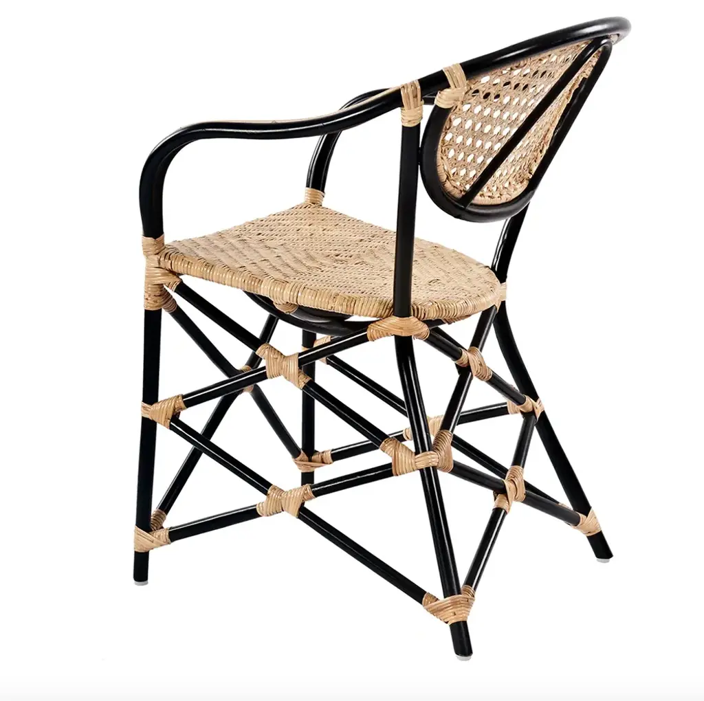 New Item. Crafted from black Bamboo framing and Beige Rattan Weave, the Quay Collection is French Colonial inspired with a modern twist. The construction of each piece of the collection is simple and elegant. The Quay Café Chair offers a European escape and is a dashing stand-alone piece or dining table seat. A lattice-work of black bamboo framing and rattan banding give the base of the Quay Café Chair vibrant appeal. The juxtaposition of the black framing and the earthen-toned rattan seat and back are bold, providing a French Trottoir look. Dimensions: 23'' x 24'' x 31'' Color:Black/Beige Materials: Bamboo/Rattan/Fabric Style: French Colonial, French Trottoir, Modern