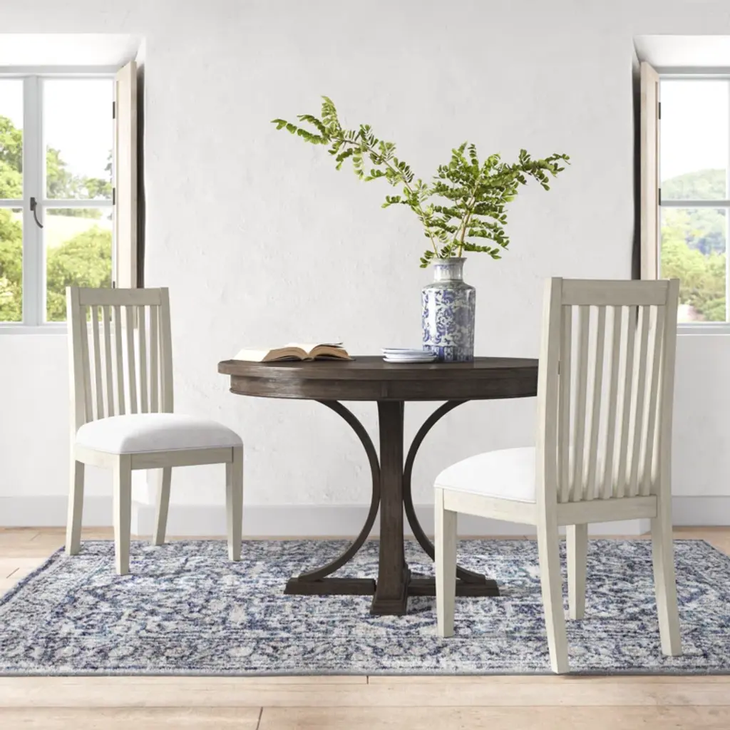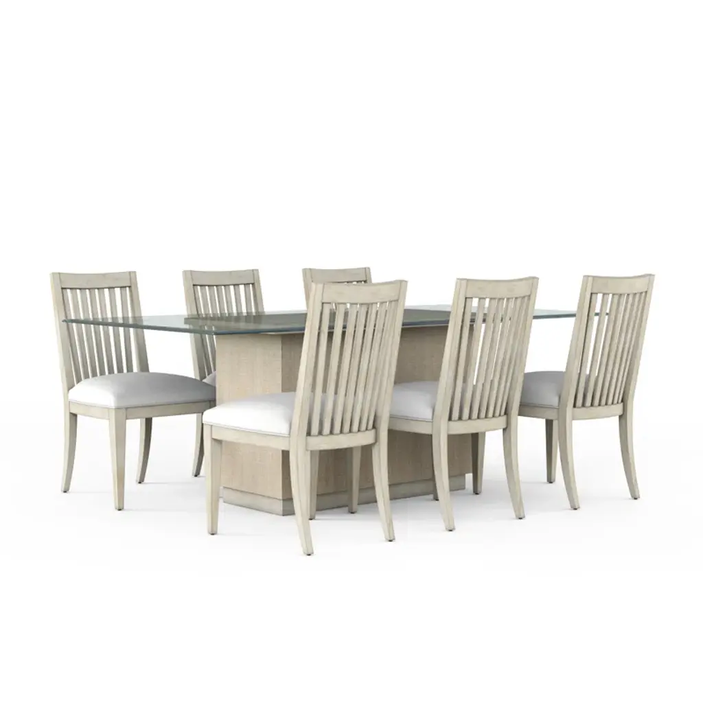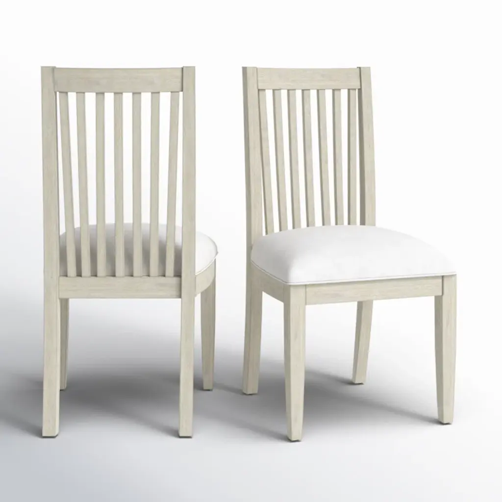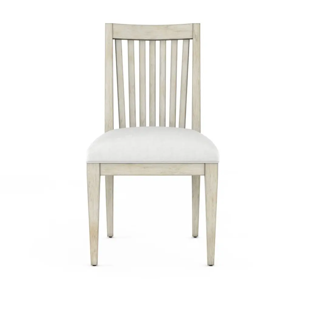 This upholstered dining chair draws inspiration from classic design, from its streamlined spindle back to the elegantly tapered legs with a subtle mid century influence. Crafted from parawood solids and ash veneers in off white shale tone, the chair is comfortably finished with an upholstered seat in finely tailored fabric.