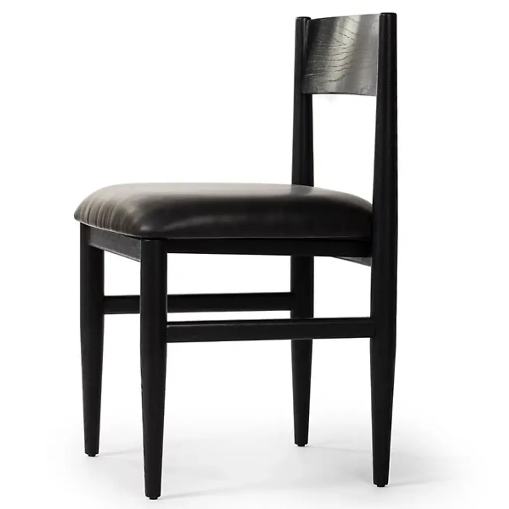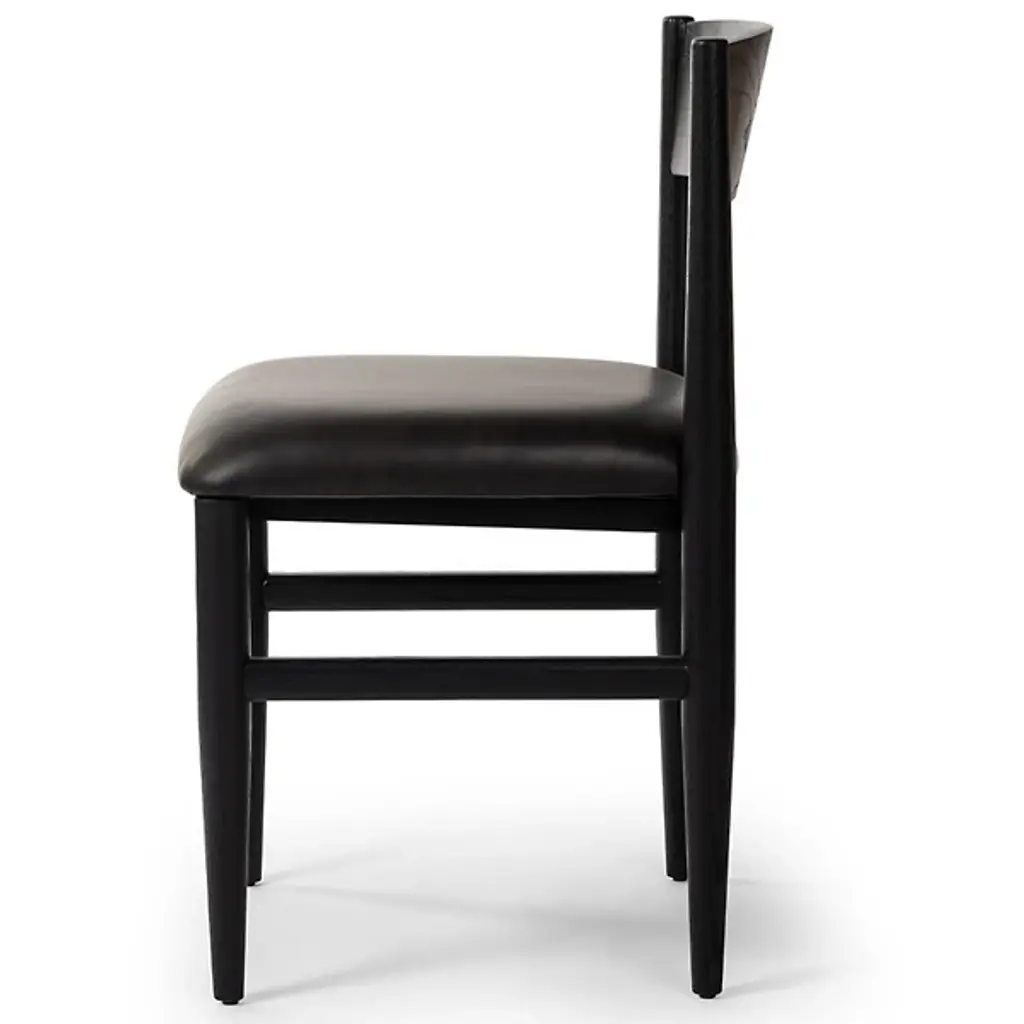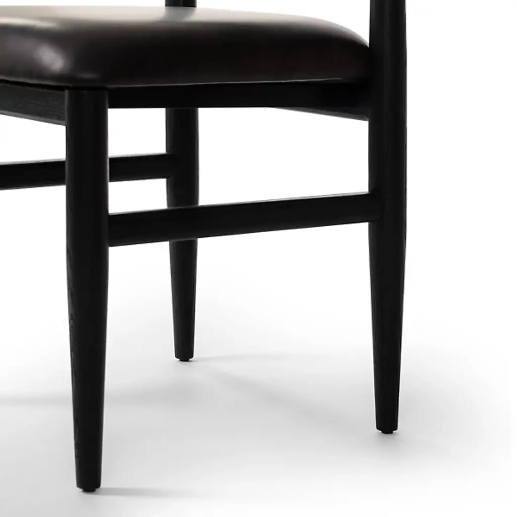 The Mavery Armless Dining Chair from Four Hands blends classic midcentury design with contemporary comfort. Crafted with oak veneer and solid oak, its tapered-leg structure exudes timeless elegance, while the espresso-brown faux leather cushion adds a touch of modern sophistication. With a filling of polyurethane foam and Dacron, this chair offers plush comfort for extended dining sessions. Combining Mid-Century Modern and Contemporary styles, the Mavery Dining Chair brings style and comfort to any dining space with its monochromatic aesthetic and inviting silhouette.
