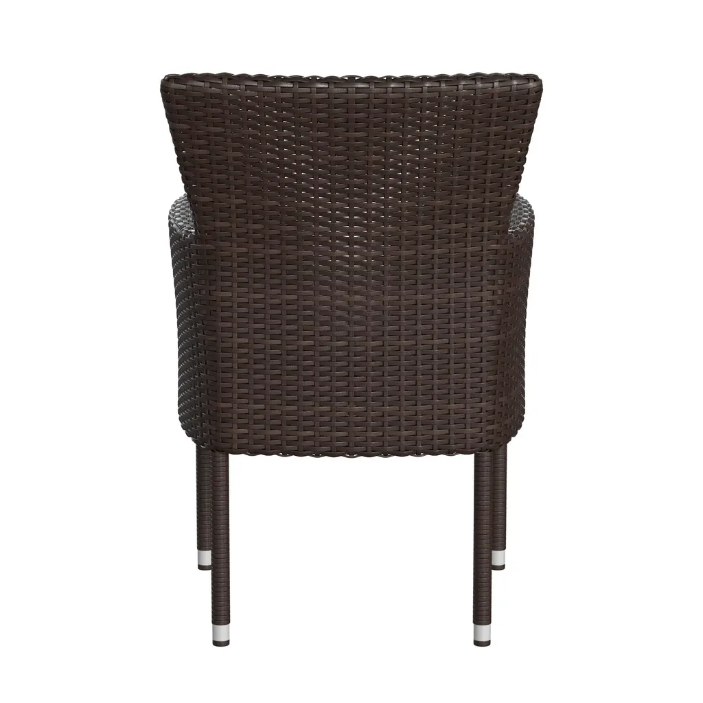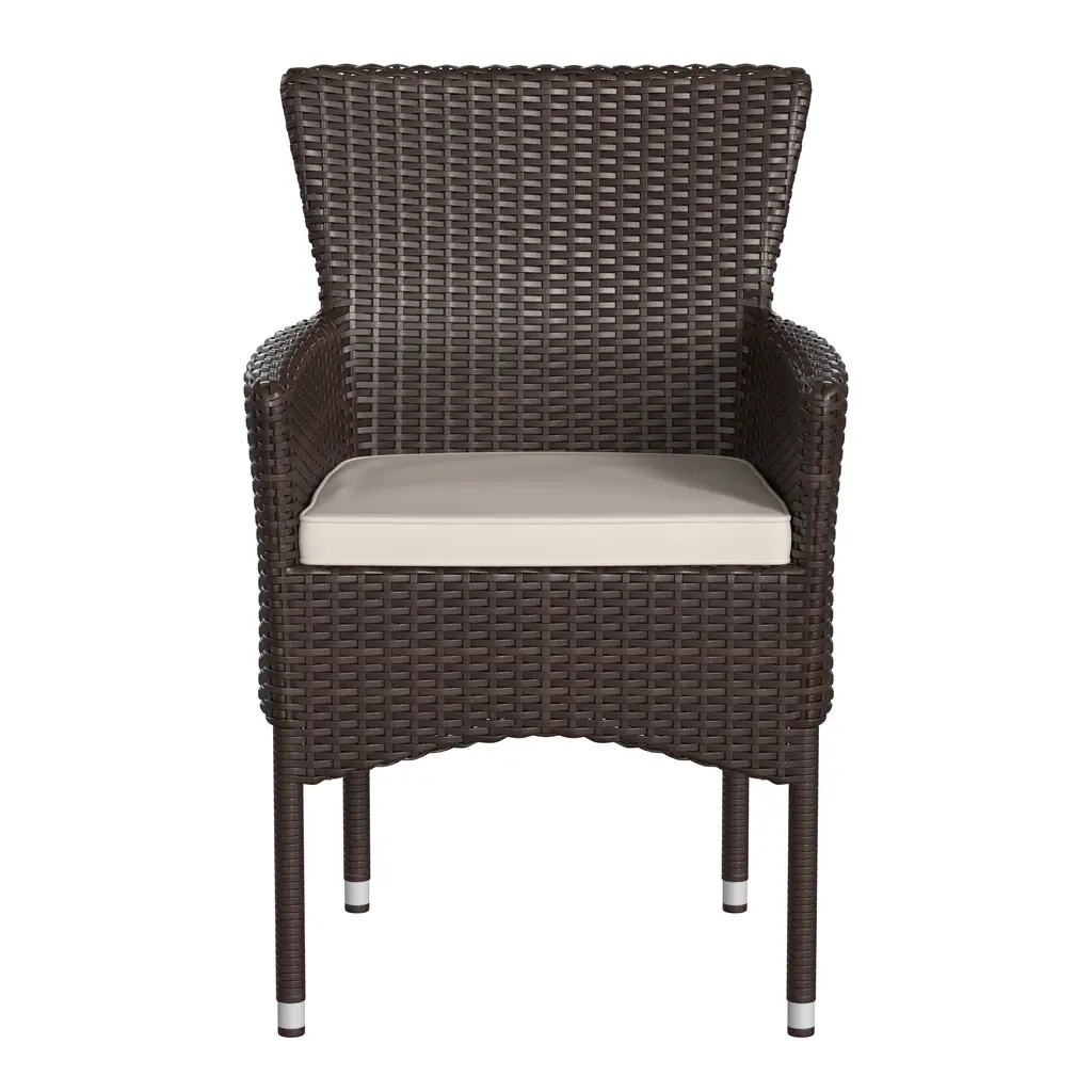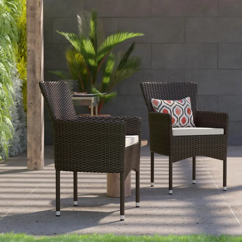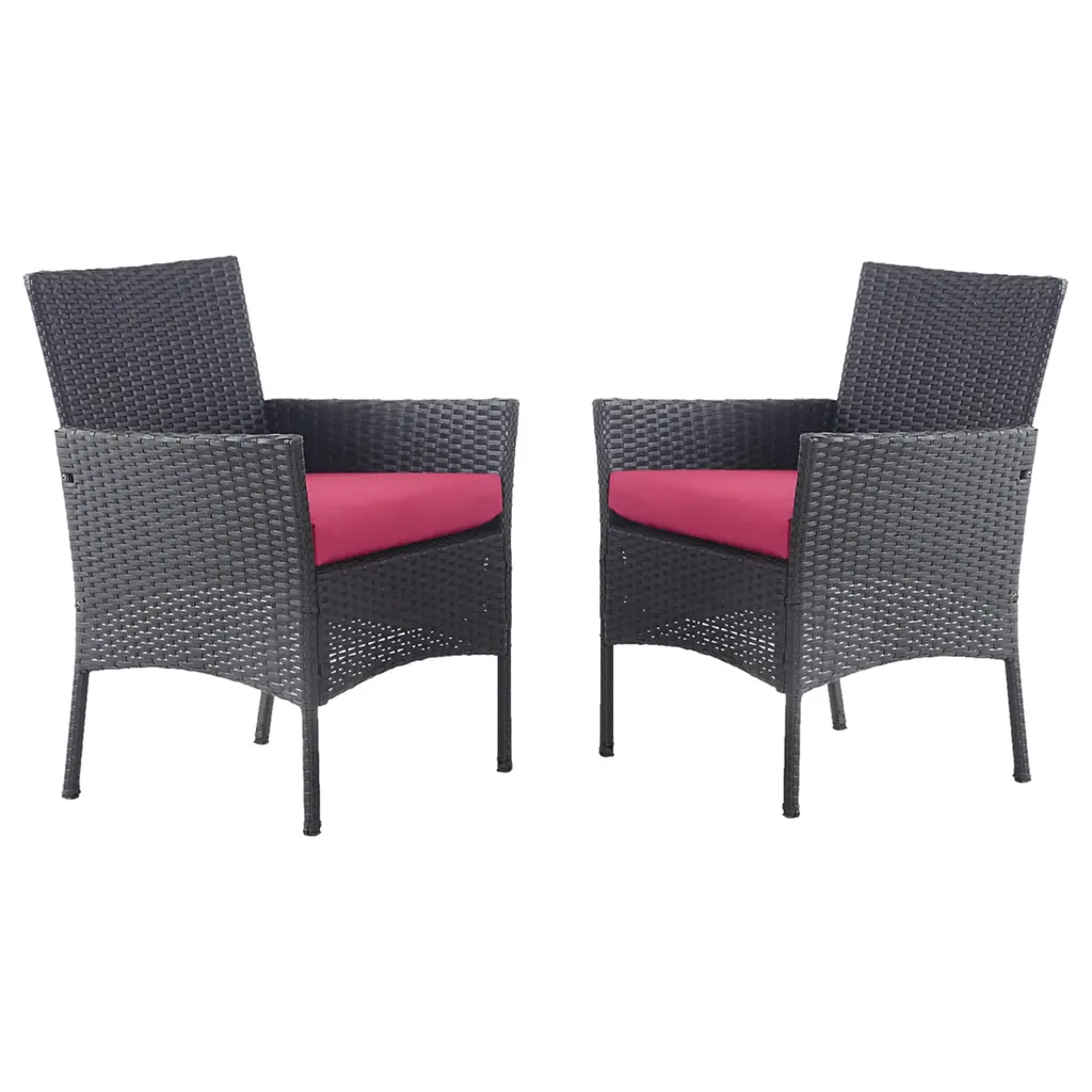 Relax in effortless comfort and style in this set of 2 wicker patio chairs with included plush high density foam cushions. A comfortably curved back gives extra support for lounging while the integrated armrests relieve tension from the neck and shoulders for truly restful seating. Featuring frames and cushions constructed from premium fade and weather-resistant materials, these backyard chairs are made to endure season after season and look just great whether they are used inside or outside. The powder coated steel frames are wrapped in polyethylene wicker, hold up to 350 lbs. static weight, and easily wipe clean with a damp cloth so you can spend more time sitting than cleaning. With no assembly required and a versatile design, these chairs are ideal for the backyard, sunroom, or even your dining room.