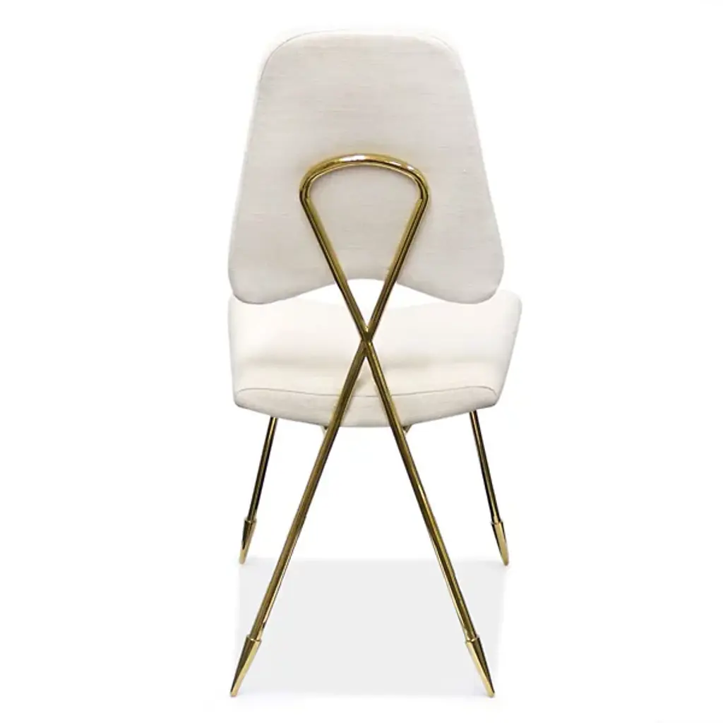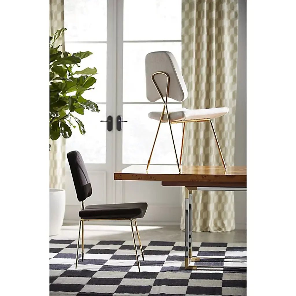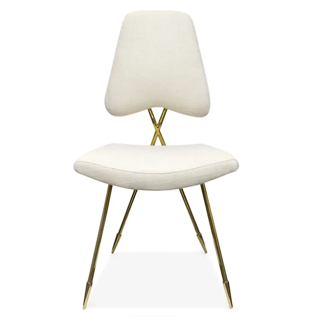 Minimalist and marvelously stylish, the Maxime Dining Chair from Jonathan Adler Brass is designed to look as good from the rear as it does from the front, taking its place in your indoor living spaces as both a robust seat and art installation. A Jonathan Adler design using the principle “If your heirs won’t fight over it, we won’t make it.” Four slender brass legs with pointed sabot tips angle up to a comfortable cushion and back upholstered in Belgian Stone Linen, while a looped back provides a stylish contrast.