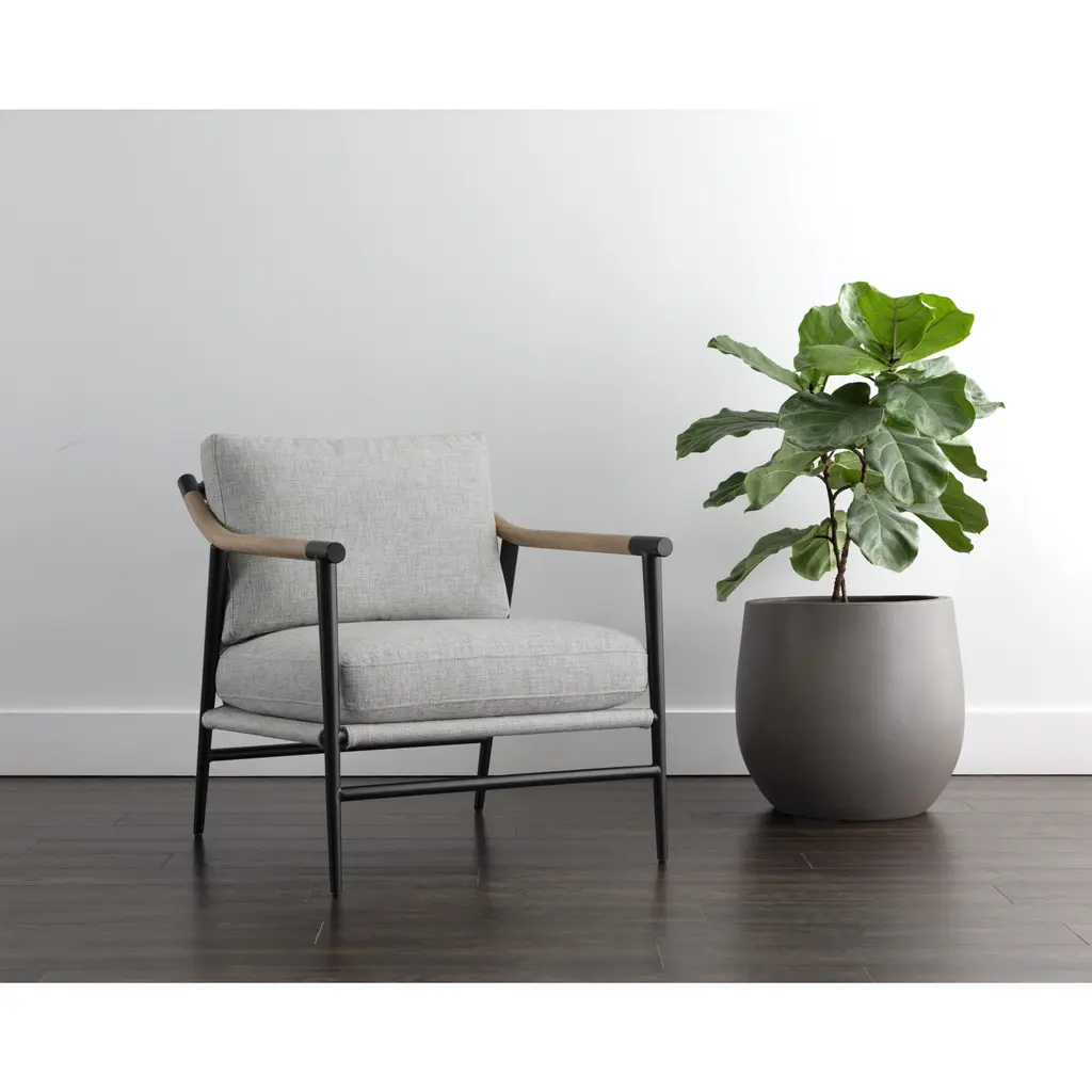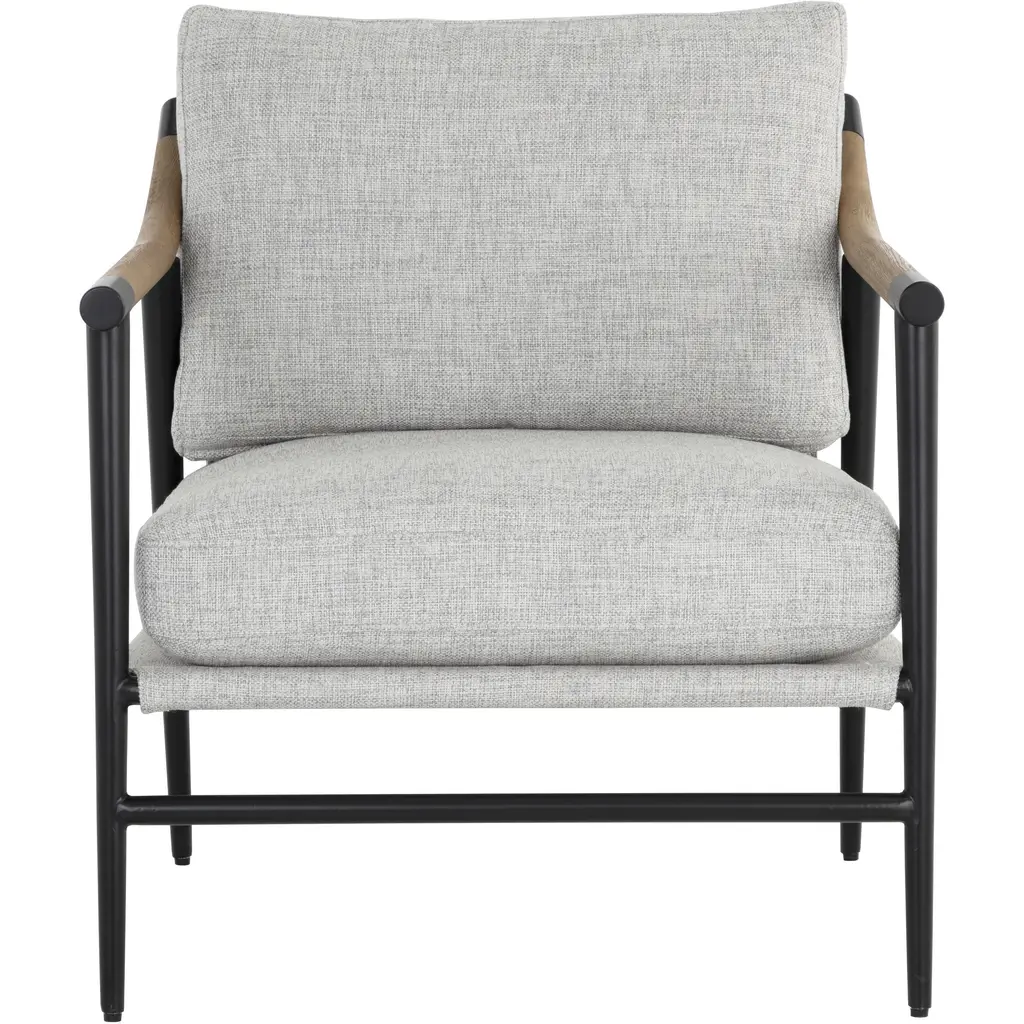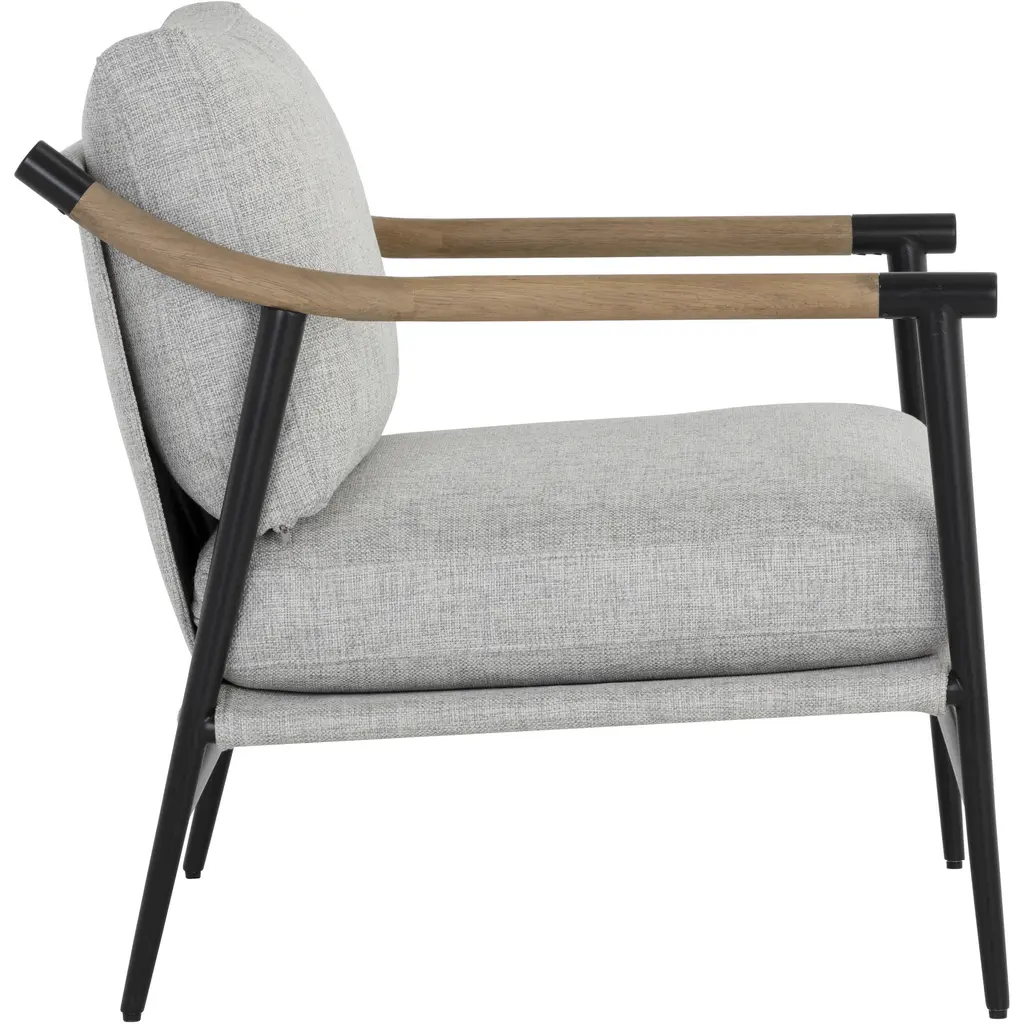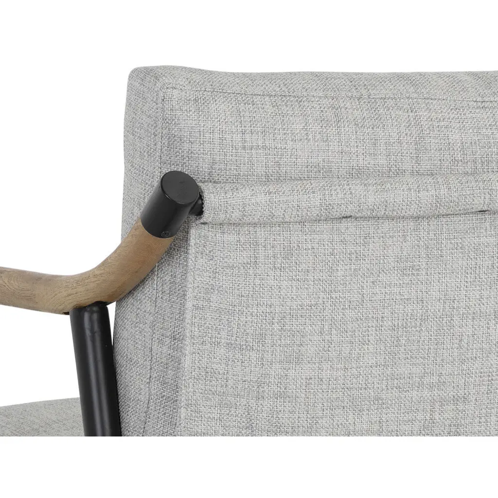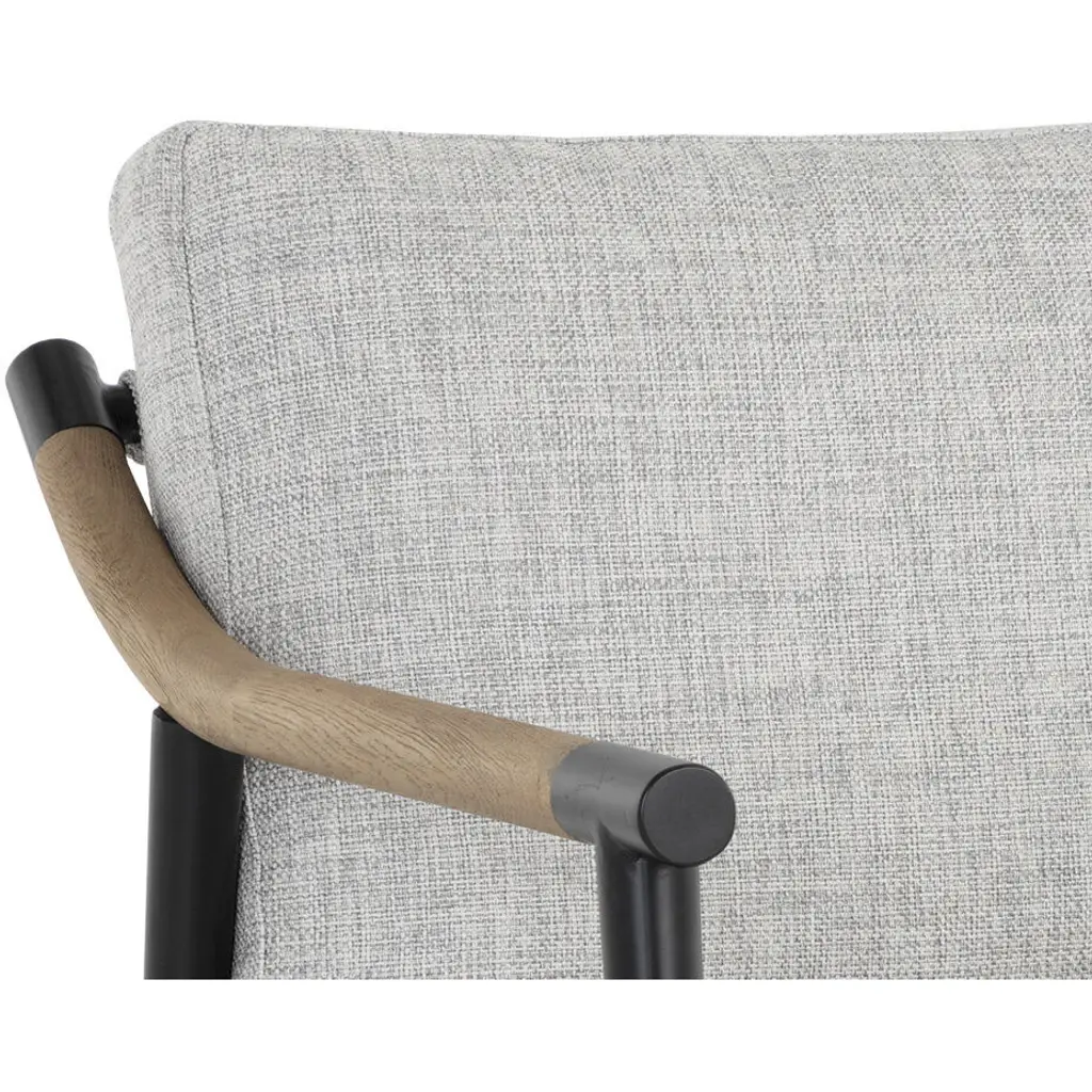 Functional with a timeless design, this mid-century style lounge chair offers a clean silhouette that will suit any space. Stocked in vault fog performance fabric with solid oak wood armrests. Completed with a black iron frame. Also available in a counter stool and dining armchair version. Performance fabric is moisture repellant, stain resistant and easy to clean. As wood is an organic, porous material, these pieces will contain natural variations of texture and may also exhibit fine indentations and cracks. Wood pieces will also display a disparity of colour and grain, and visible knots and burls that add to the character of each piece.