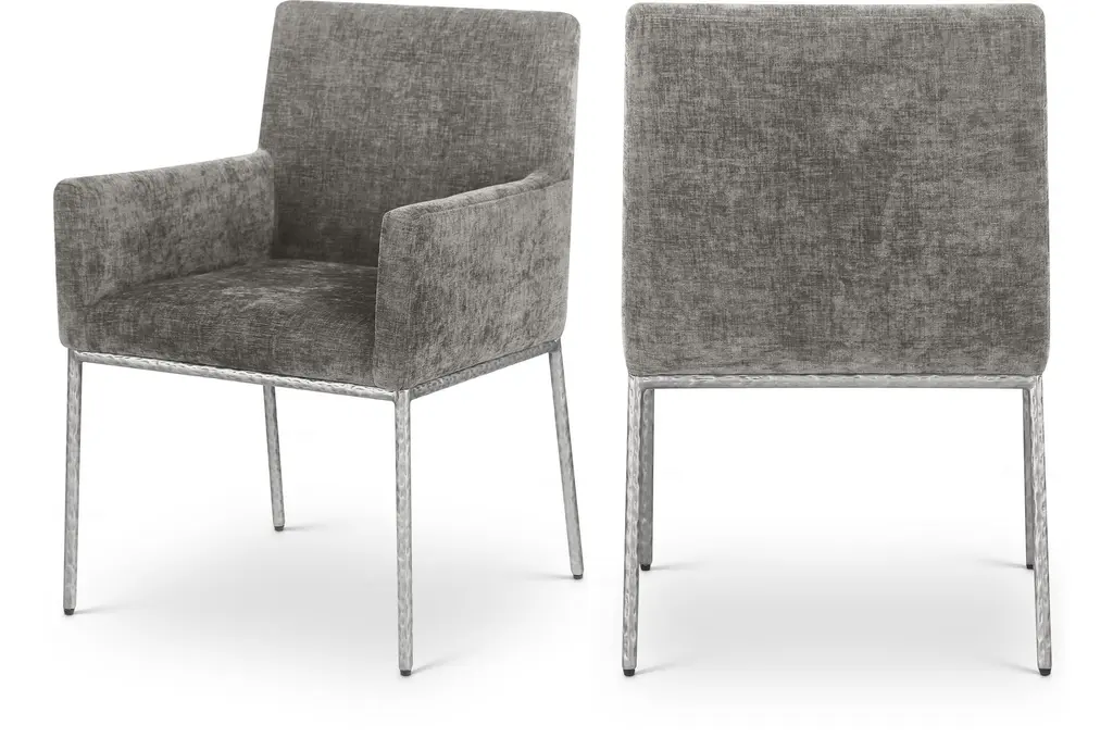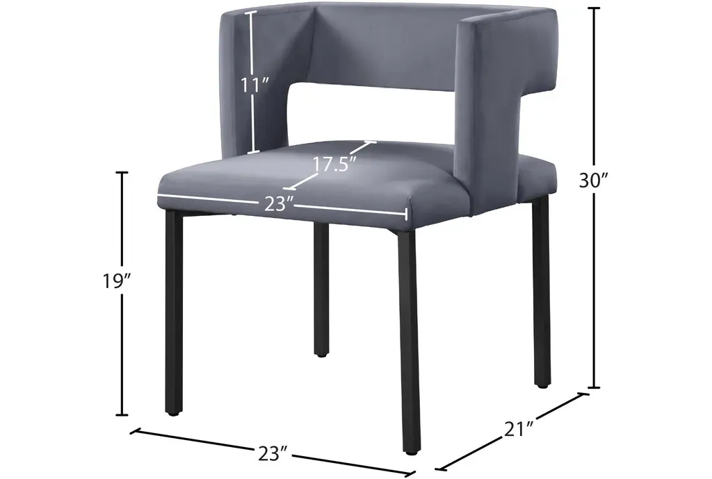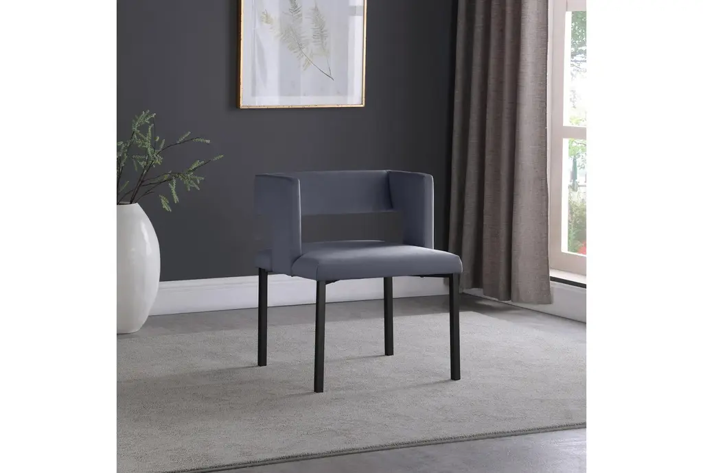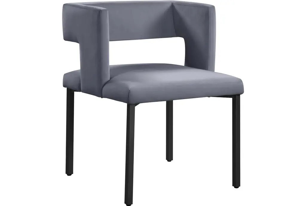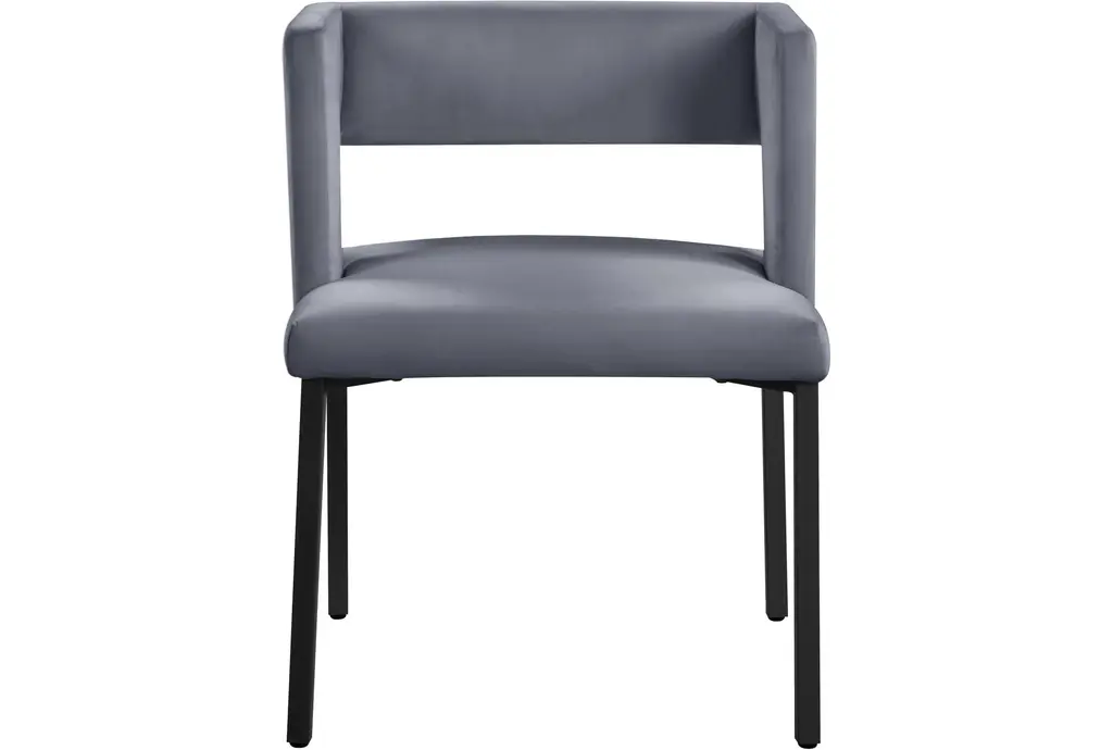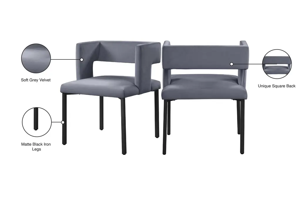 The Meleb grey velvet dining chair set brings a touch of modern style to your dining room or kitchen. Upholstered in soft grey velvet, these armless chairs feature a matte black leg frame that complements the contemporary design. Perfect for any dining space, the set provides both comfort and chic aesthetics.