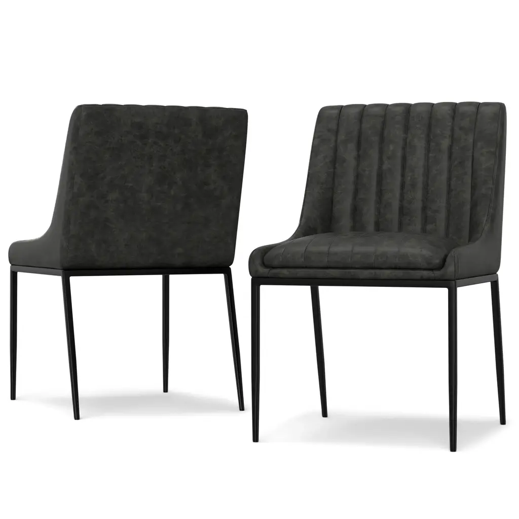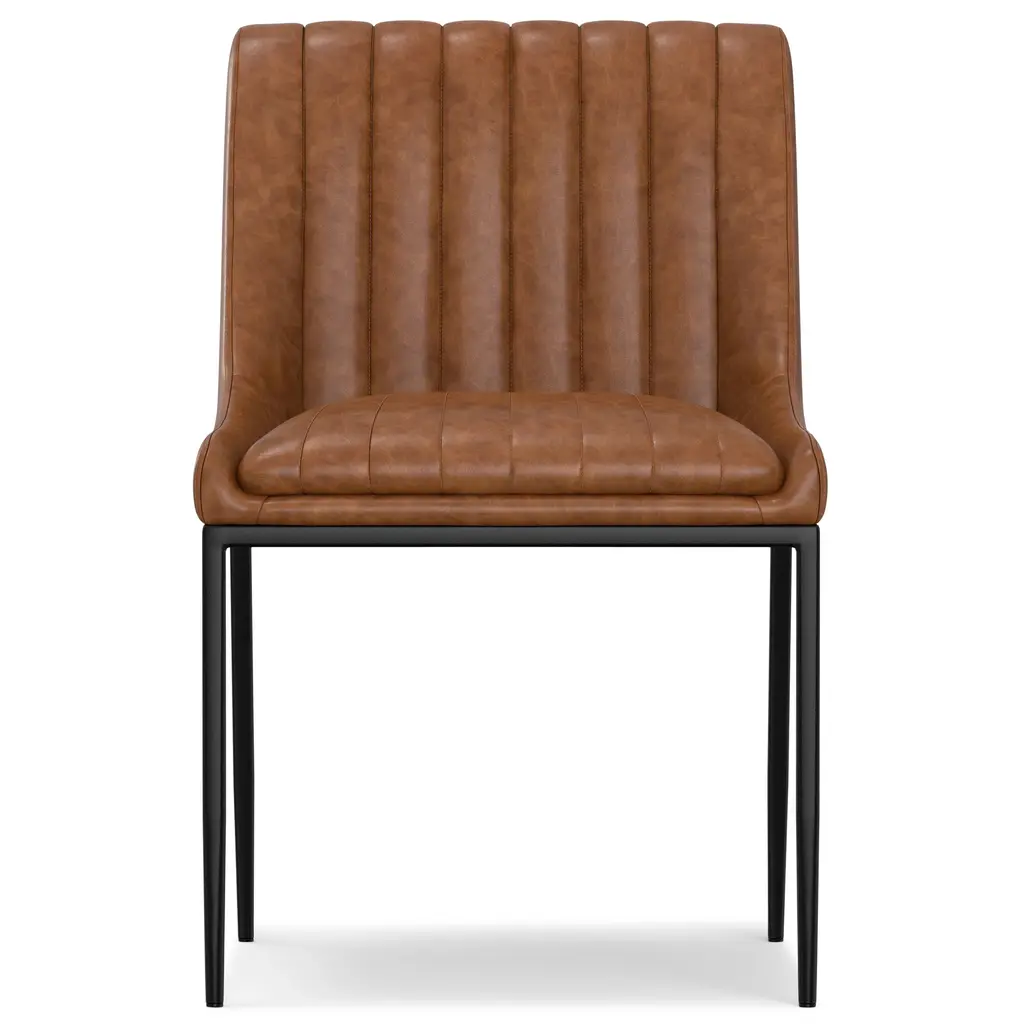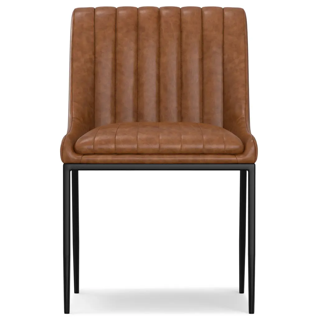 Set of 2 dining chairs upholstered in distressed tan vegan leather fabric for a rich, textured aesthetic.. Vertical channel tufting enhances the chair’s modern, elegant design.. High-density foam seat provides superior comfort for extended use.. Sturdy black powder-coated metal frame ensures lasting durability.. Versatile design ideal for dining rooms, home offices, or accent seating.. Compact size complements various table shapes and room layouts.. Easy assembly with clear instructions and hardware provided; minimal tools required.