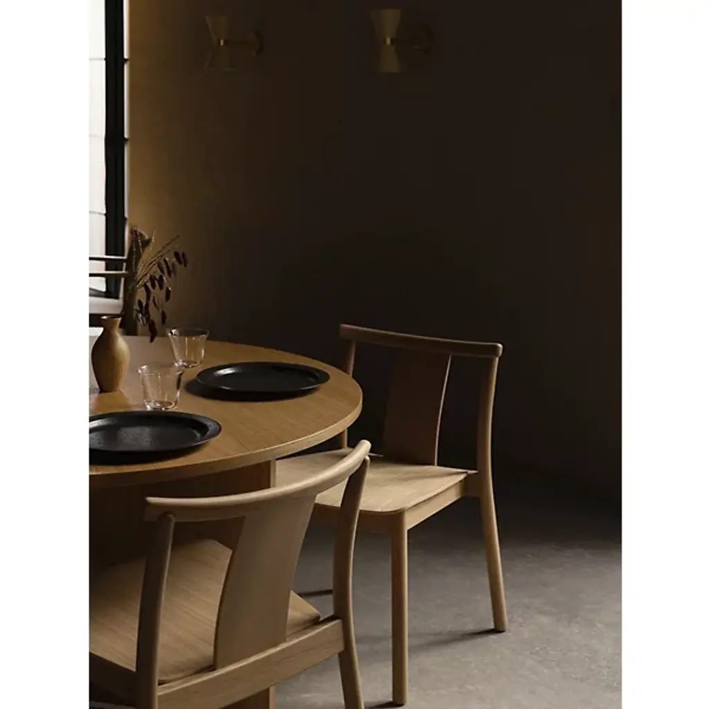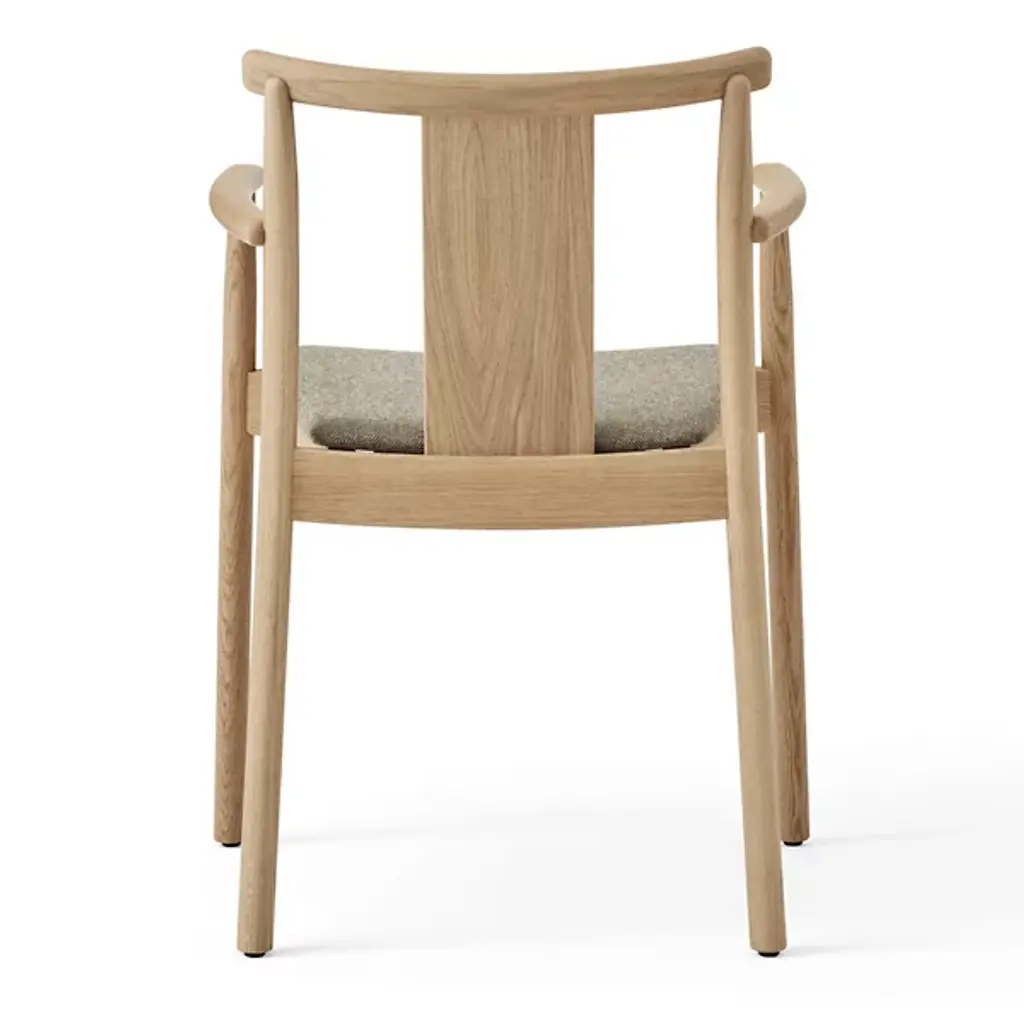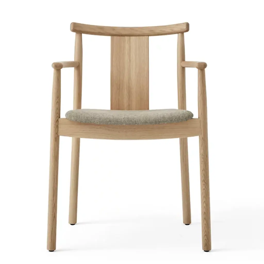 Enhance interior gathering spaces with the Merkur Dining Armchair from Audo Copenhagen. A subtle mix of contemporary smoothness and Scandinavian simplicity, it’s designed by Skogstad & Wærnes for the Oslo Stock Exchange, one of Norway’s iconic constructions, a stately reinterpretation of the modern dining chair. Traditional woodworking joins smooth, slender legs of solid oak with a plywood back, upholstered with a soft, curving cushion that contrasts with the raw woodgrain of the seat and seat back.