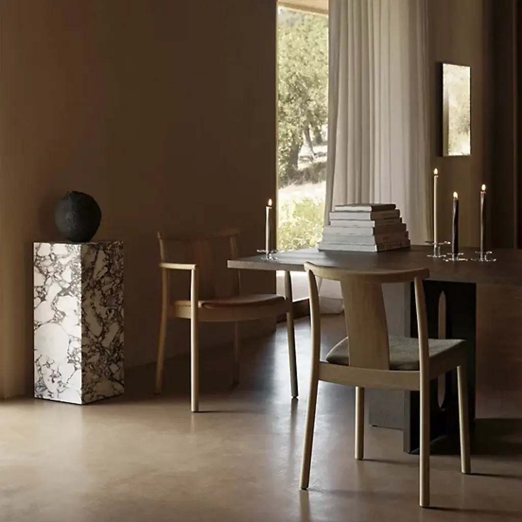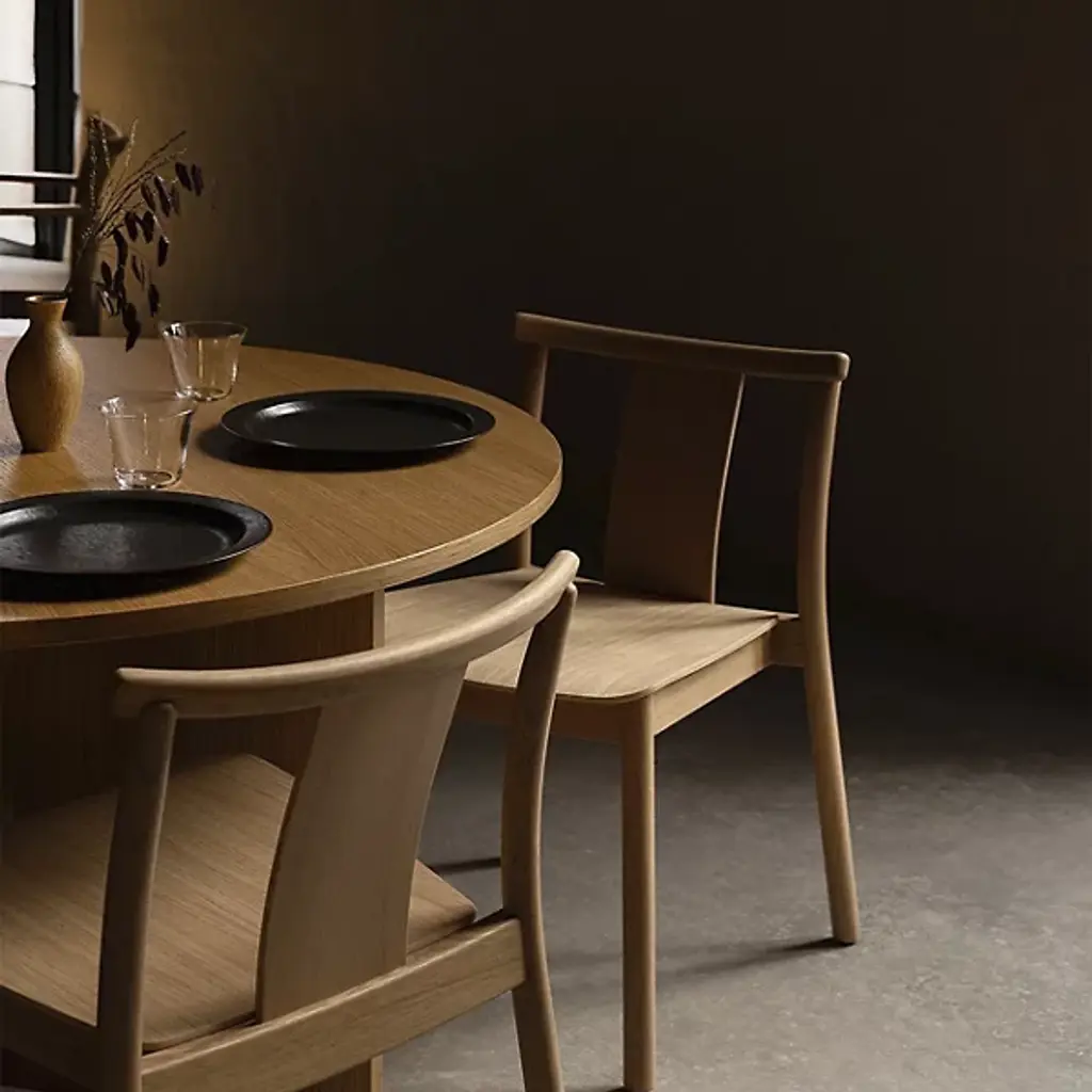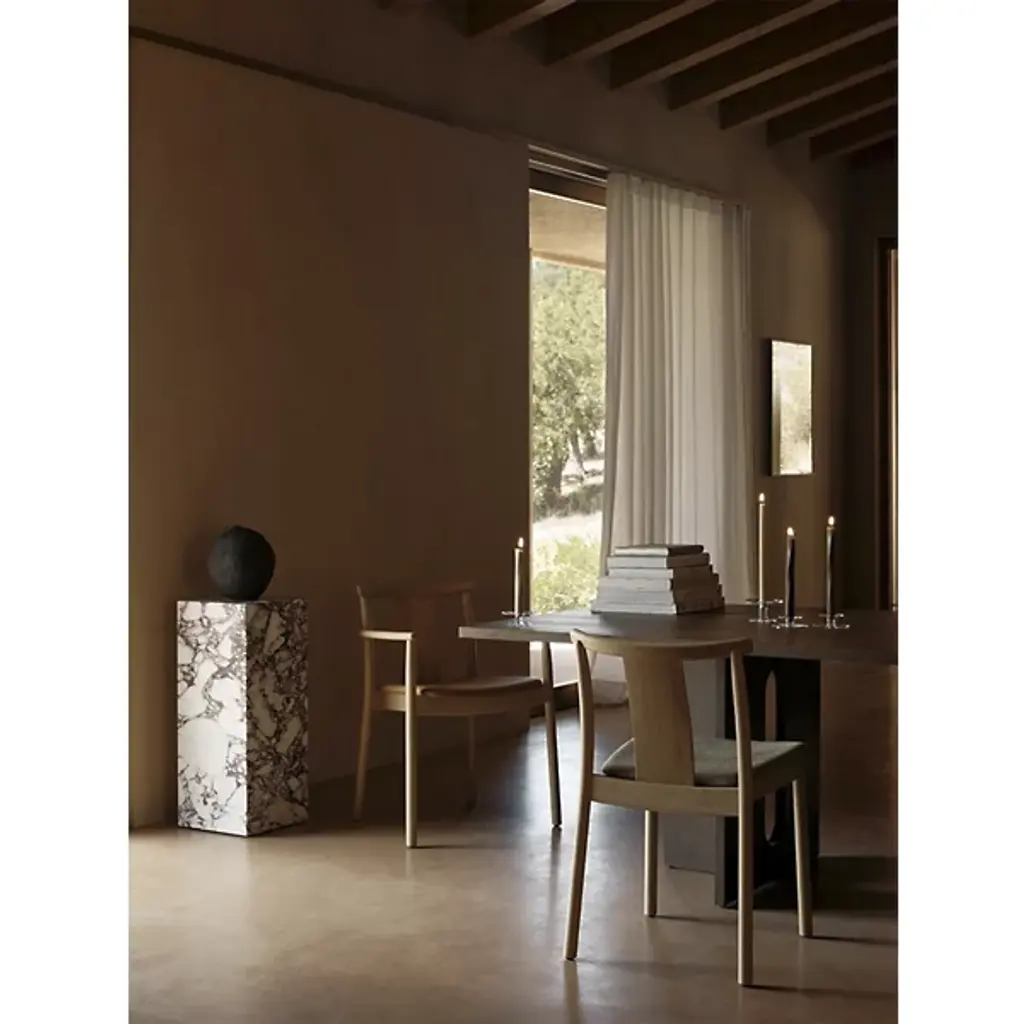 Enhance interior gathering spaces with the Merkur Dining Armchair from Audo Copenhagen. A subtle mix of contemporary smoothness and Scandinavian simplicity, it’s designed by Skogstad & Wærnes for the Oslo Stock Exchange, one of Norway’s iconic constructions, a stately reinterpretation of the modern dining chair. Traditional woodworking joins smooth, slender legs of solid oak with a plywood back, upholstered with a soft, curving cushion that contrasts with the raw woodgrain of the seat and seat back.