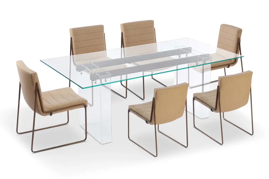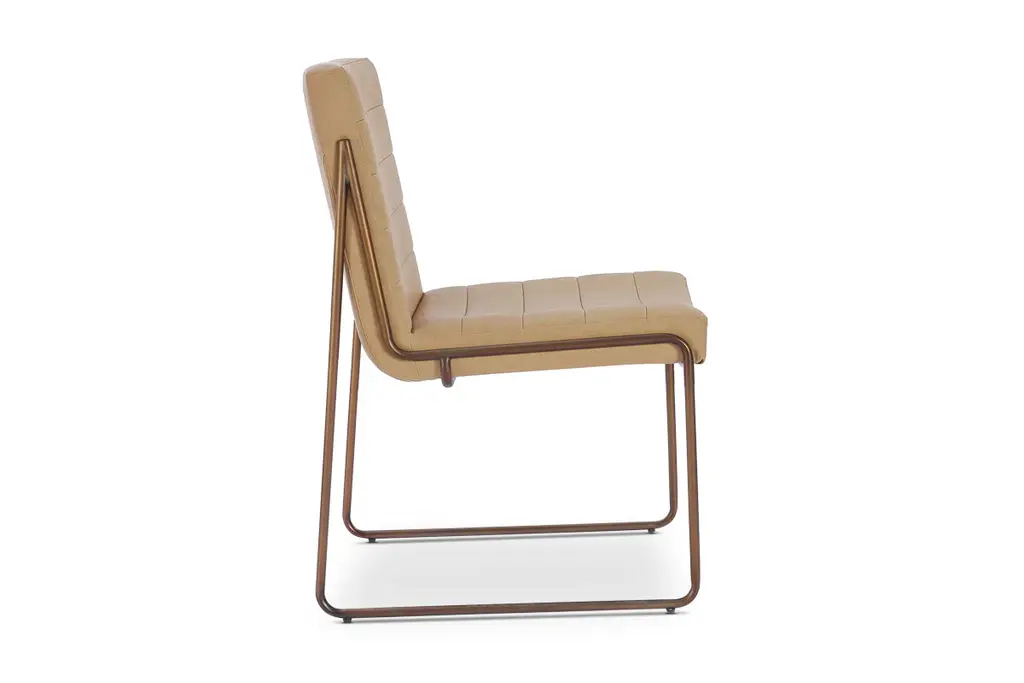 Tan vegan leather upholstery and bronze-finished steel base work together to create warmth in your dining space with the Merrimac Dining Chair (sold as a set of 2). It is ergonomically designed for maximum support and comfort, featuring a dense foam base with a soft top layer for a firm, cozy seat. The chair's one-piece base is hand-cut and welded, suspending the chair seat from below in a demonstration of elite craftsmanship.