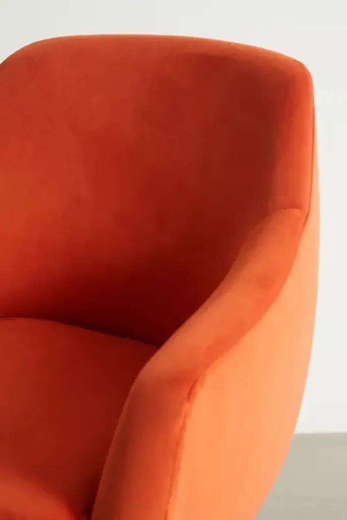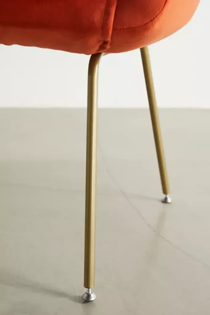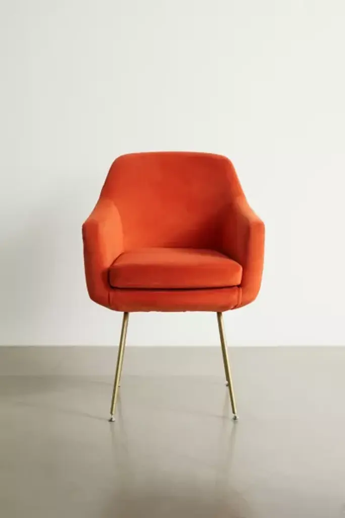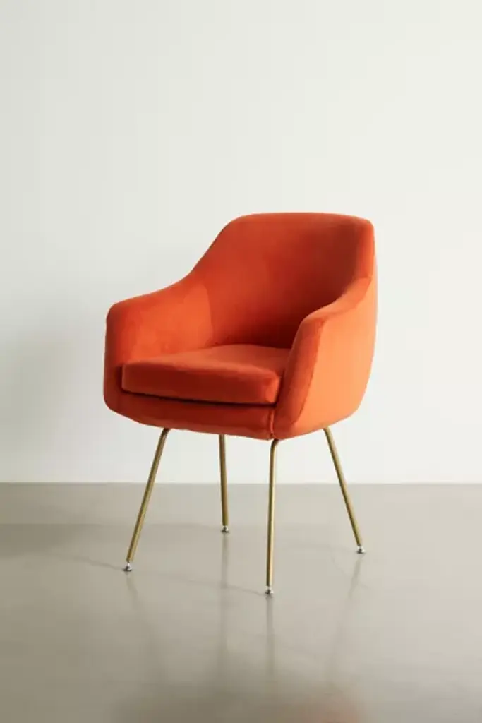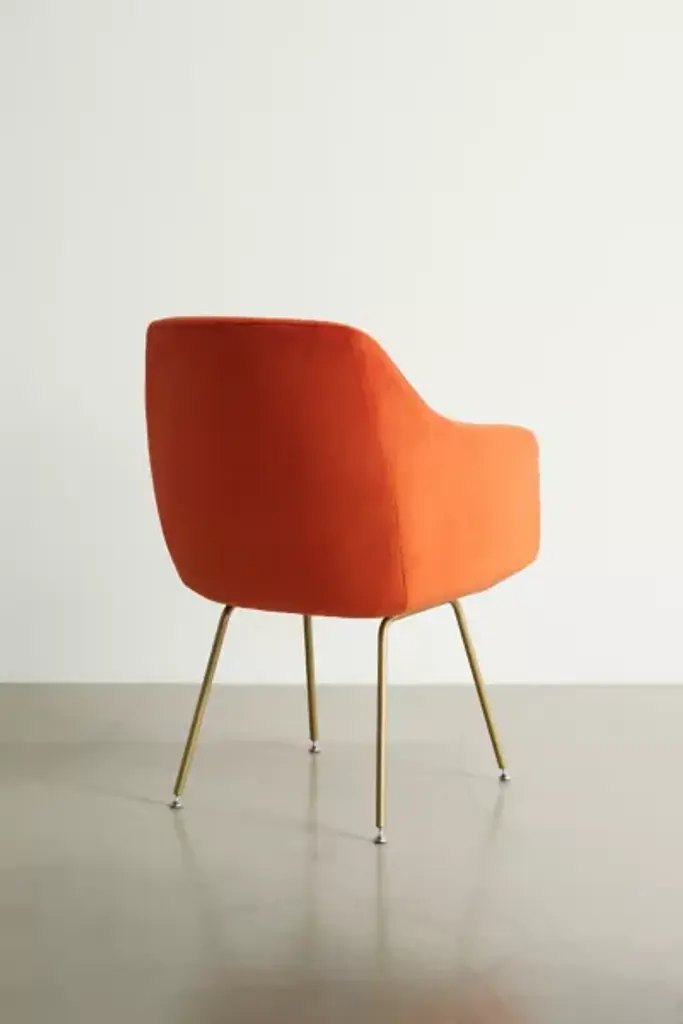 Drawing on mid-century modern style, this dining chair features an integrated backrest that wraps around to create flared arms. Upholstered in luxurious velvet fabric in rich hues that bring an inviting pop of color to your spaces. Complete with a removable cushion and sleek, gold-finished legs. This custom furniture piece will be made to order just for you. **Features** \- Mid-century modern dining chair \- Upholstered in luxurious velvet finished in rich hues \- Gold-finished tapered legs \- Integrated back and arm rests \- Removable cushions \- Versatile - use it to dress up your dining table, office spaces or reading nooks! \- Made to order just for you **Content + Care** \- Expanded polystyrene shell; velvet, polyester \- Spot clean \- Made in the USA **Size** \- Dimensions: 23.25"l x 23"w x 34"h \- Leg height/Clearance: 14.5", removable \- Seat height: 20" \- Interior seat dimensions: 19.5"l x 18"w x 21"h \- Weight: 16 lbs \- Shipping package dimensions: 24.75"l x 24.75"w x 34.5"h \- Shipping package weight: 18 lbs