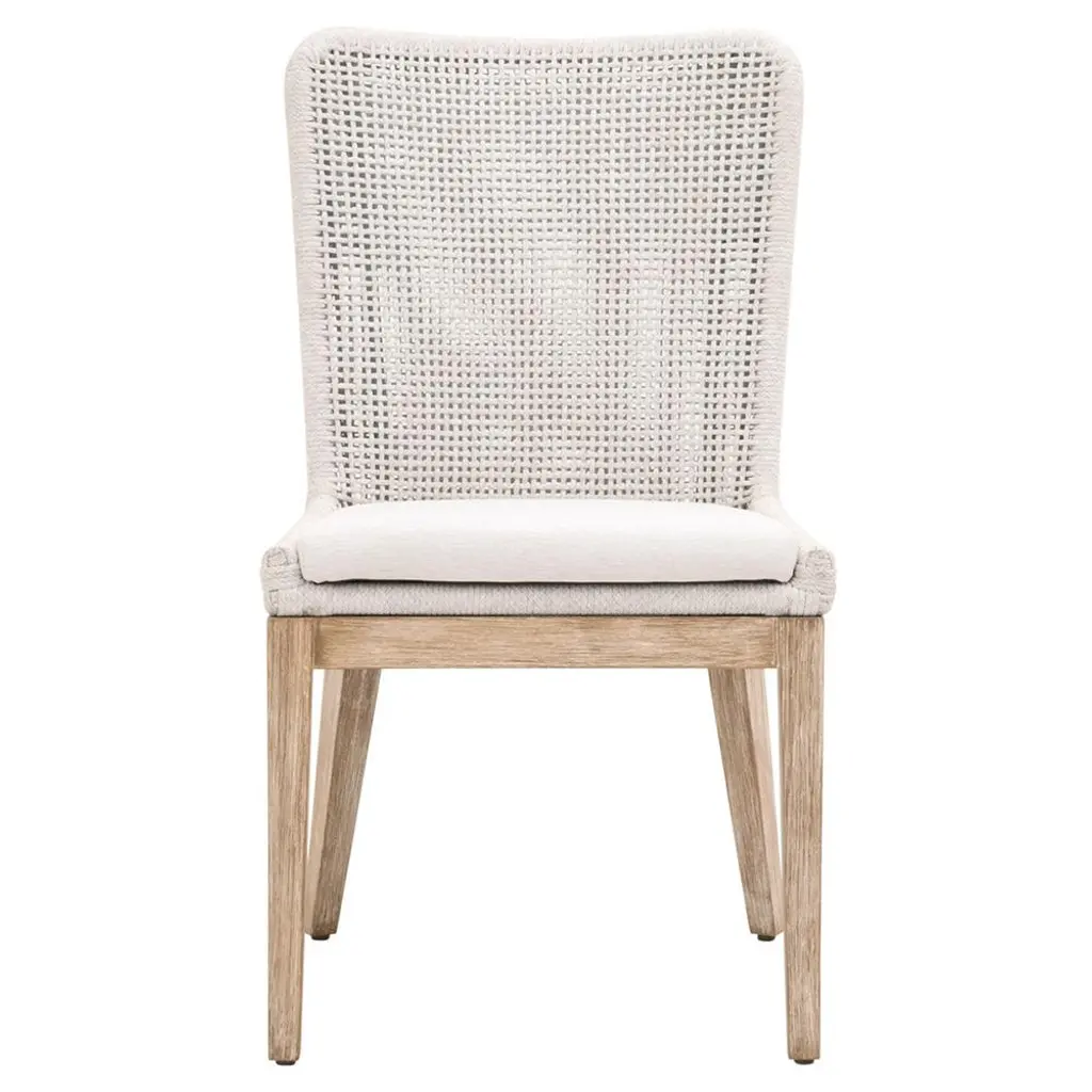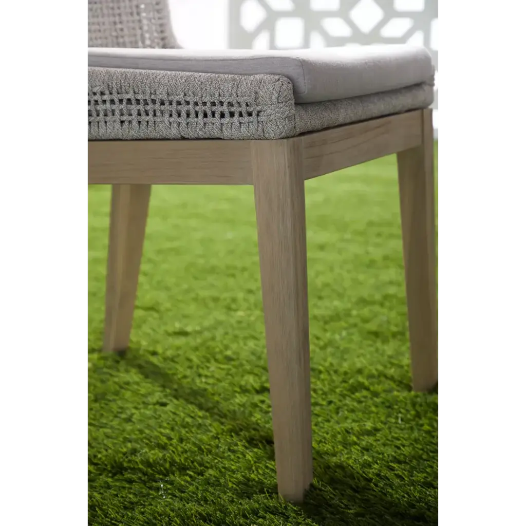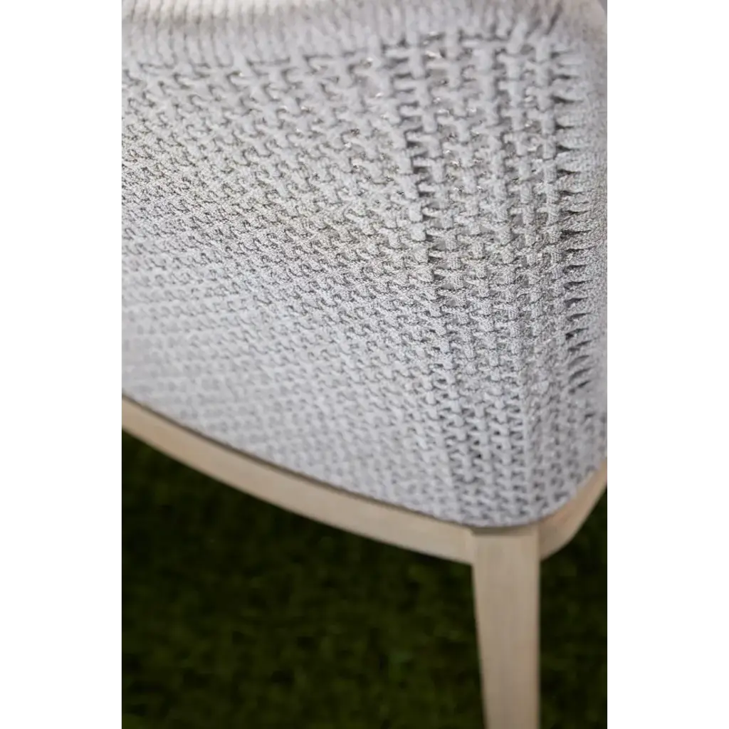 This woven outdoor side chair will add a touch of coastal style to your backyard or patio. Constructed with a stainless steel frame and solid gray teak legs, this dining chair is not only sturdy, but durable for outdoor use. A rich taupe and white colored rope is tightly woven to create a unique mesh design, while the gray teak legs feature a beautiful wood grain finish. Paired with a removable all-weather seat cushion, the chair provides comfort with style and will be the perfect addition to any outdoor space.