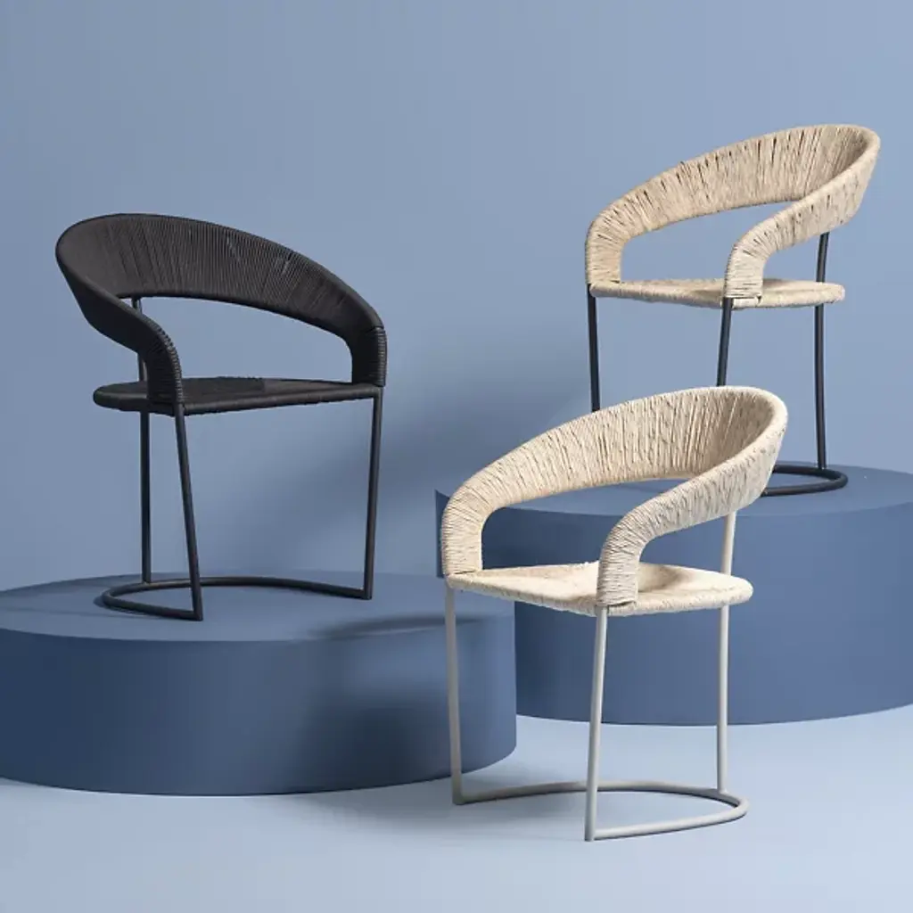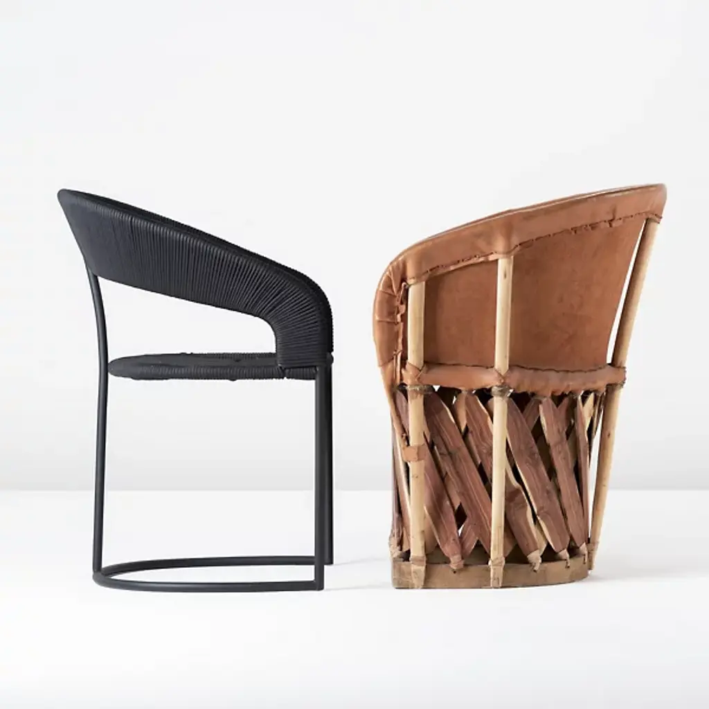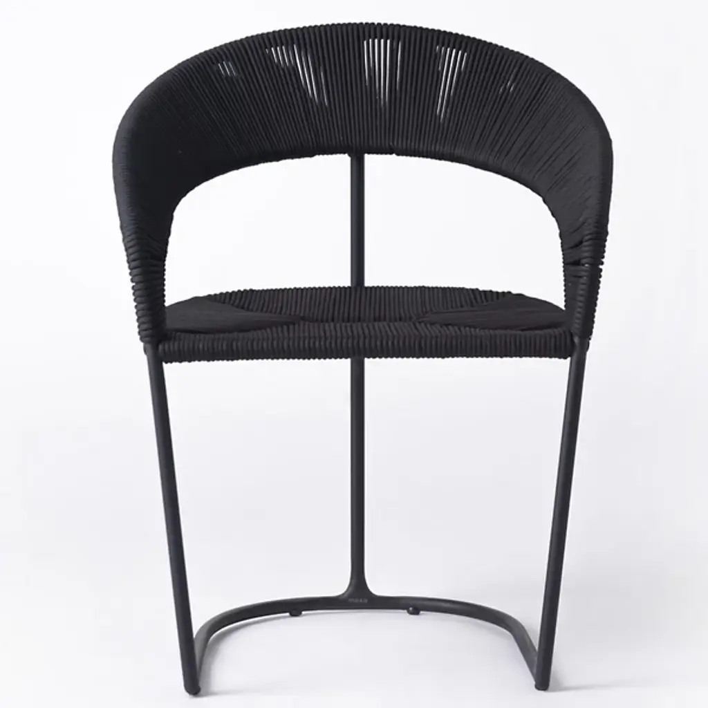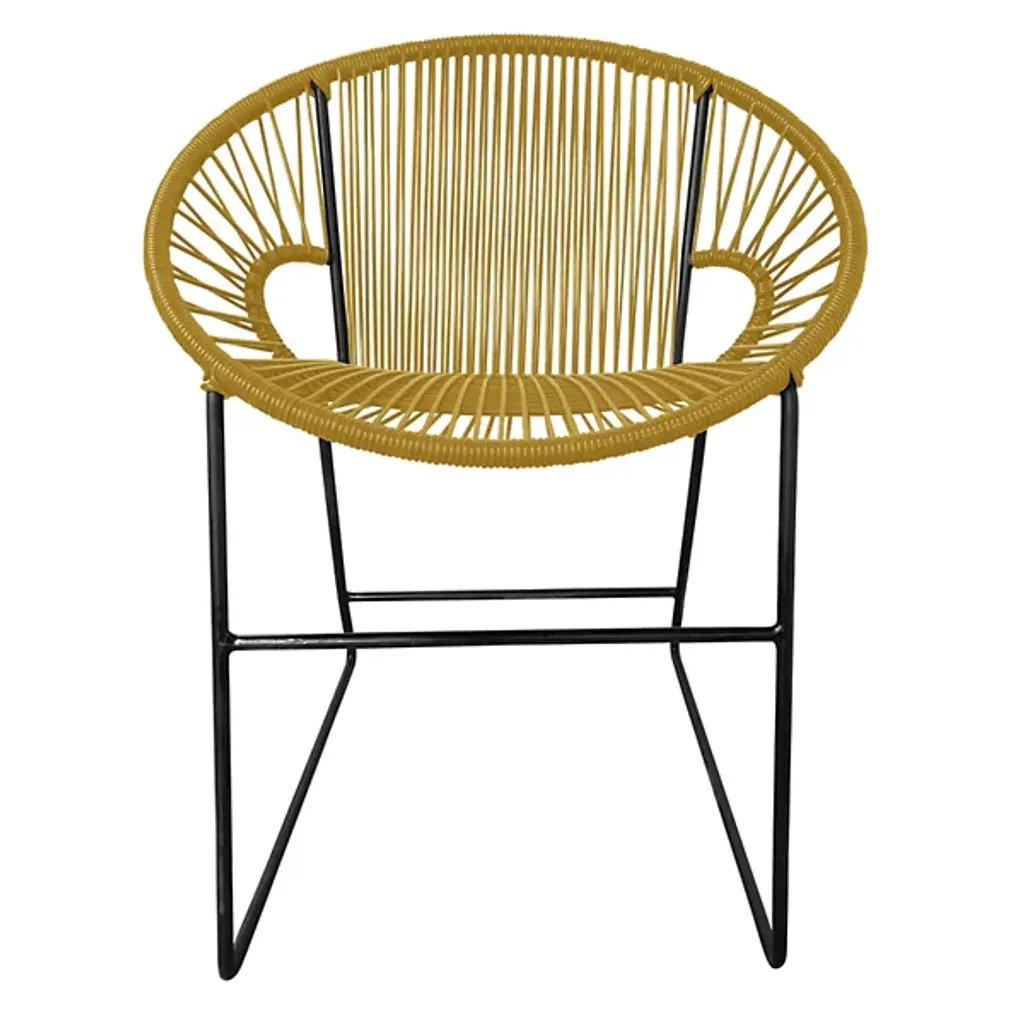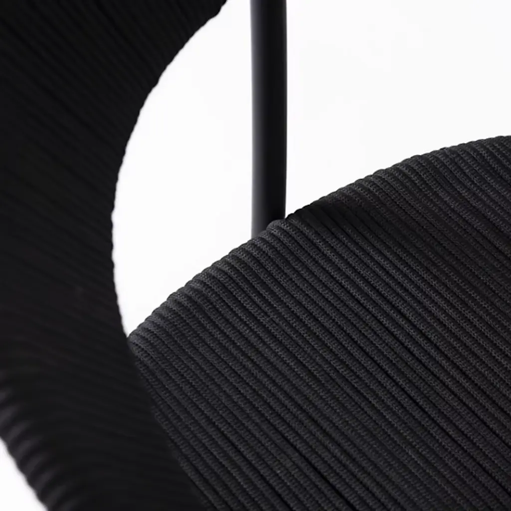 The Mestiza Dining Chair from Mexa Design reimagines the iconic Mexican Equipal chair with a contemporary twist. Designed by Moisés Hernández, it celebrates the cultural fusion of Indigenous and Spanish influences, retaining the original seat's curving silhouette and encompassing comfort. Each chair is handcrafted in Mexico, with a strong powder-coated steel frame set atop a U-shaped base with three braces, complemented by a woven PVC cord seat and back. The single arc of the seat back and arms adds a harmonious touch, supplying swooping sculptural refinement.