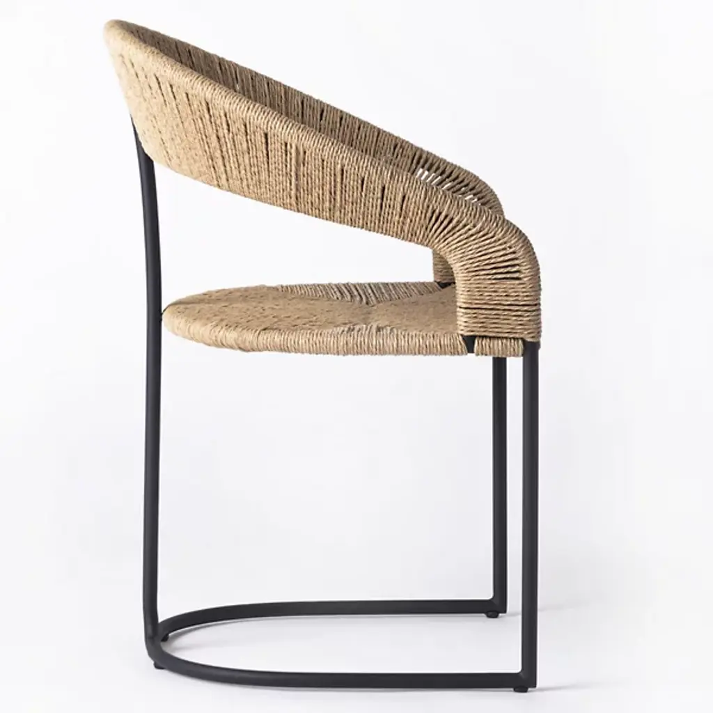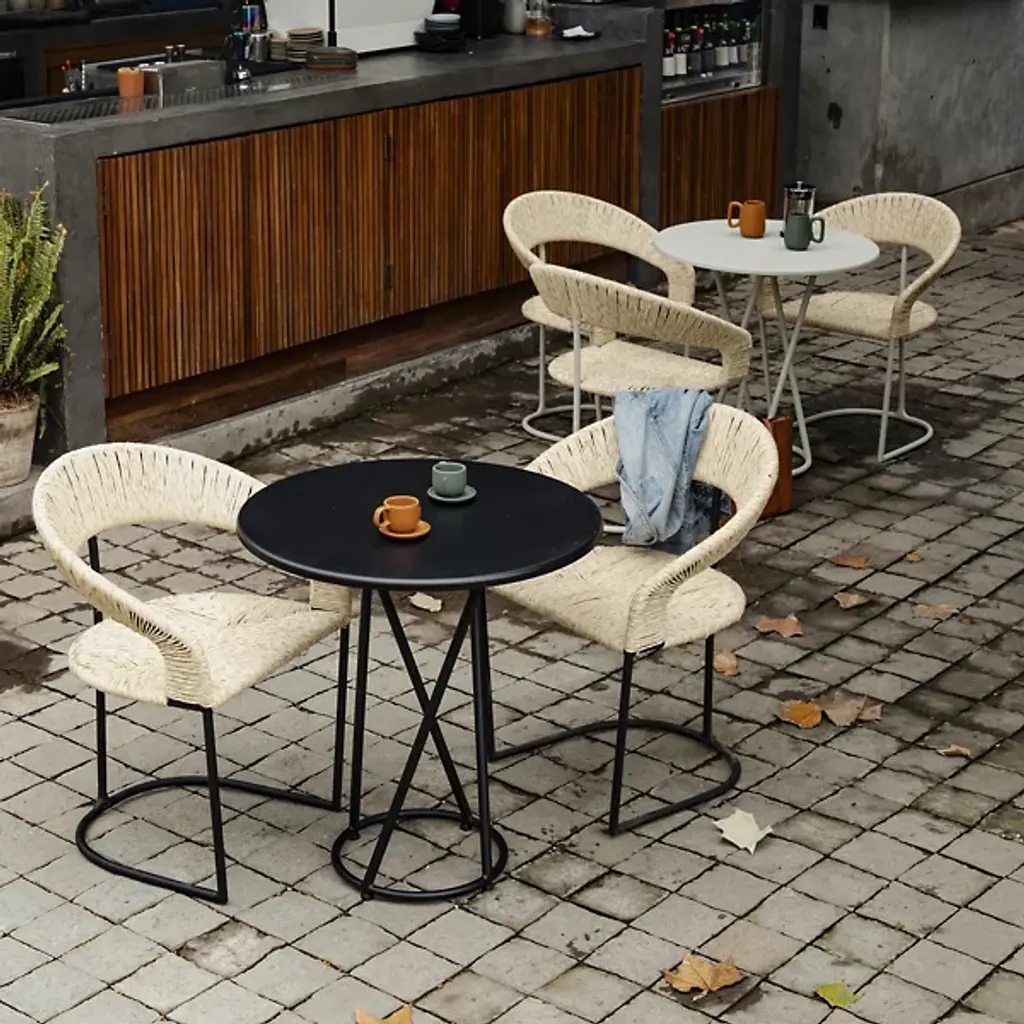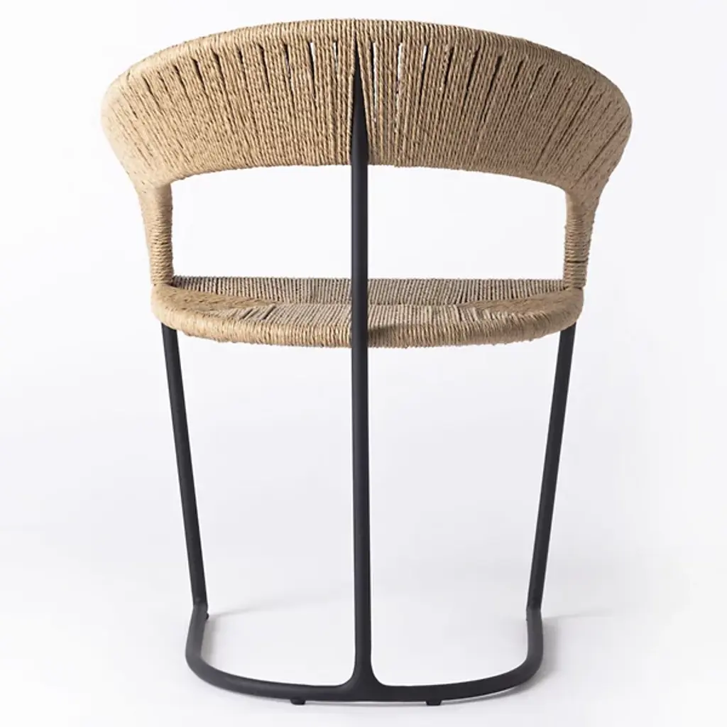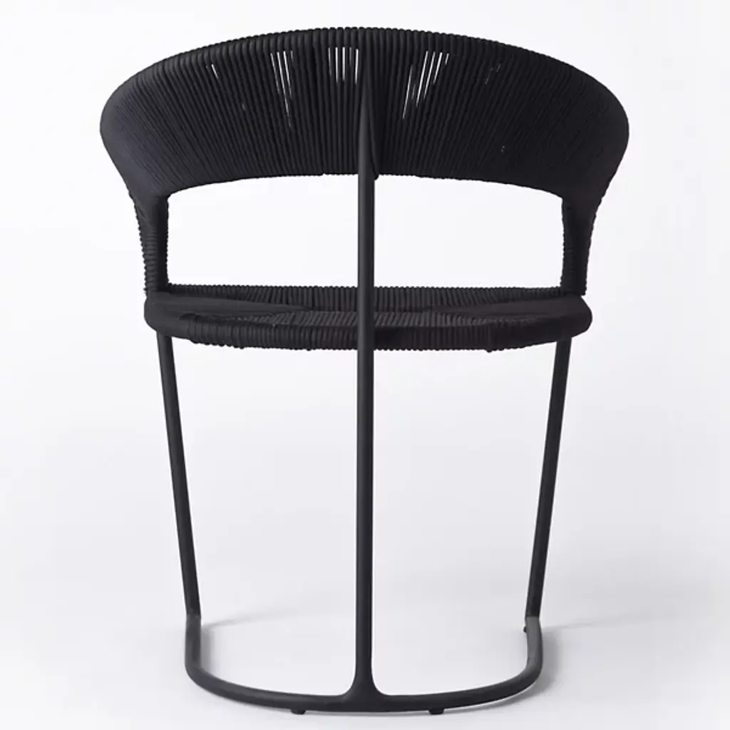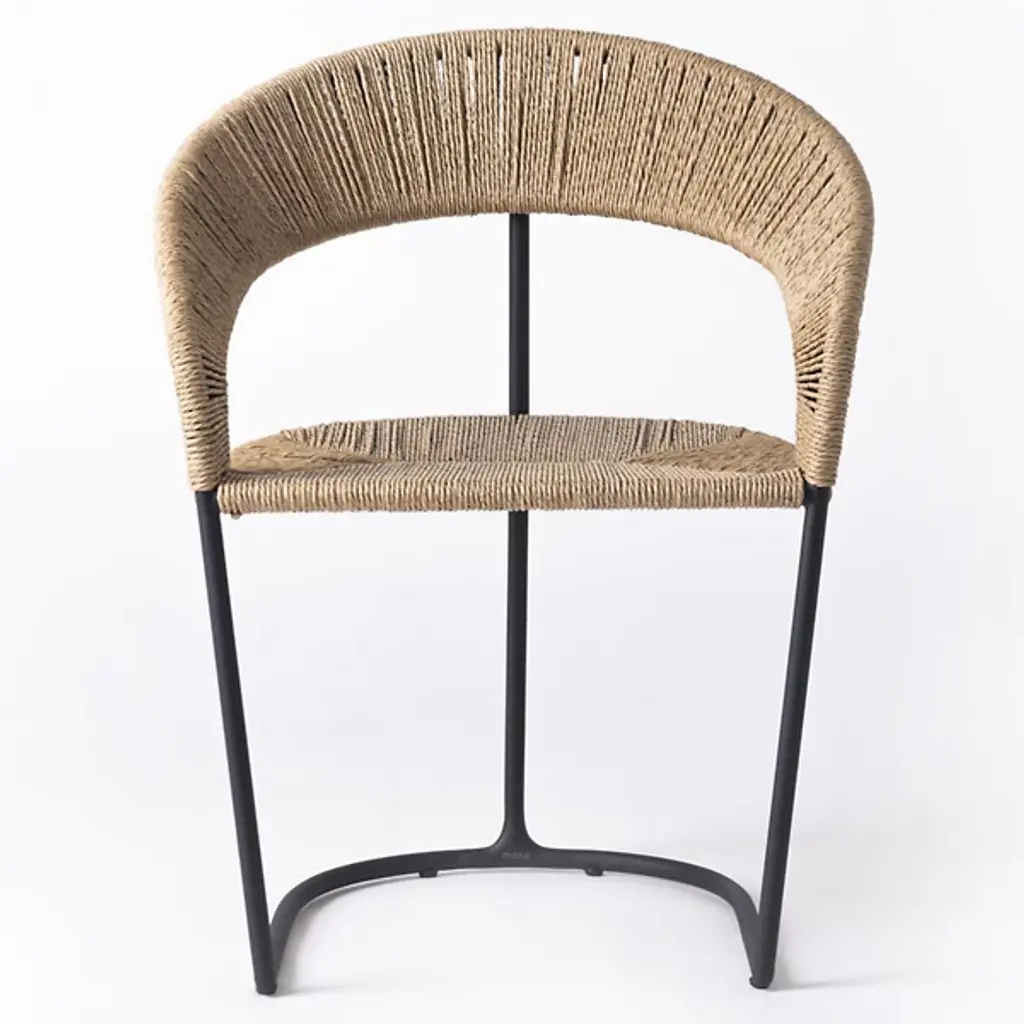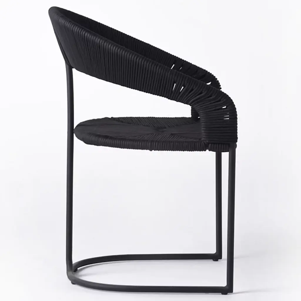 The Mestiza Dining Chair from Mexa Design reimagines the iconic Mexican Equipal chair with a contemporary twist. Designed by Moisés Hernández, it celebrates the cultural fusion of Indigenous and Spanish influences, retaining the original seat's curving silhouette and encompassing comfort. Each chair is handcrafted in Mexico, with a strong powder-coated steel frame set atop a U-shaped base with three braces, complemented by a woven PVC cord seat and back. The single arc of the seat back and arms adds a harmonious touch, supplying swooping sculptural refinement.