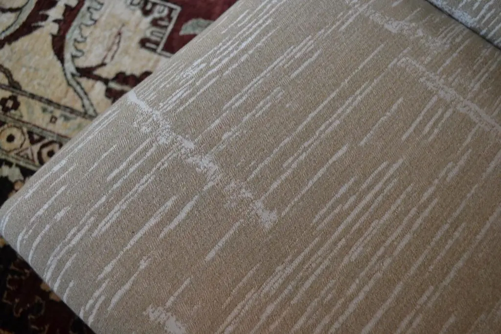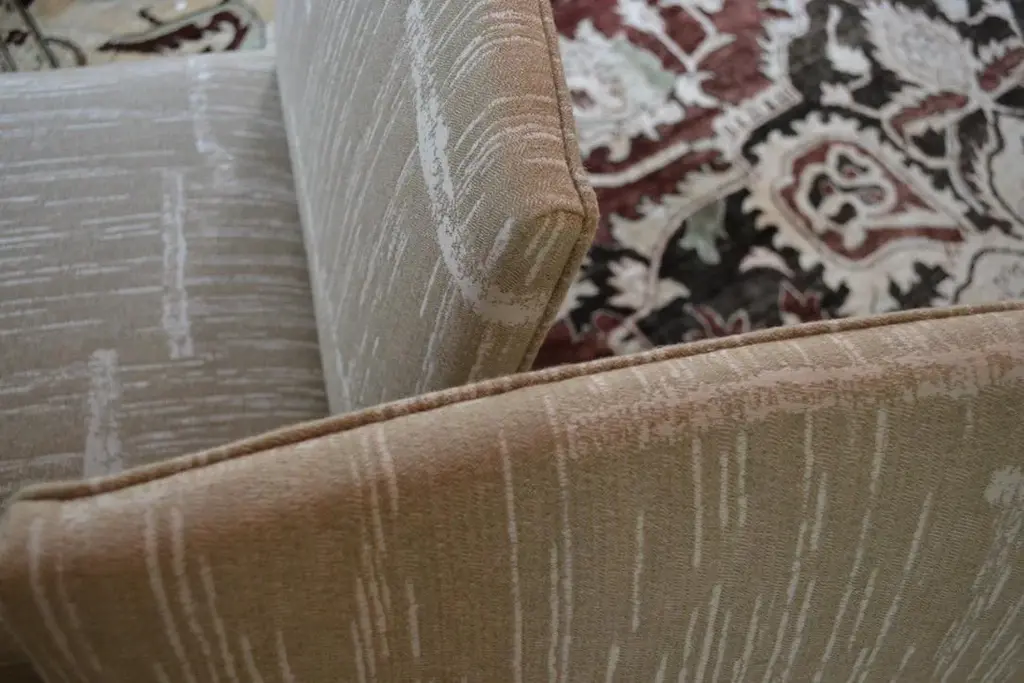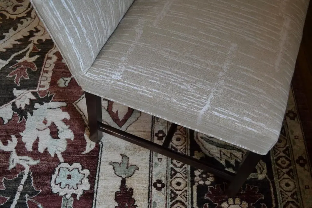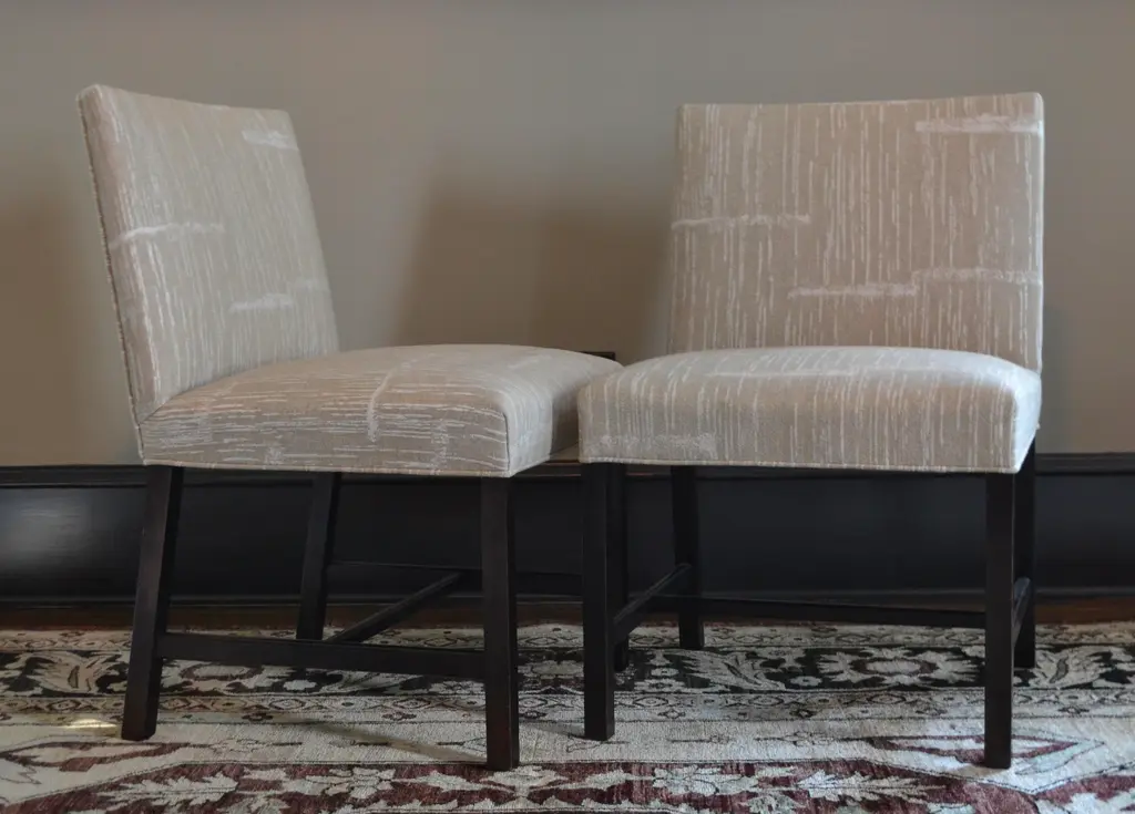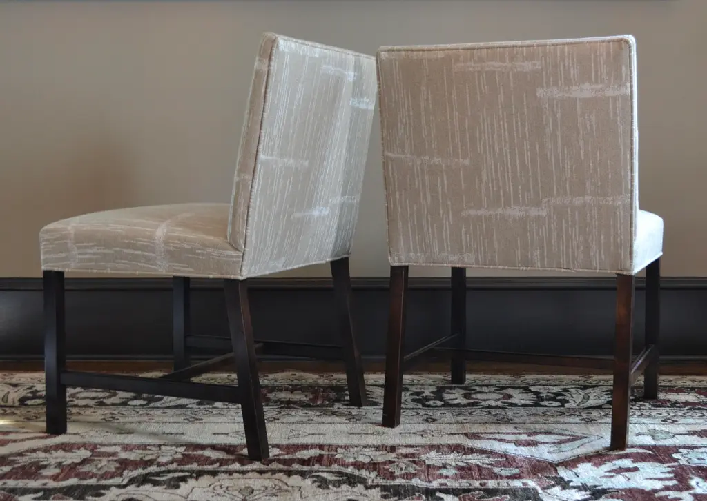 Nice pair of side chairs after Paul Evans or Harvey Probber. Unmarked but likely by Directional Furniture. Generous scale and comfortable. In a relatively new but retired abstract Donghia wool, while the ebonized wood stretcher bases retain their original finish with some signs of age and use. Three pairs available here and the matching arm chairs are available in another listing. 21 1/2" x 21 1/2" x 32 1/2"