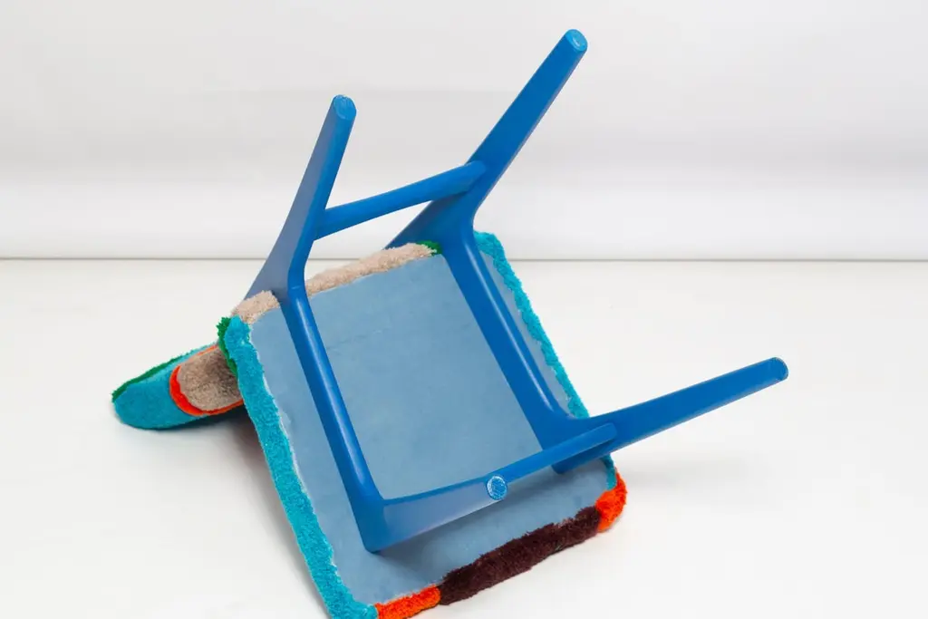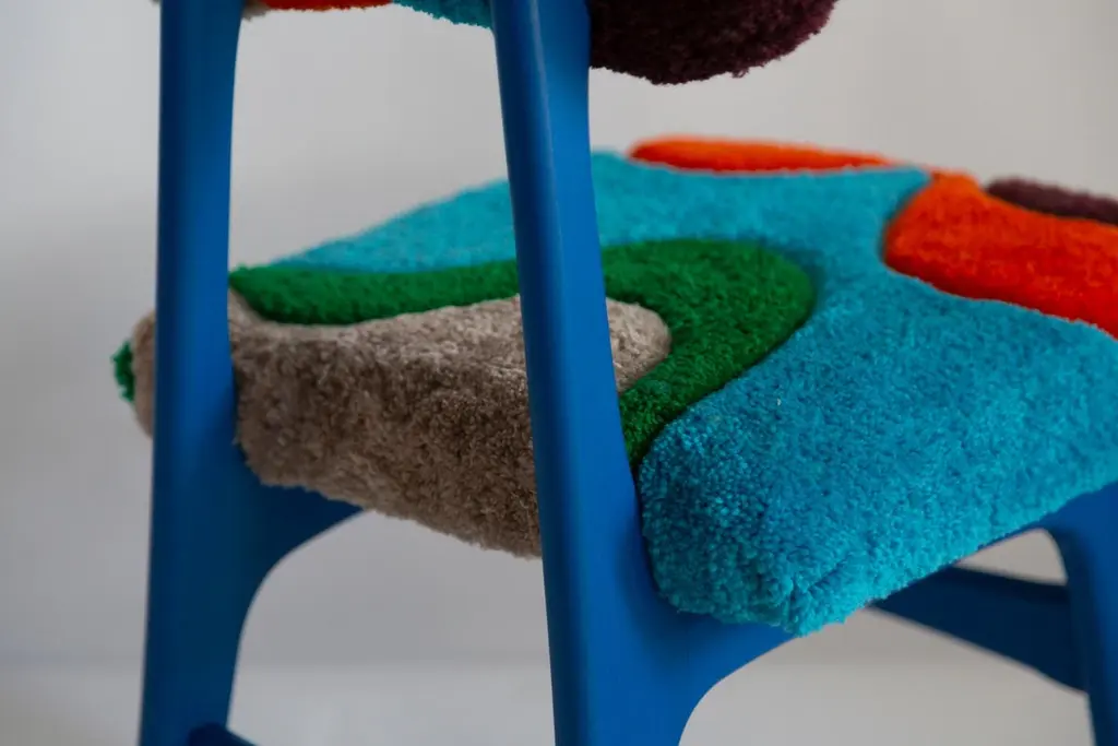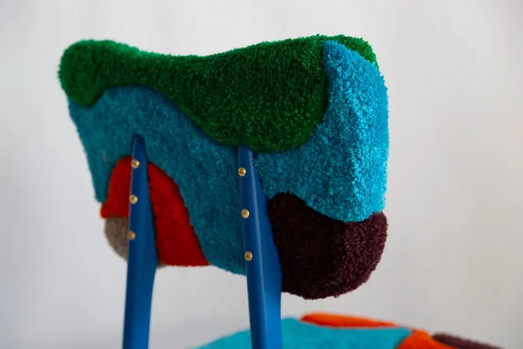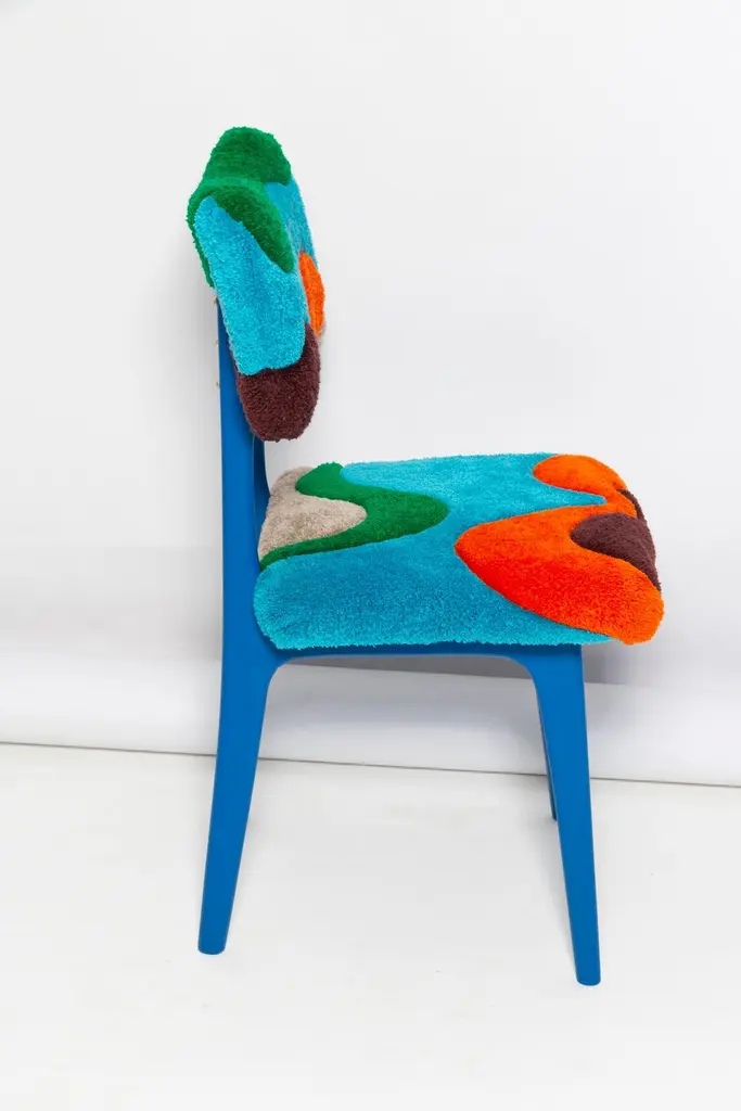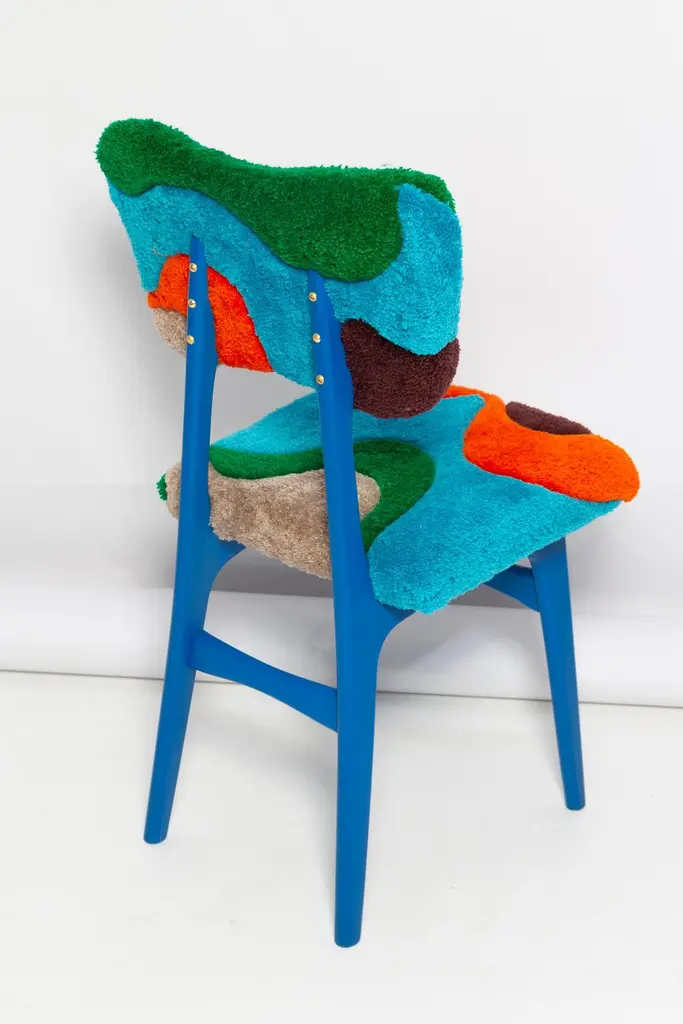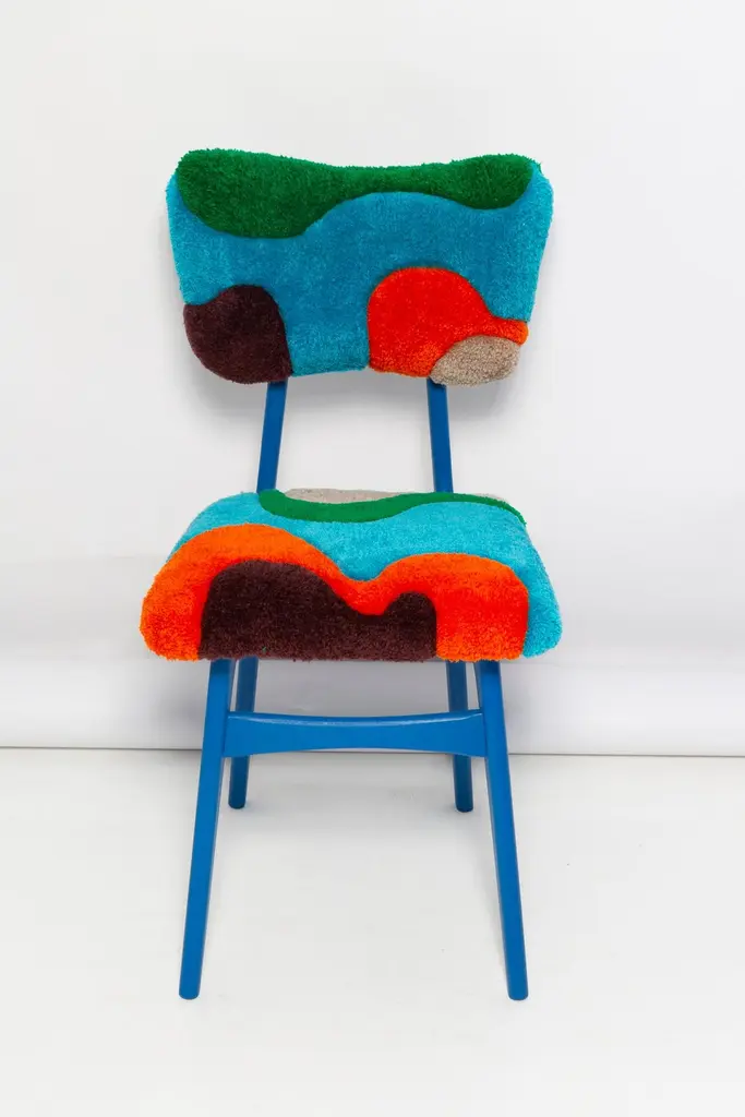 Dining chair called "Butterfly" with beautiful blue stained beech legs and fully upholstered seat and back in beautiful hand tufting wool fabric.This chair can be customized to your specifications or COM. Wood, stain, finish, fabric and custom options are available. Check the last pictures with color samples. This is vintage chair after professional renovation. Designed in 1960s in Poland.About the fabric used in this option:Seat and back is hand tufting multicolor wool. Absolutely hand made technic. Every chair is unique and can be a bit different. They are extremely comfortable and highly decorative. We can prepare this chair in another wool tufting colors.Different patterns are also possible.Waiting time is 3-4 weeks. Hand made in Poland.