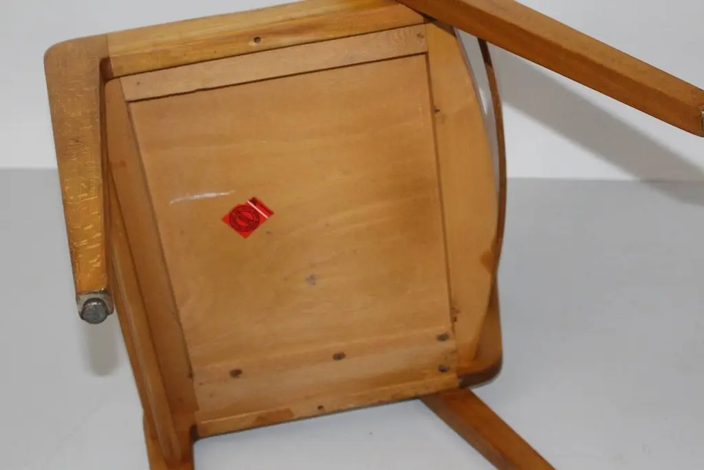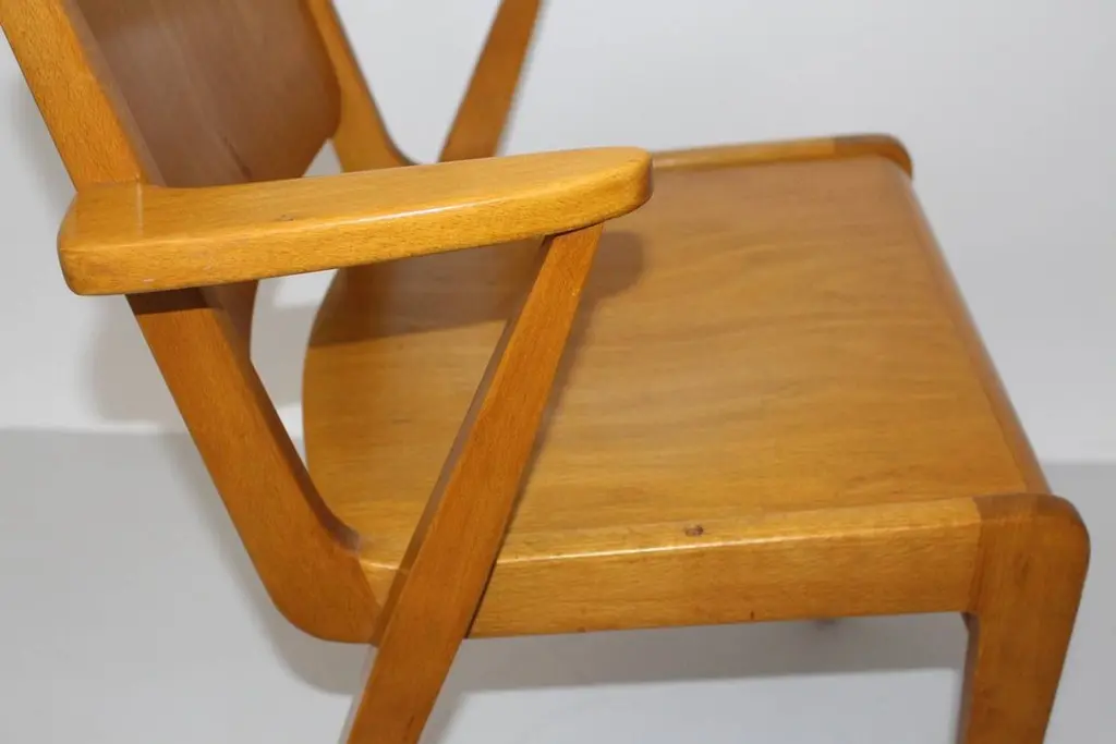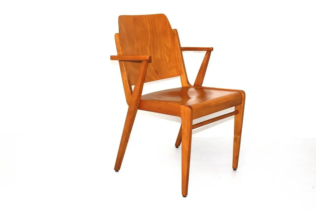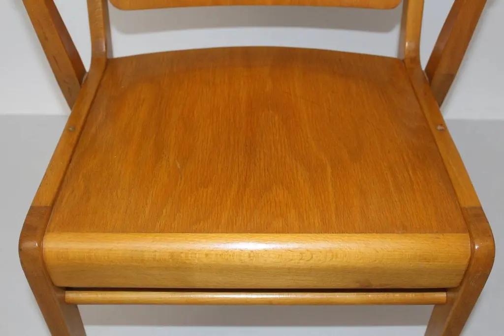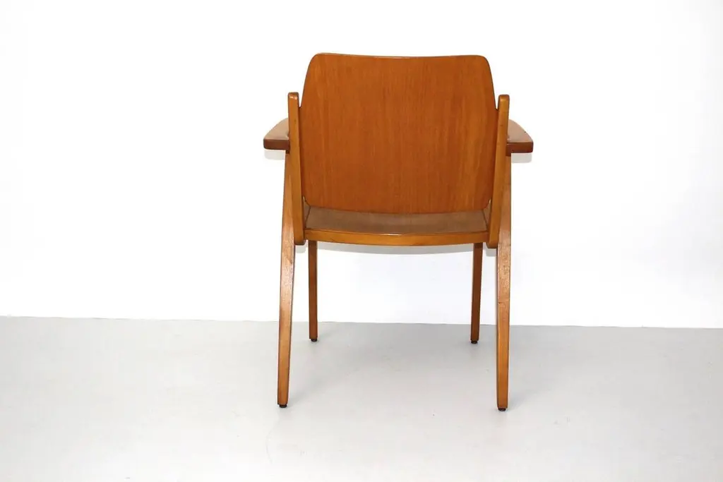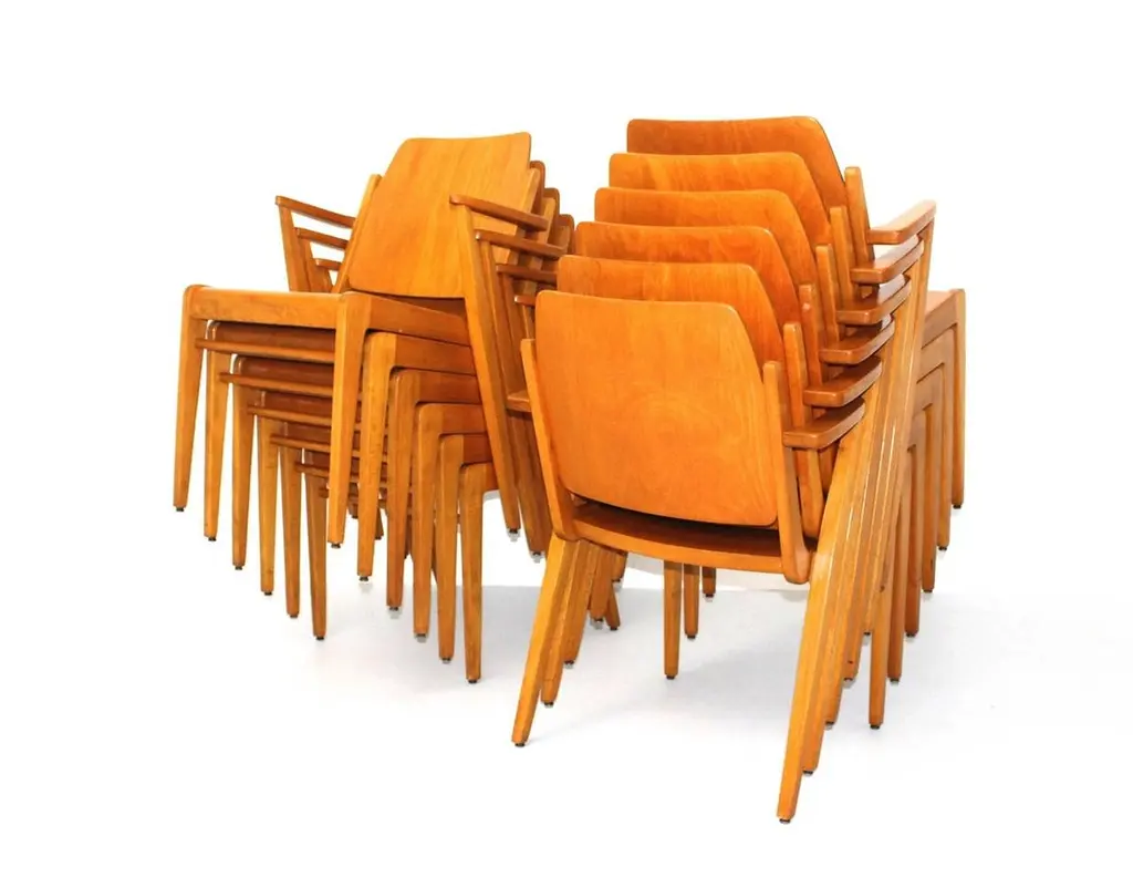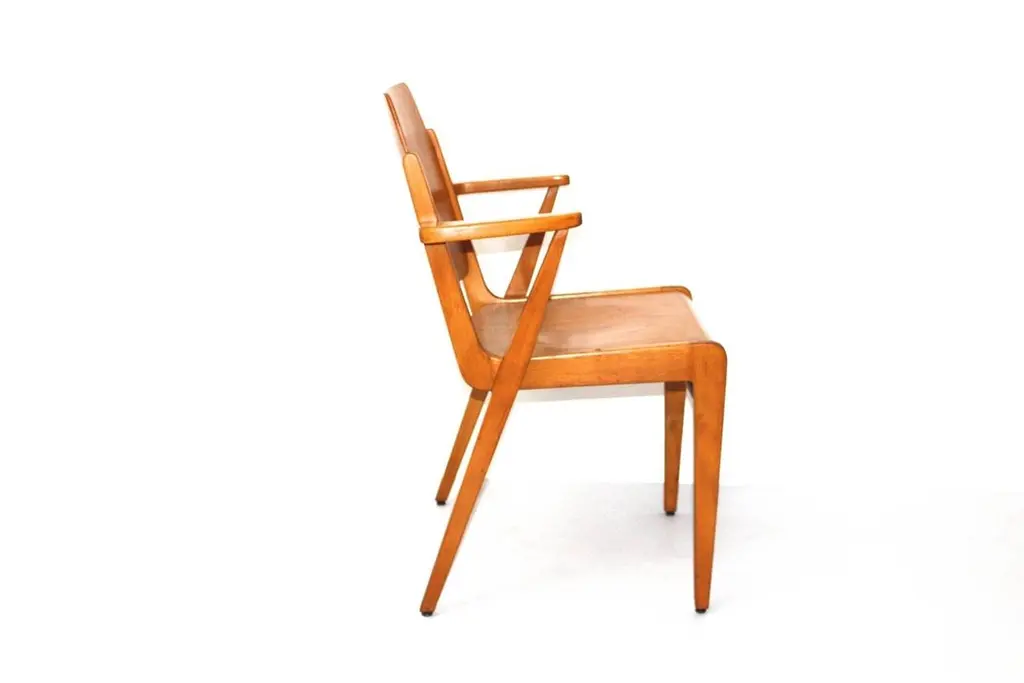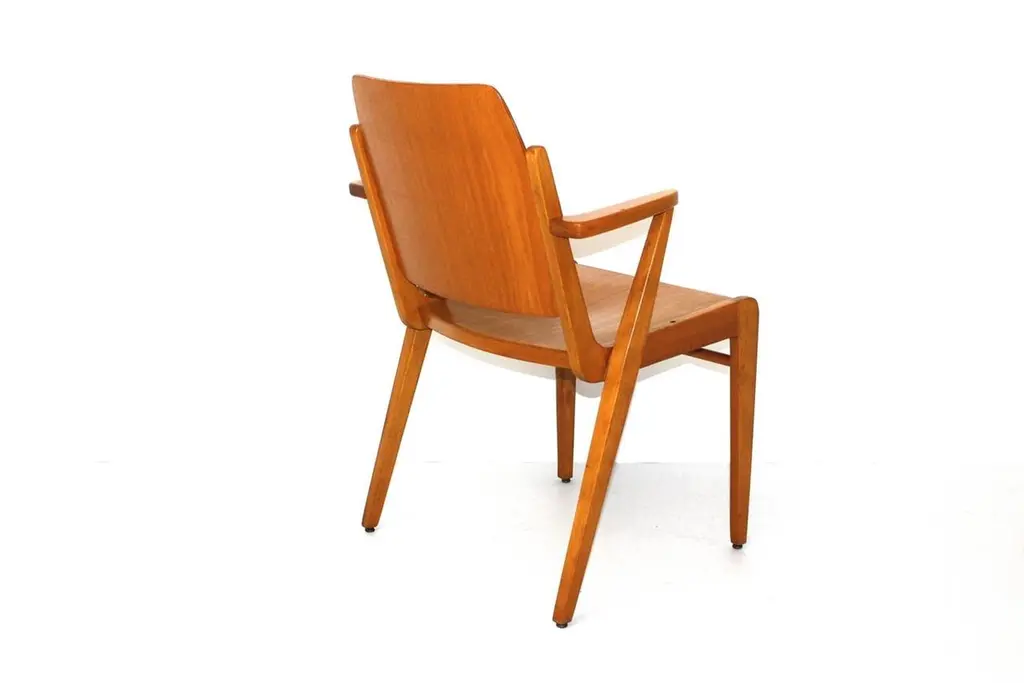 Mid-Century Modern vintage dining chairs or chairs from natural lacquered solid beechwood and plywood by Franz Schuster 1959 Vienna up to 14 chairs.The armrests were ergonomically formed. The height from the armrests goes from back to the front from 64 cm to 66 cm.These dining chairs or chairs works great as dining chair in your dining space or as chairs around your meeting table in your office.Throughout the warm brown color tone the dining chairs works perfectly with bold fresh colors as well as nature earthen or organic tones.The dining chairs or chairs are characterized by some signs of age and use like fine scratches and small abrasions.Up to 14 pieces are available. Franz Schuster (1892-1972) architect and designer studied by Oskar Strnad and Heinrich Tessenow.The designer Franz Schuster worked in the same era as Roland Rainer.Approx. measures:Width 60 cmDepth 56 cmHeight 82.5 cmSeat height 46 cm.