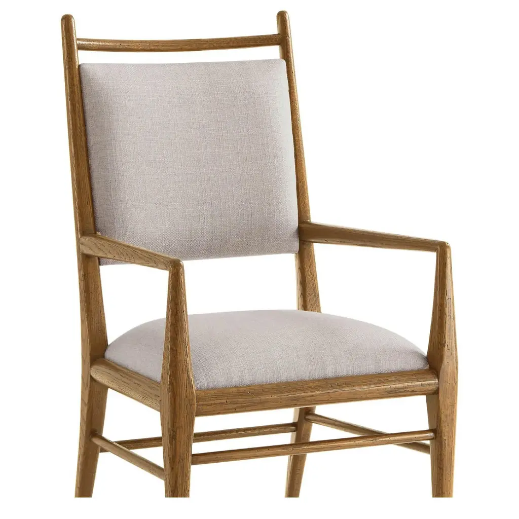 Mid Century style light oak dining armchair in our dawn finish, with a padded back and seat upholstered in performance linen fabric adds comfort and sophistication to this timeless design. Raised on tapered legs joined by a supportive stretcher.Dimensions: 21.5" W x 23.25" D x 40" HSeat - 19.25" H