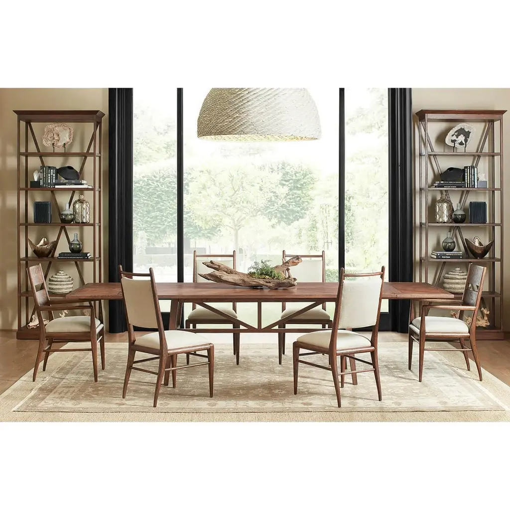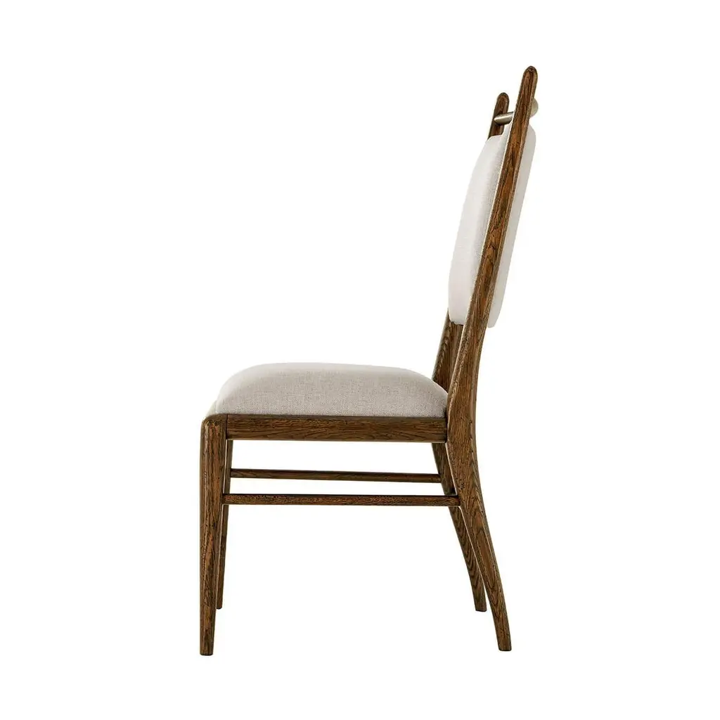 Mid-century style dark oak dining chair in our Dusk finish, with a padded back and seat upholstered in performance linen fabric adds comfort and sophistication to this timeless design. Raised on tapered legs joined by a supportive stretcher.Dimensions: 19.5" W x 23.25" D x 40" HSeat - 19.25" H.