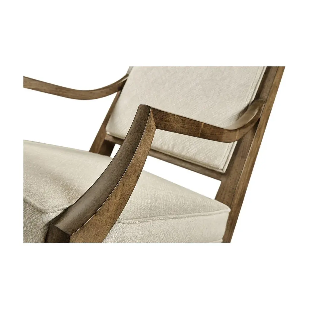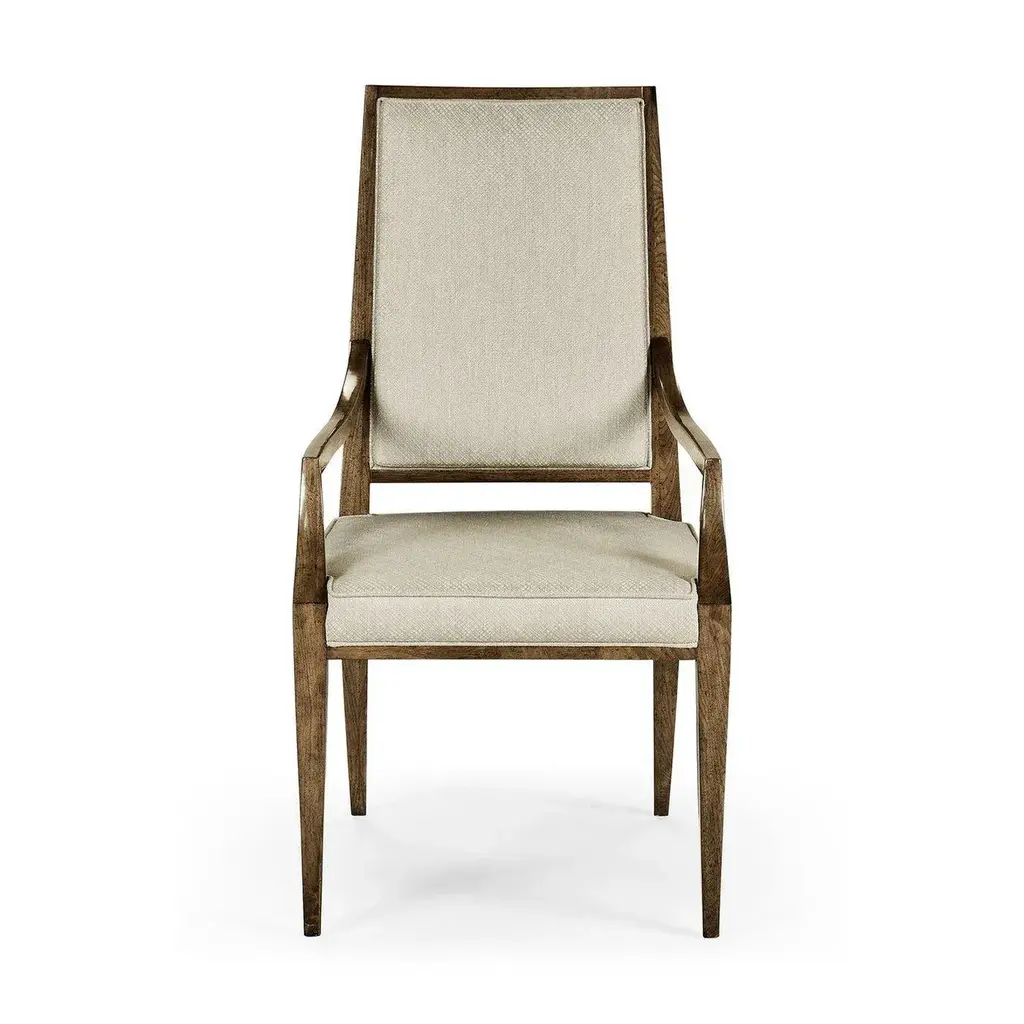 Sculpted from American walnut, with a transparent, hand-rubbed finish. This chair has elegant simple lines and is upholstered in a performance fabric. Dimensions: 23" W x 26.5" D x 42.5" H Seat - 19.5" H Arm - 25" H