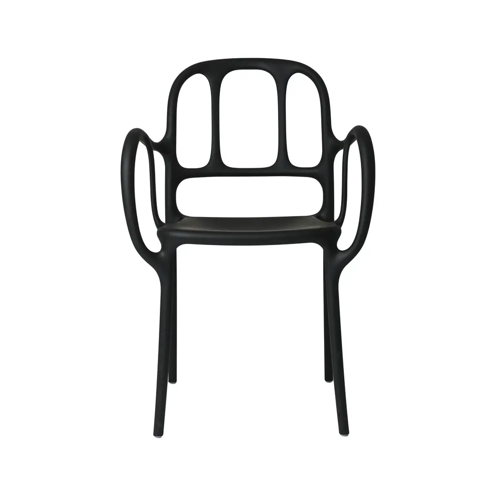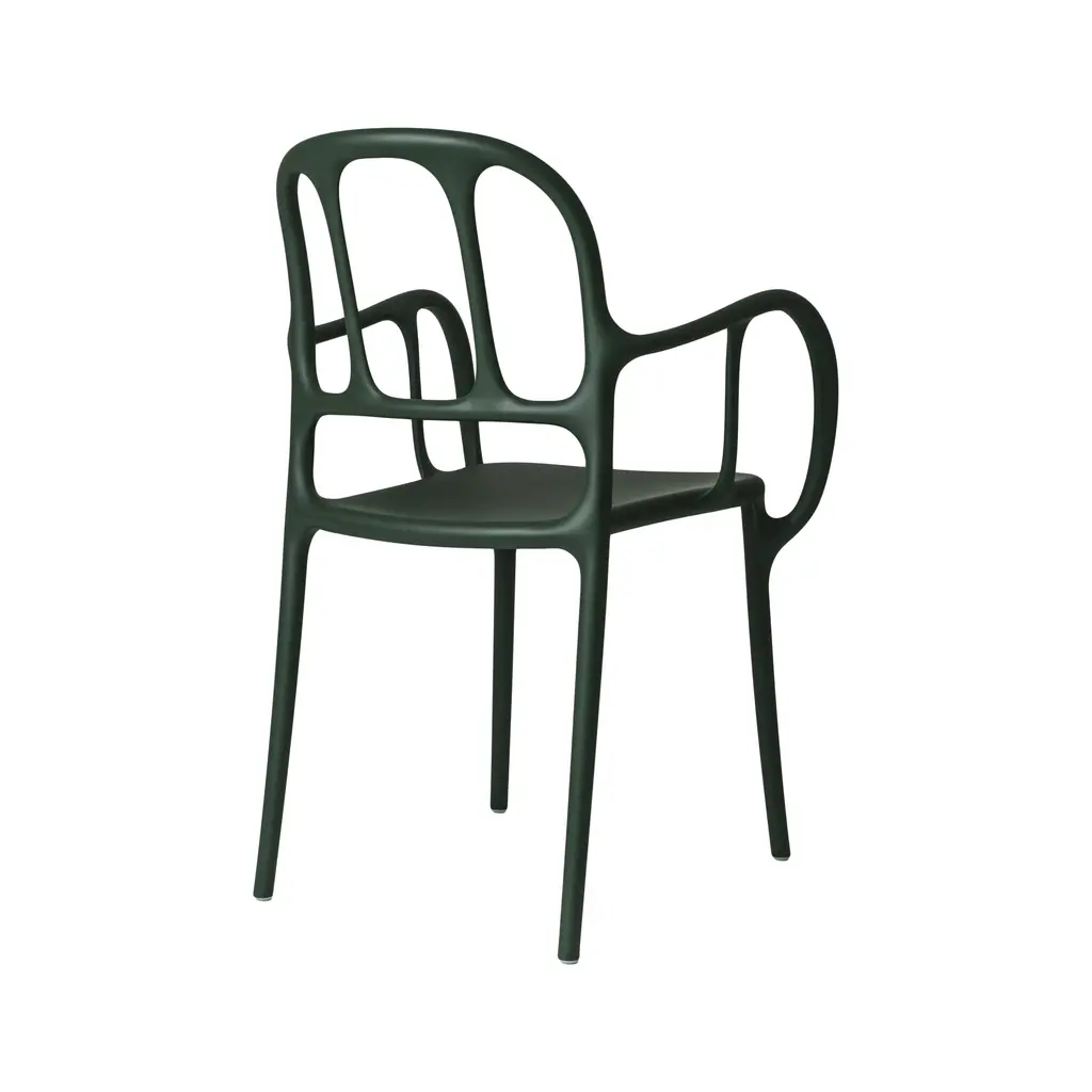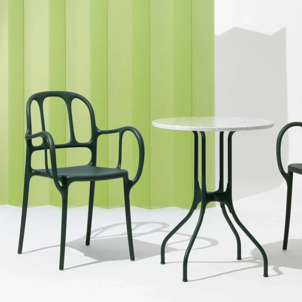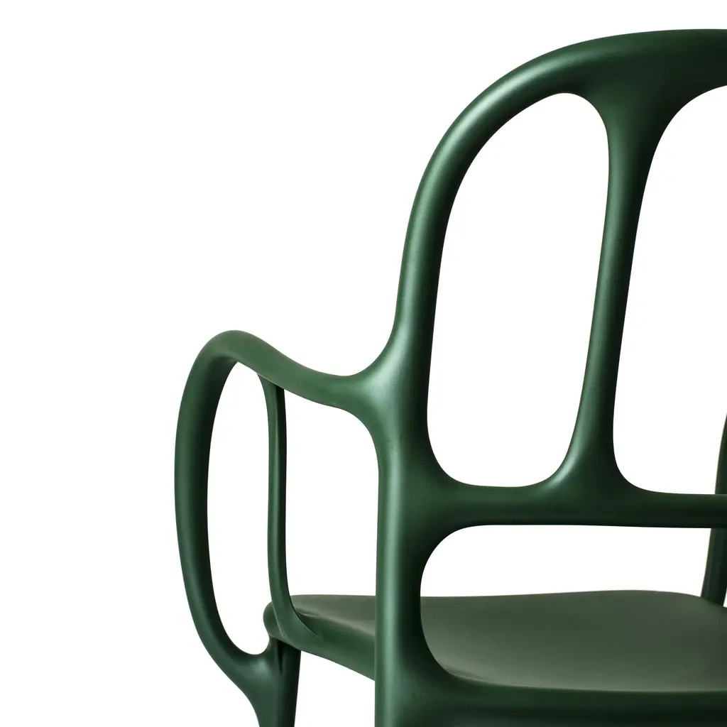 The Milà Armchair from Magis is a stylish and versatile addition to any space. Crafted from a durable mix of plastic and fiberglass, the chair offers an organic, dynamic shape with an elegant look. Its slender legs and ornamental back and armrests bring a modern charm to any environment, indoors or out. Highlights