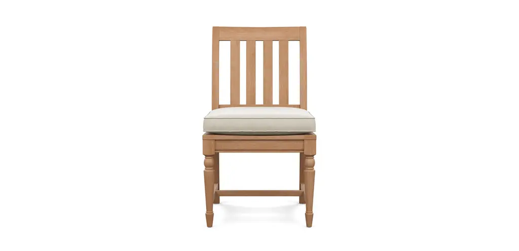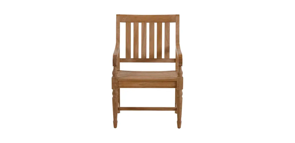 One part English garden. One part West Indies lanai. Our Millbrook collection is built to last and look great doing it. The dining armchair has a slatted back, beautifully detailed carved arms, and turned legs.