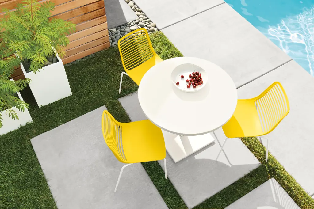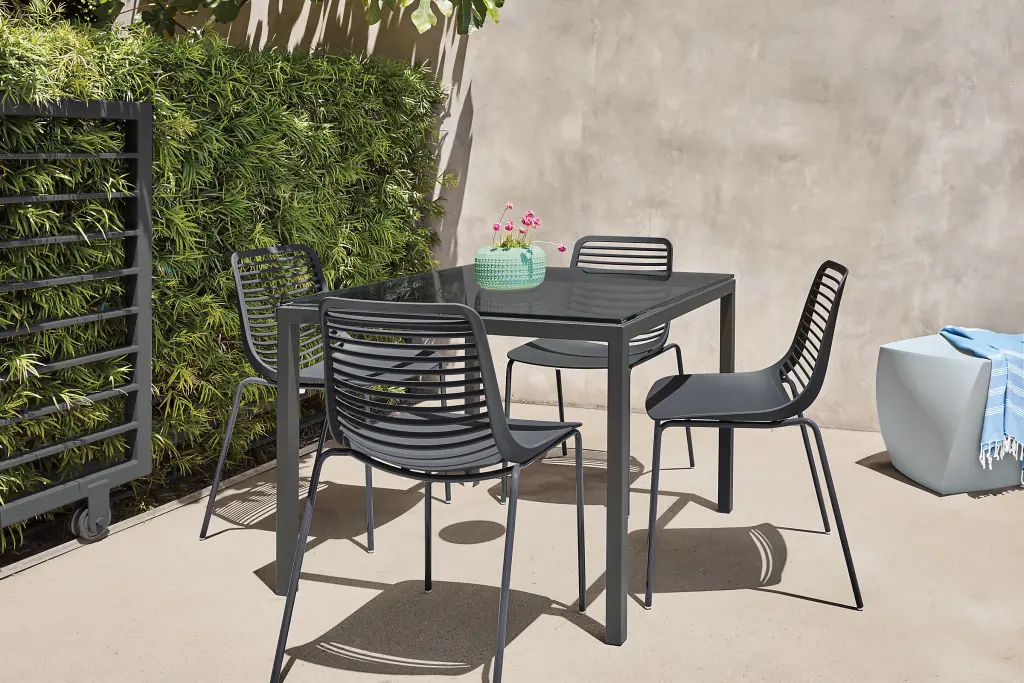 Our modern Mini outdoor dining chair features distinctive style in a contoured silhouette for added comfort. Choose your favorite color, base and back style to coordinate with your outdoor space. This durable chair has a sleek design for stackable storage and is exclusive to Room & Board.