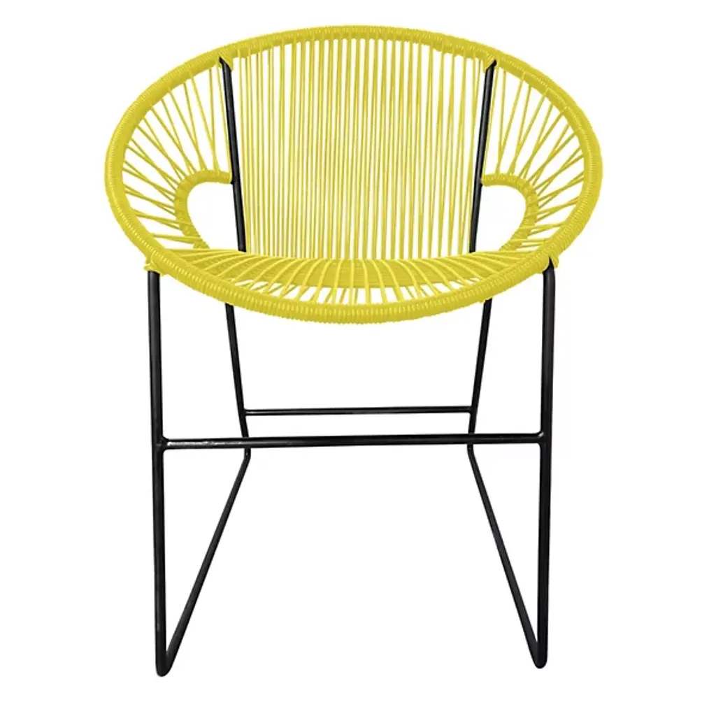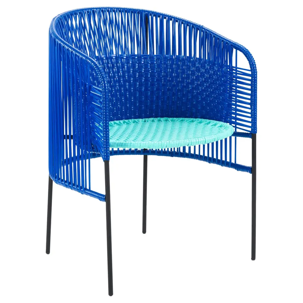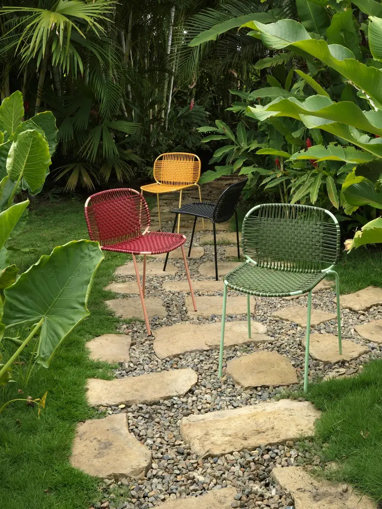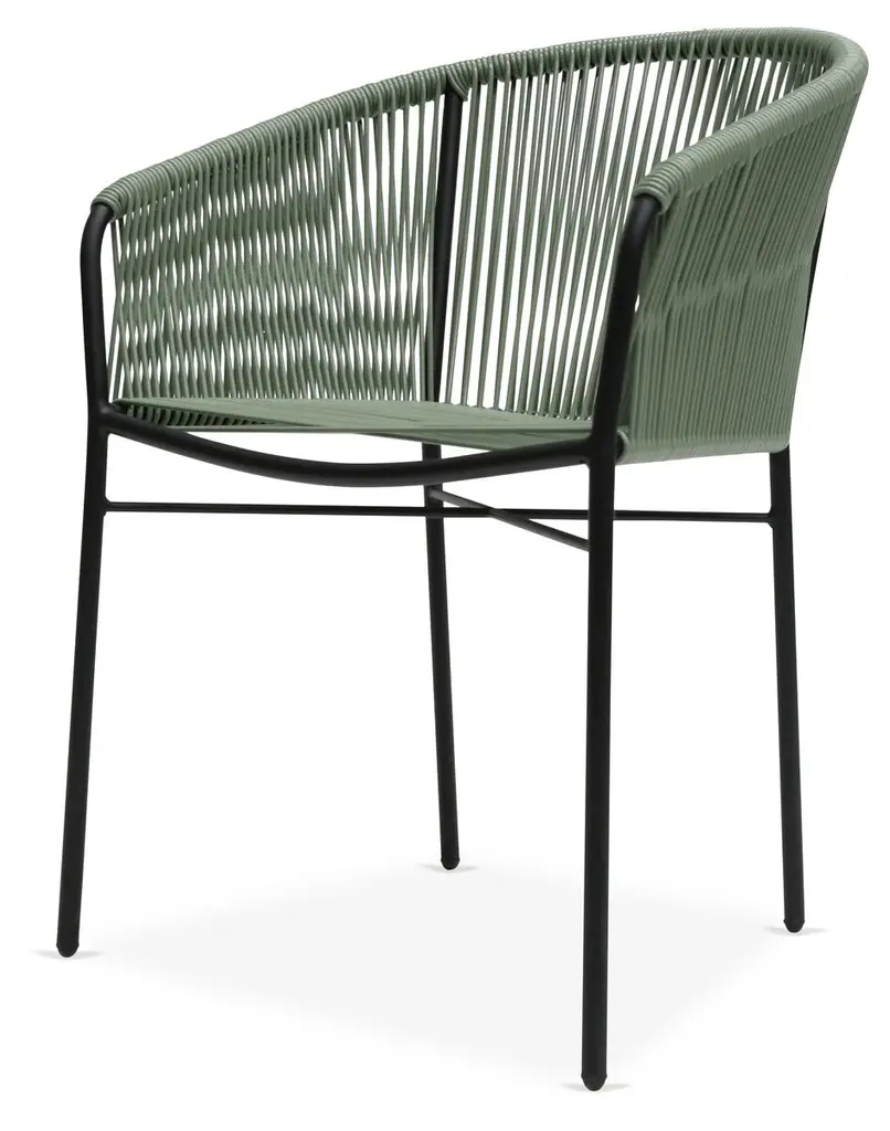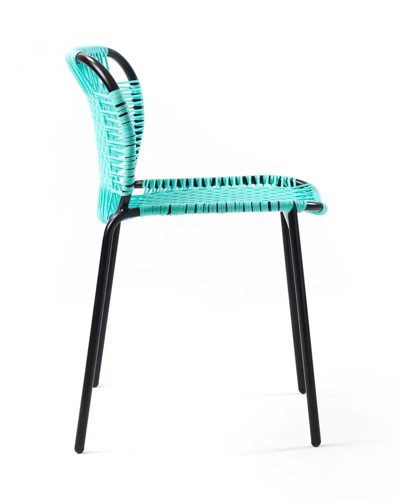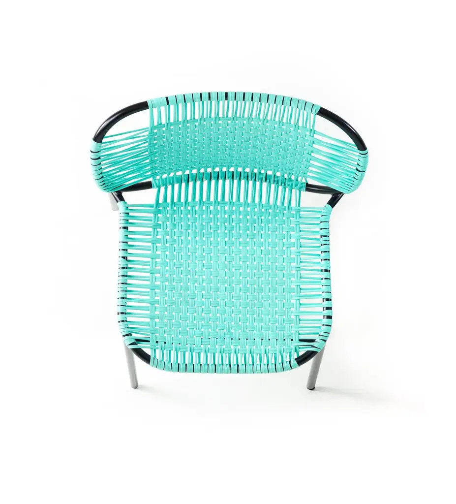 Mint cielo stacking chair by Sebastian HerknerMaterials: PVC strings, powder-coated steel frame.Technique: Made from recycled plastic and weaved by local craftspeople in cartagena, colombia.Dimensions: W 56 x D 51.4 x H 78 cmAlso available colors: Brown, mint/ black, black-black, olive/ menta, purple/ carne , honey/ menta.The Cielo Stacking Chair is a light, versatile and comfortable design by Sebastian Herkner. It’s ready for indoor and outdoor use and a great choice to create inspired seating arrangements on a terrace or in the living room. Available in various color combinations, the stackable chair can also add personality to dining areas of restaurants or hotels. Like the daybed and lounge chairs of the collection, the colors and look are inspired by Sebastian’s visits to Colombia. There, he not only immersed himself in the culture and beauty of the country but also met the local Ames artisans and learned about their traditional weaving techniques.Each chair is made in Santa Marta, a city on the Caribbean coast of Colombia, by local craftspeople. They weave the PVC strings, which are made from recycled plastic, around a powder-coated tubular steel frame. The weaving technique the artesanos and artesanas use are called Momposino, a traditional method known for intricate patterns. Just the preparation of all the materials takes ten days, while the production of each chair takes two daysGerman designer Sebastian Herkner is a long-term collaborator of Ames and has visited Colombia multiple times to experience the country’s cities, nature and people first hand. He also visited many of the ateliers that Ames has partnered with to learn about the unique traditional crafts of Colombia's regions. A sought-after contemporary designer and recipient of many industry awards, he has worked with many international design brands, creating intriguing pieces that showcase his intuition for interesting material, color, and texture combinations.