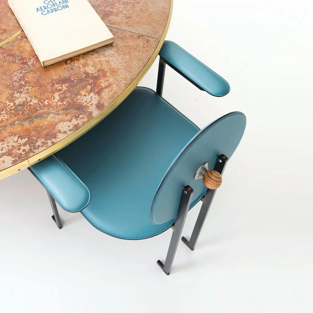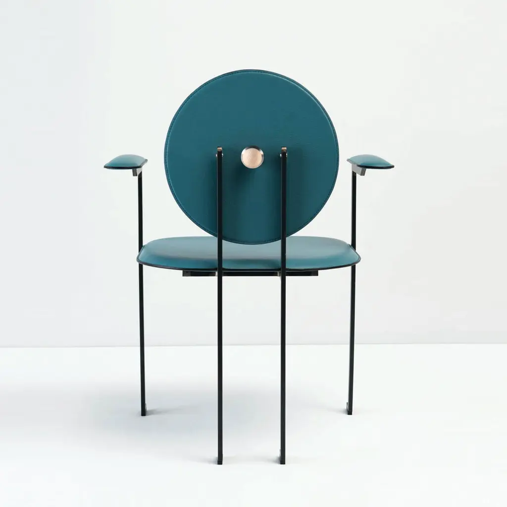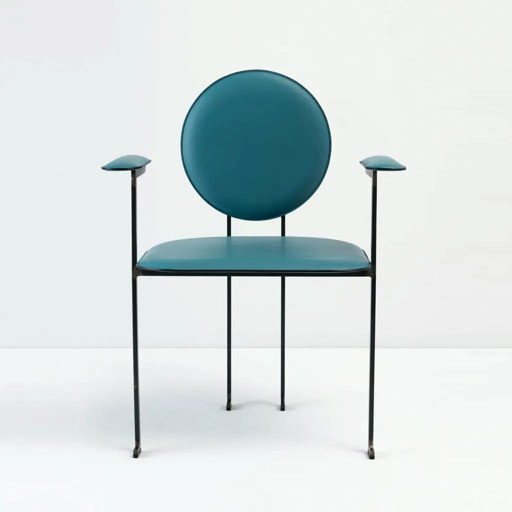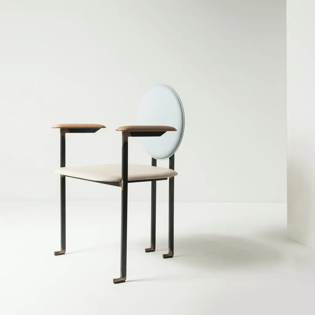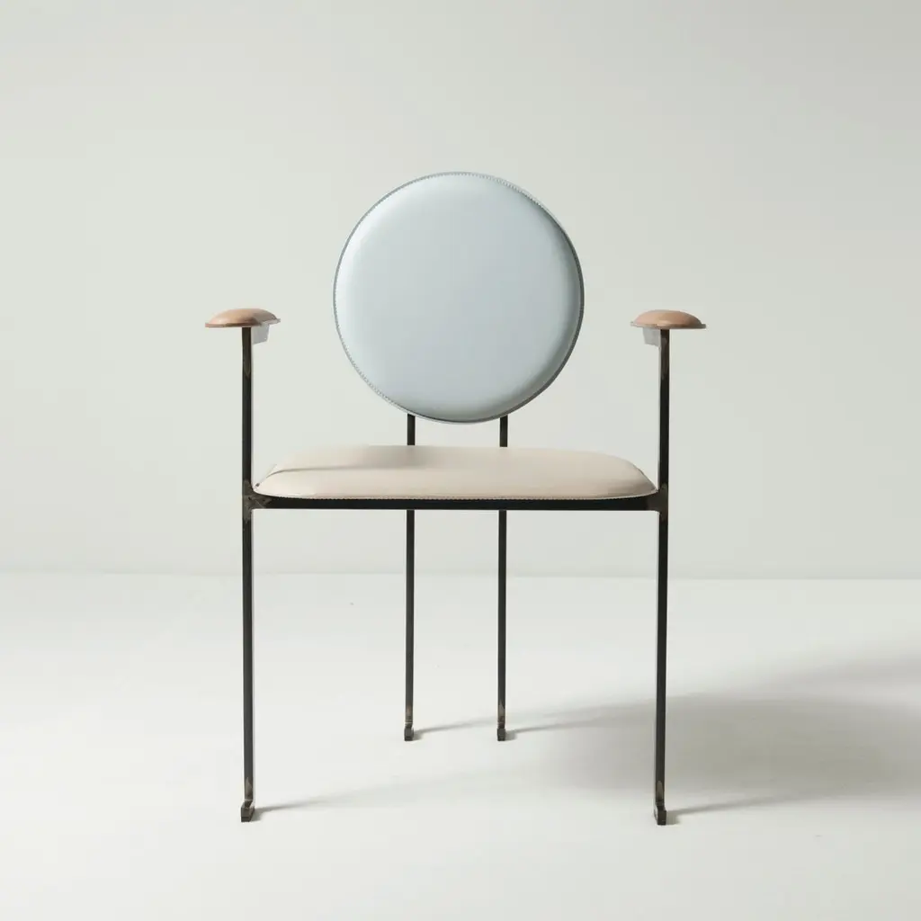 The mm3 is an armchair where the tilting backrest invites a constant interaction with the chair, providing an active way of sitting that promotes a mindful physical presence.Thanks to the proportions it can be used both as a dining table or desk as well as in a lounge layout. The sphere on the back works as a handle to move the chair easily. The frame is hand welded iron while the cushions are upholstered from handcrafted leather.All the pieces of the collection are handmade by artisans in the Milan area of Italy in respect of the local craftsmanship tradition.