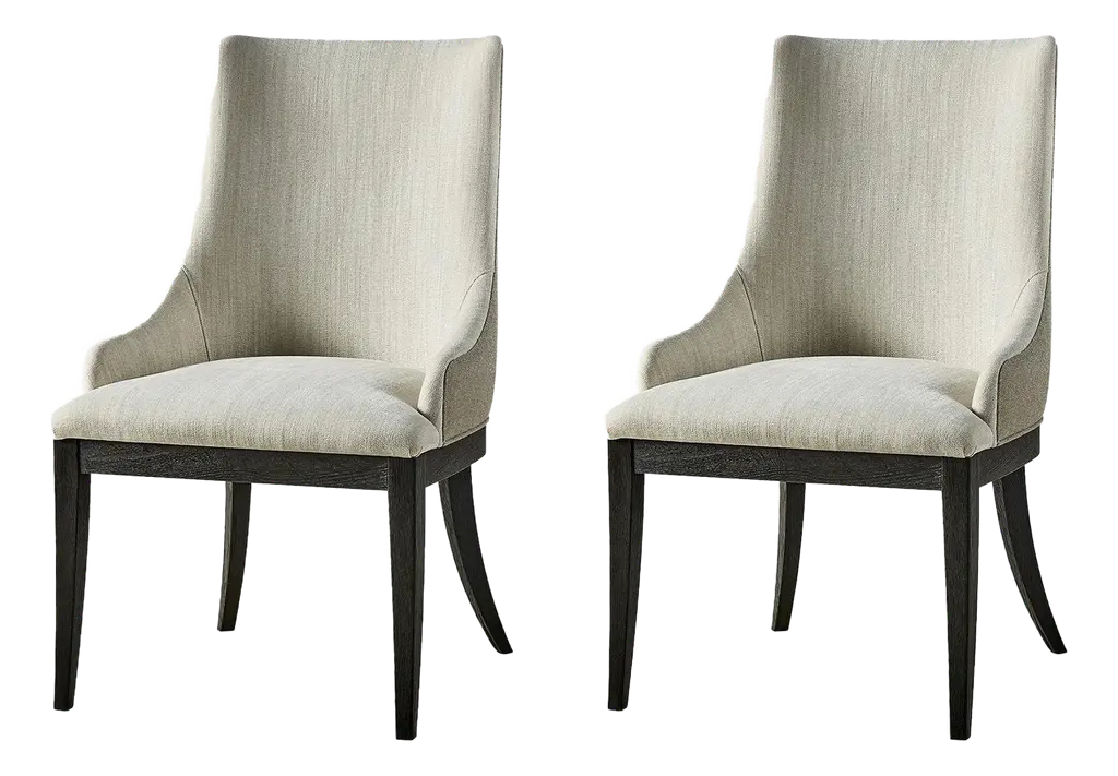 Modern upholstered dining side chair, the brushed beech wood finished in our gowan finish, with an upholstered backrest and bowed seat. Raised on square tapered and out flaring legs. Upholstery is a stain-resistant performance fabric.Draper Performance-UP5409 FabricDimensions: 22" W x 26" D x 35" HSeat - 19.5" H.