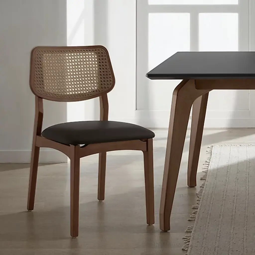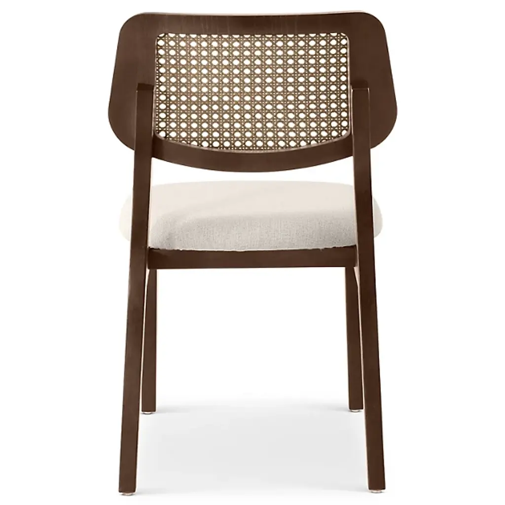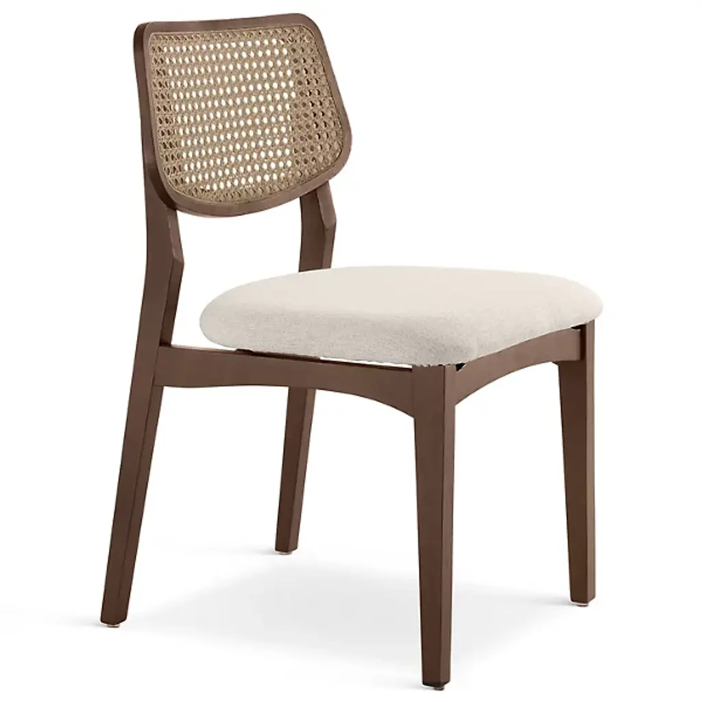 The Modern Brazilian Beth Cane Side Chair from Urbia brings a touch of contemporary elegance to your dining room. Crafted with attention to detail, it features a unique cane back detail that adds texture and a sense of lightness. The chair combines woven fabric and a fiber-wrapped foam seat for ultimate comfort, complemented by curved lines and tapered legs reminiscent of retro designs. It's an ideal choice for creating a stylish yet relaxing dining environment, suitable for residential use only.