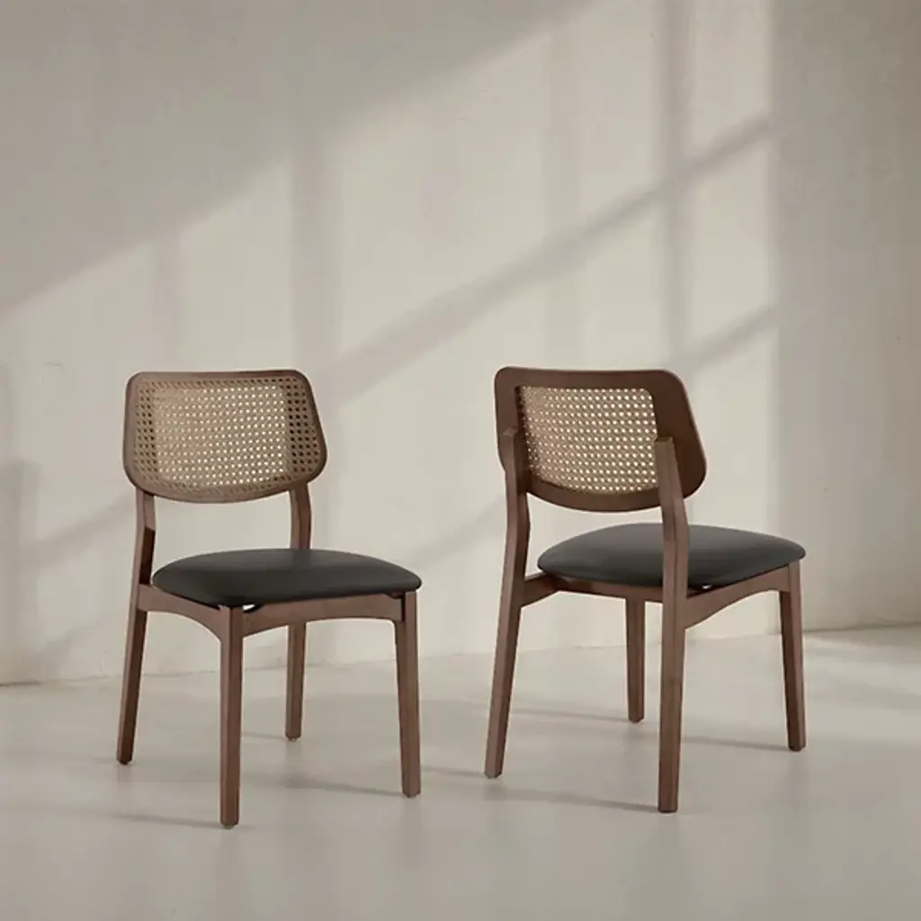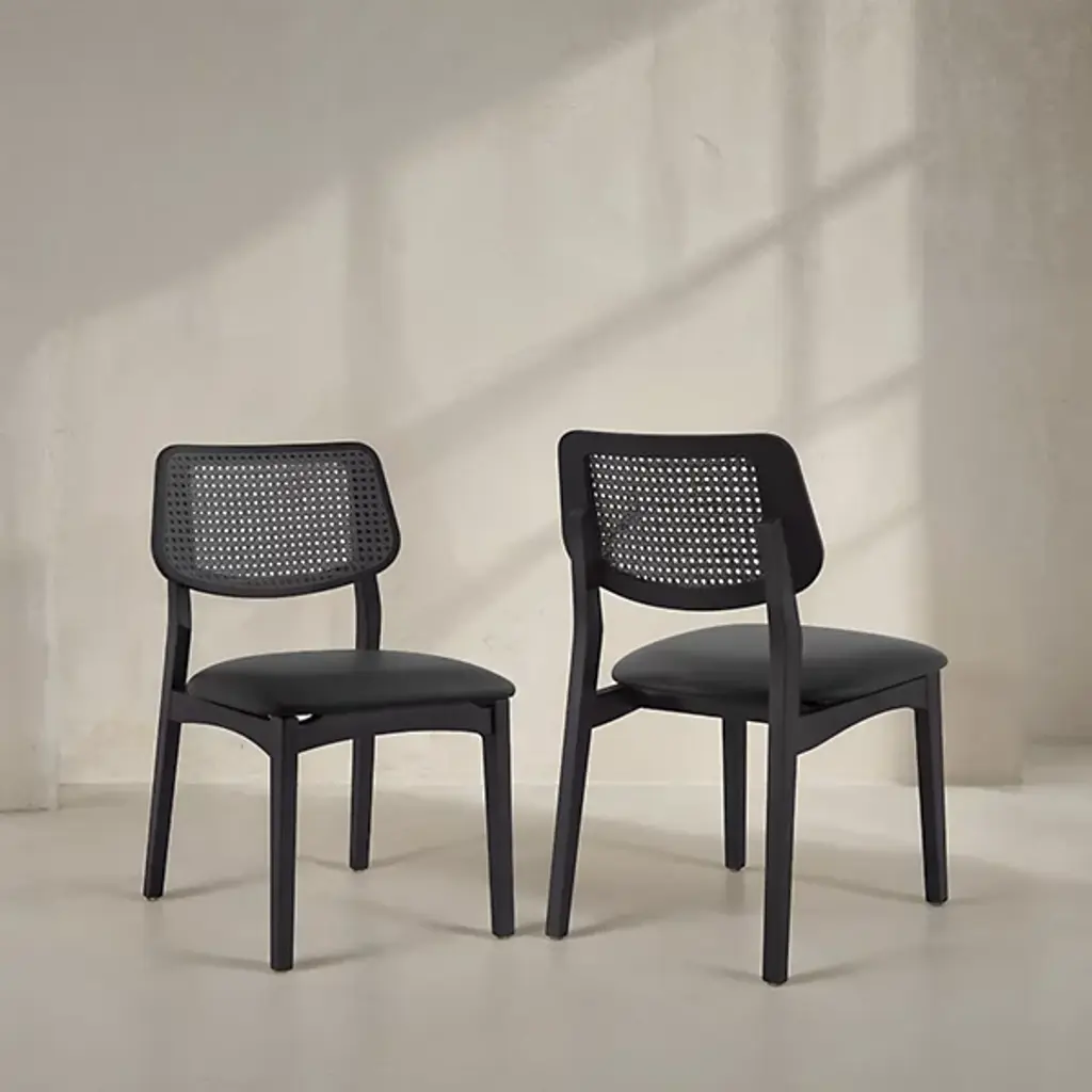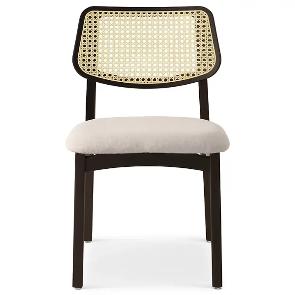 The Modern Brazilian Beth Cane Side Chair from Urbia brings a touch of contemporary elegance to your dining room. Crafted with attention to detail, it features a unique cane back detail that adds texture and a sense of lightness. The chair combines woven fabric and a fiber-wrapped foam seat for ultimate comfort, complemented by curved lines and tapered legs reminiscent of retro designs. It's an ideal choice for creating a stylish yet relaxing dining environment, suitable for residential use only.