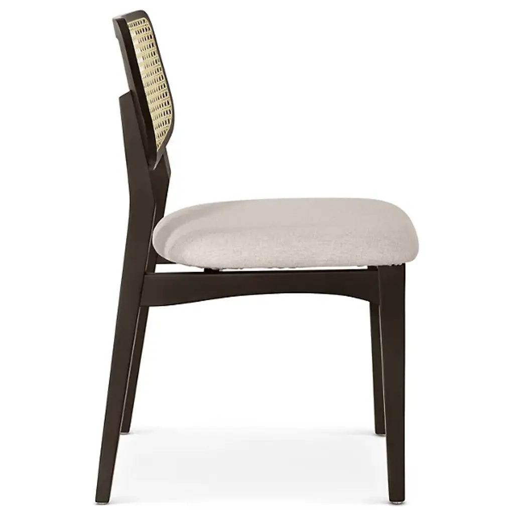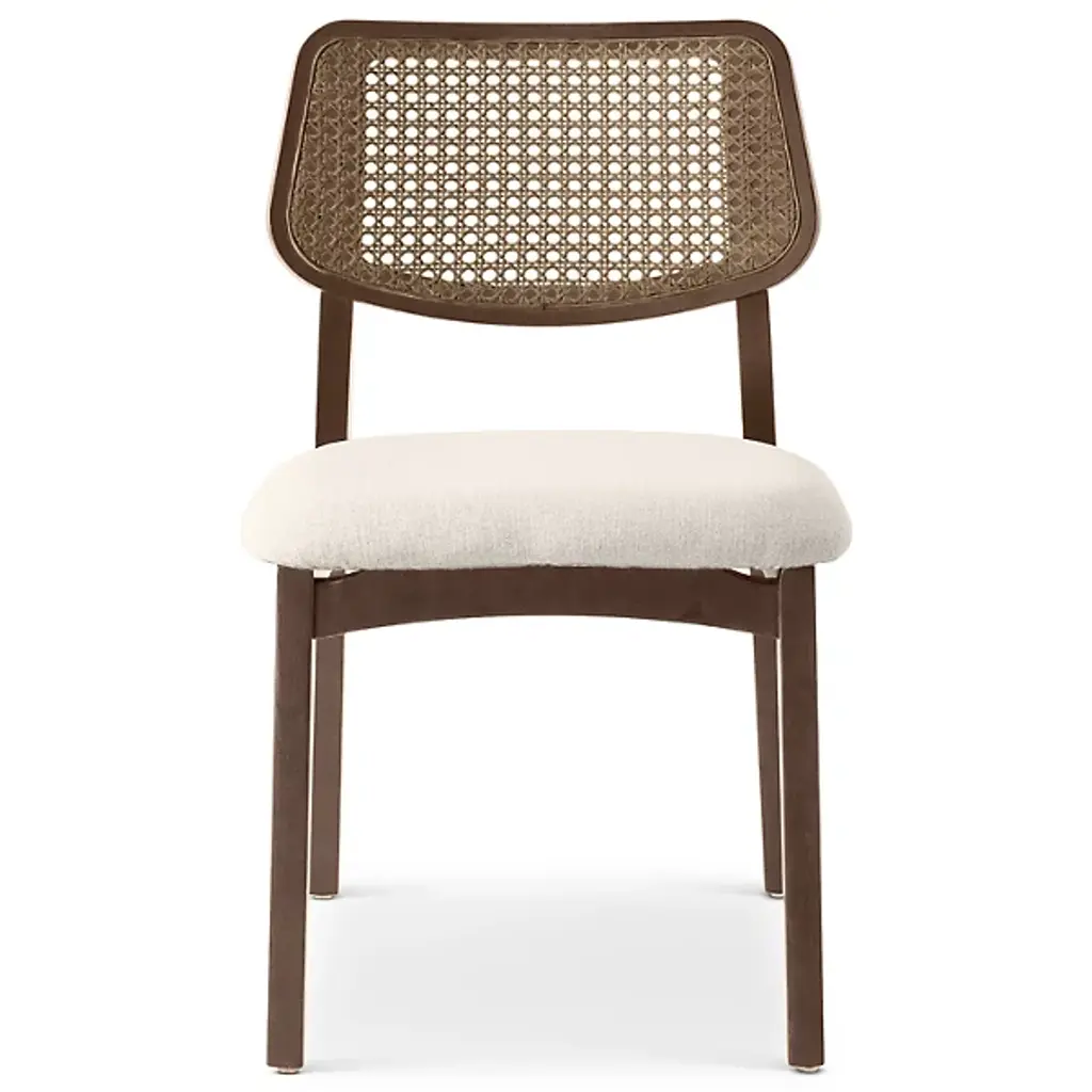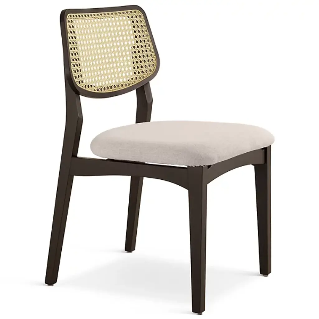 The Modern Brazilian Beth Cane Side Chair from Urbia brings a touch of contemporary elegance to your dining room. Crafted with attention to detail, it features a unique cane back detail that adds texture and a sense of lightness. The chair combines woven fabric and a fiber-wrapped foam seat for ultimate comfort, complemented by curved lines and tapered legs reminiscent of retro designs. It's an ideal choice for creating a stylish yet relaxing dining environment, suitable for residential use only.