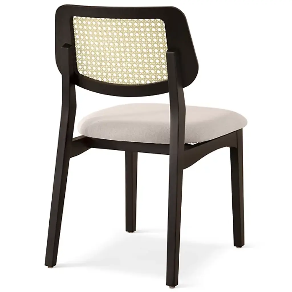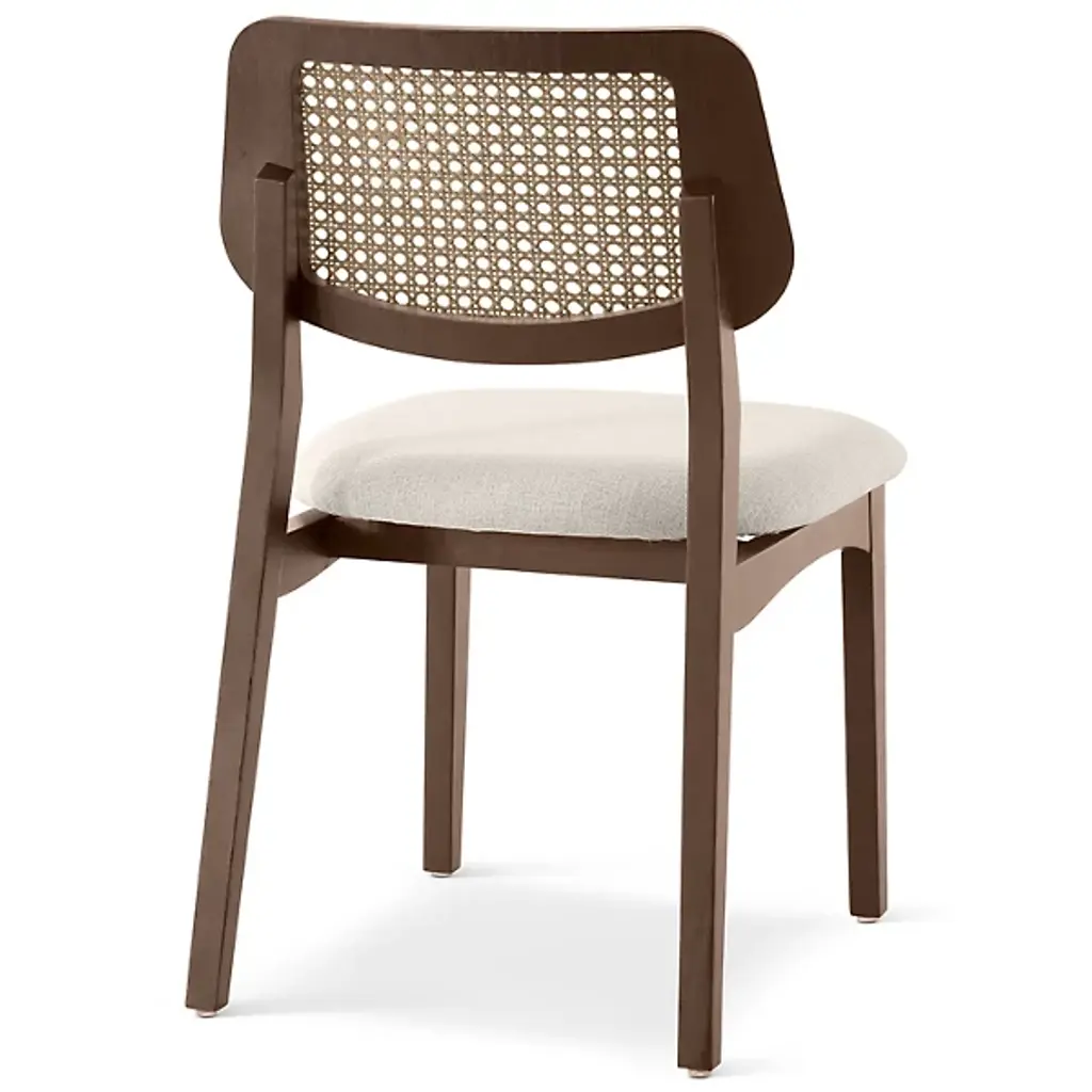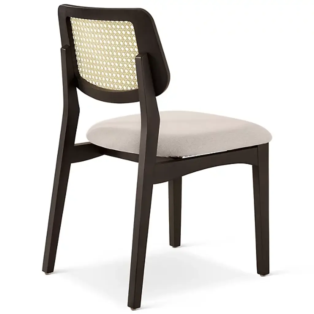 The Modern Brazilian Beth Cane Side Chair from Urbia brings a touch of contemporary elegance to your dining room. Crafted with attention to detail, it features a unique cane back detail that adds texture and a sense of lightness. The chair combines woven fabric and a fiber-wrapped foam seat for ultimate comfort, complemented by curved lines and tapered legs reminiscent of retro designs. It's an ideal choice for creating a stylish yet relaxing dining environment, suitable for residential use only.