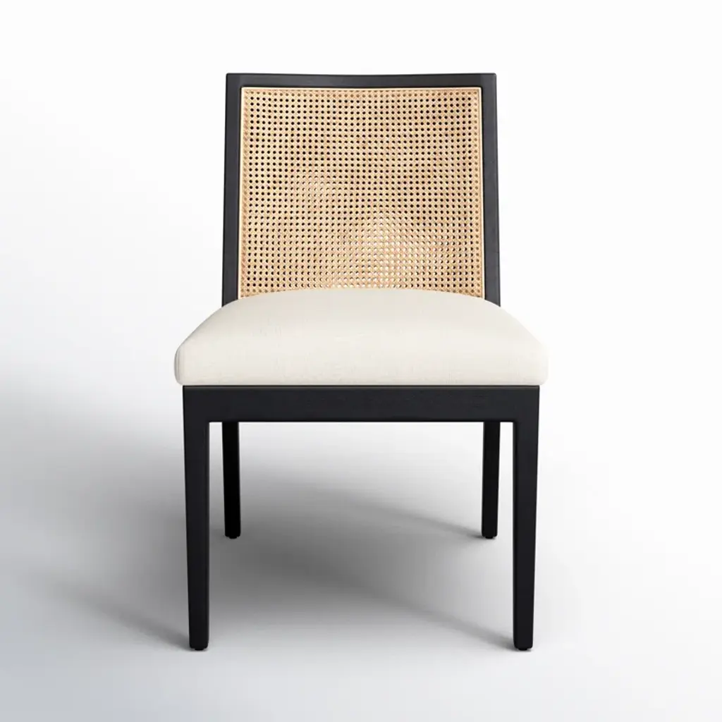 Meticulously crafted in Brazil, the Charlotte Side Chair presents a modern design that beautifully combines solid Tauari wood frame with natural caning and upholstery. The mixed materials come together harmoniously, creating a modern aesthetic with a touch of organic elements. The generous upholstered seat, slightly curved for enhanced comfort, makes it ideal for dining or various occasional needs. The solid wood legs, elegantly rounded at the corners, not only provide stability but also add a touch of sophistication. Completing the design, the attractive stretcher reinforces durability while adding visual appeal.