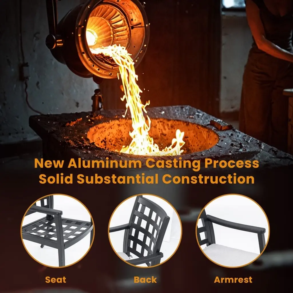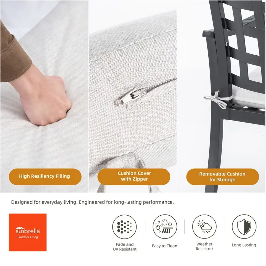 Product Features· Modern Classic Cast Aluminum Outdoor Patio Dining Chair with Textured Ember Black Finish, Ergonomic Design, and Removable Sunbrella Fabric Cushion ,Weather-Resistant and Durable· Crafted with cast aluminum technology, this dining chair features a seamless design integrating backrest, seat, and armrests for exceptional durability and heavy-duty performance. Its textured Ember Black powder-coated finish enhances weather resistance and offers easy maintenance, making it both stylish and practical for outdoor use.· Featuring a minimalist cast aluminum lattice design that blends classic elegance with modern simplicity, this chair’s backrest, seat, and armrests display elegant patterns with refined curves. Its versatile design effortlessly complements diverse outdoor settings, seamlessly blending into any environment while adding distinctive aesthetic appeal.· Designed for superior ergonomics, this outdoor chair features a lattice-patterned backrest with smooth curves and a concave seat for optimal support. The wide, gently sloped armrests enhance relaxation, while the strategically shaped rear legs ensure stability and prevent tipping.· The chair is equipped with adjustable scratch-resistant foot pads that adapt perfectly to uneven surfaces, ensuring stable placement and improving safety and stability while preventing floor damage.· The cushion fabric is made from high-quality Sunbrella fabric in Cast Silver color, offering exceptional durability and strong weather resistance, making it perfect for outdoor use. The cushions are removable, filled with high-density foam, and feature a zipper, making them easy to remove and clean for convenient maintenance.· Ideal for use in various settings such as gardens, balconies, and under eaves, allowing you to enjoy a relaxing and pleasant time outdoors.DimensionsLength (in.): 38.19Width (in.): 24.61Height (in.): 11.81(lbs.): 39.68Notice:Manual measurement has been used, there may be some reasonable error.Due to factors such as display equipment and shooting environment, the color of the item may be slightly different from the picture, which is a normal phenomenon, please refer to the actual item.Please confirm whether the size meets your requirements before you buy it!Contact US:After-sales Email Address: dhalcomb@doorise.comIf the item comes with any defect, damage(include damaged in transit) or missing partsand, please contact us with detailed images for free replacement or refund.