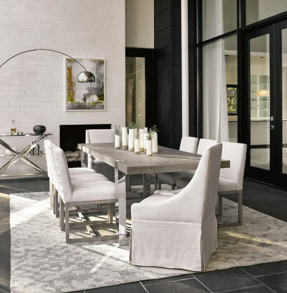 Modern by Universal is sophisticated, clean and simple, bold and a bit daring. It honors it's roots in Modernism but has been adapted for todays life and activities, in action and rest. Modern focuses on livability and usability, making it comfortable enough for everyday. - Solid wood base finished in Quartz finish - Washed Belgian Linen Fabric - Piping on chair back adds subtle uniqueness - Washed Belgian Linen 100% Linen
