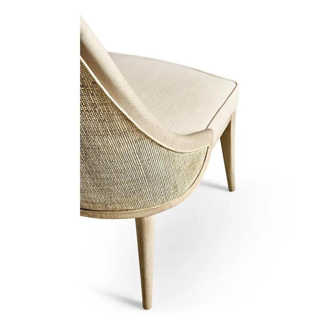 This exquisite piece embodies the beauty of simplicity with its organic forms and clean lines, creating a sophisticated contemporary aesthetic. The creamy white performance fabric upholstery offers a luxurious seating experience, while the oak frame in a whitewashed finish provides both durability and refined coastal charm. Adding a unique touch, the chair’s outside back is wrapped in grass cloth, enhancing its natural organic appeal and textural depth. Ideal for upscale dining spaces, this armchair invites relaxation and style into every meal.Dimensions: 22.25" W x 27.75" D x 40" HSeat Height: 19"These ship two at a time. kindly select multiples of two.