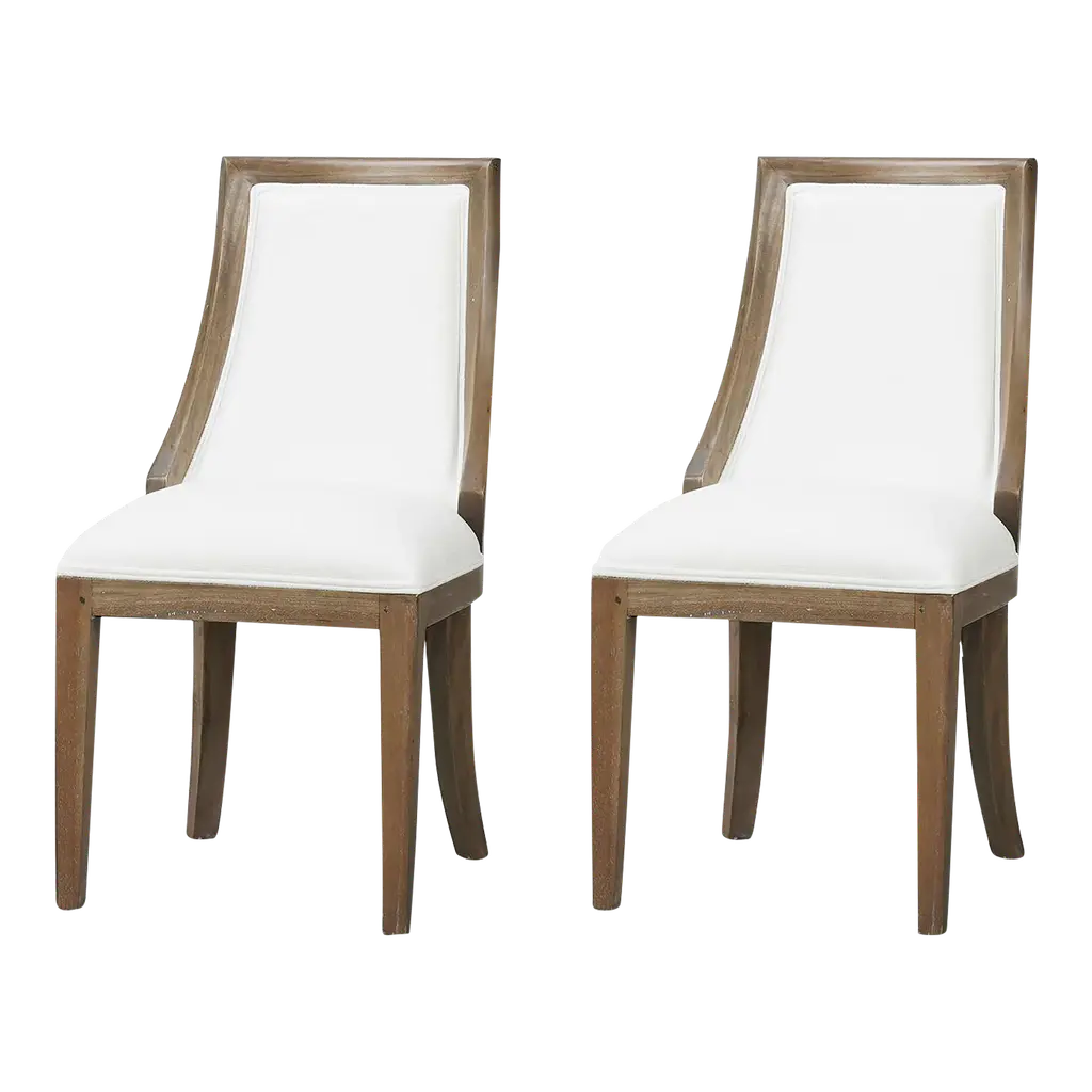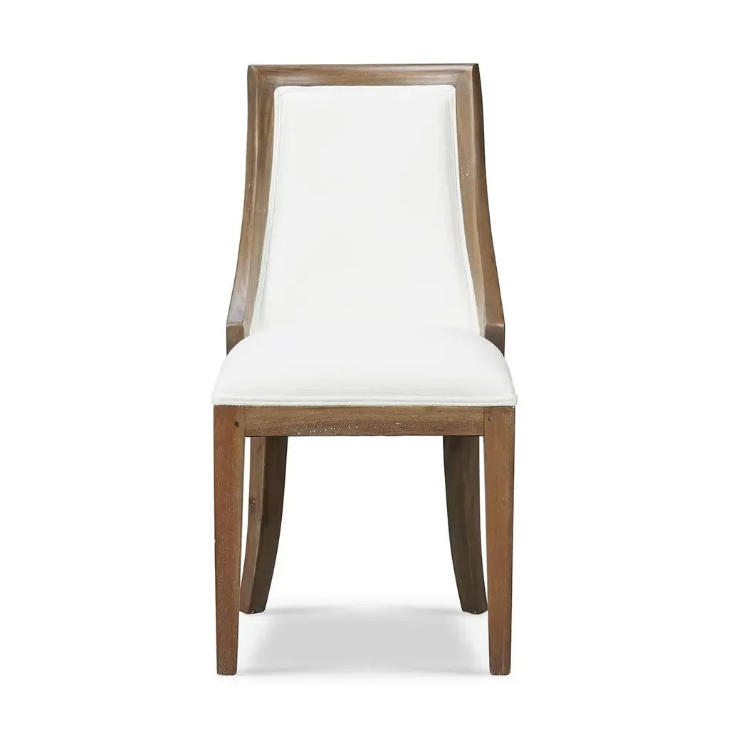 Crafted with a solid mahogany frame in a Straw Wash finish, this chair exudes rustic elegance. The gently curved back provides excellent support, while the Arctic White Performance Fabric upholstery offers durability and easy maintenance. Its stain-resistant fabric ensures it stays pristine through casual family meals or elegant dinner gatherings.With a perfect blend of style and comfort, this dining chair elevates any dining space with its modern design and functional appeal.Dimensions: 19" W x 25" D x 38" HSeat - 19" Custom finish options are also available. Contact us to learn more.