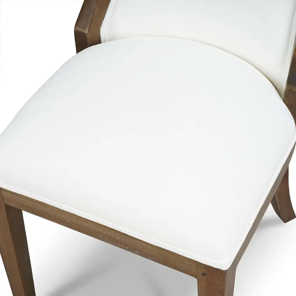 Crafted with a solid mahogany frame in a Straw Wash finish, this chair exudes rustic elegance. The gently curved back provides excellent support, while the Arctic White Performance Fabric upholstery offers durability and easy maintenance. Its stain-resistant fabric ensures it stays pristine through casual family meals or elegant dinner gatherings. With a perfect blend of style and comfort, this dining chair elevates any dining space with its modern design and functional appeal. Dimensions: 19" W x 25" D x 38" H Seat - 19"