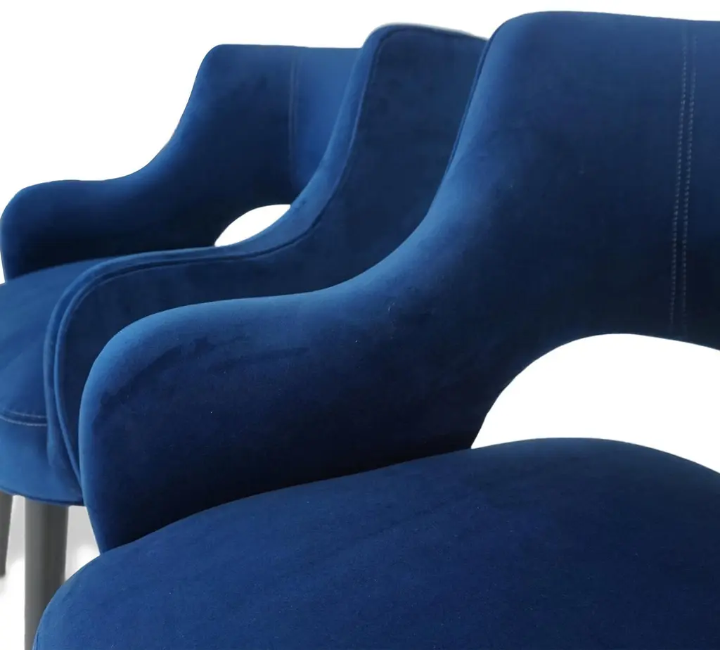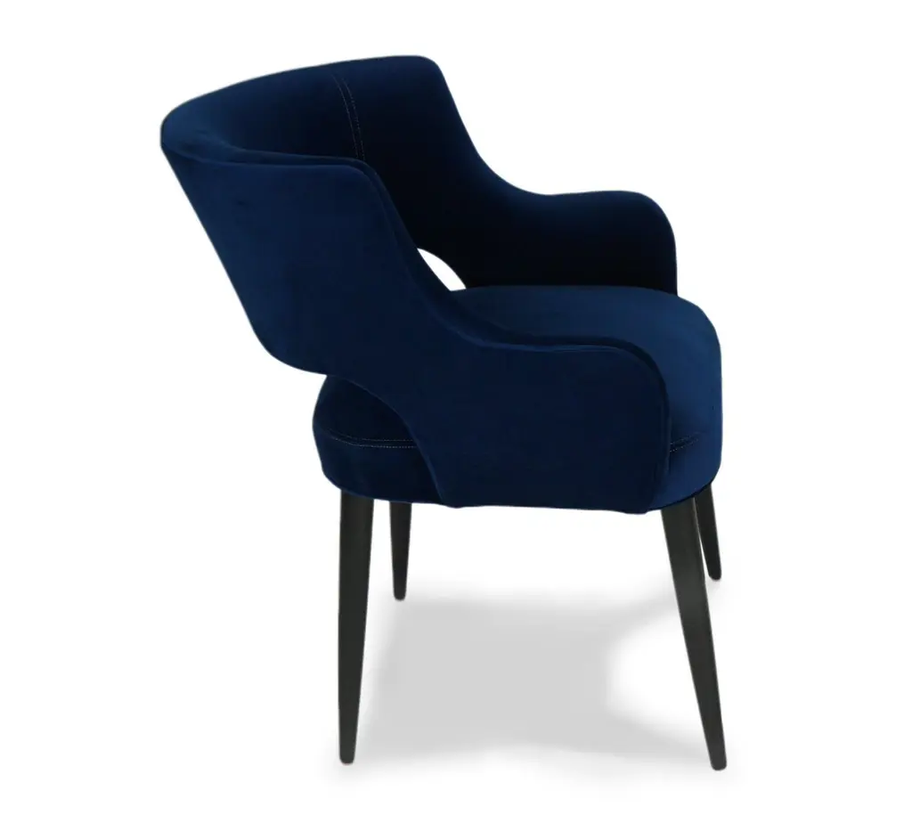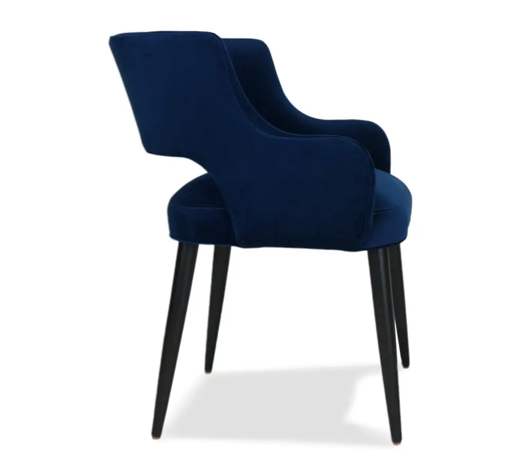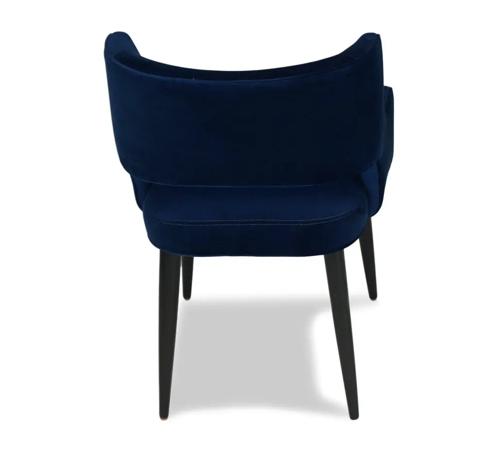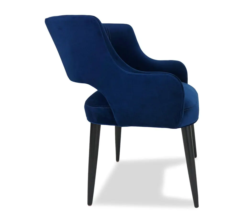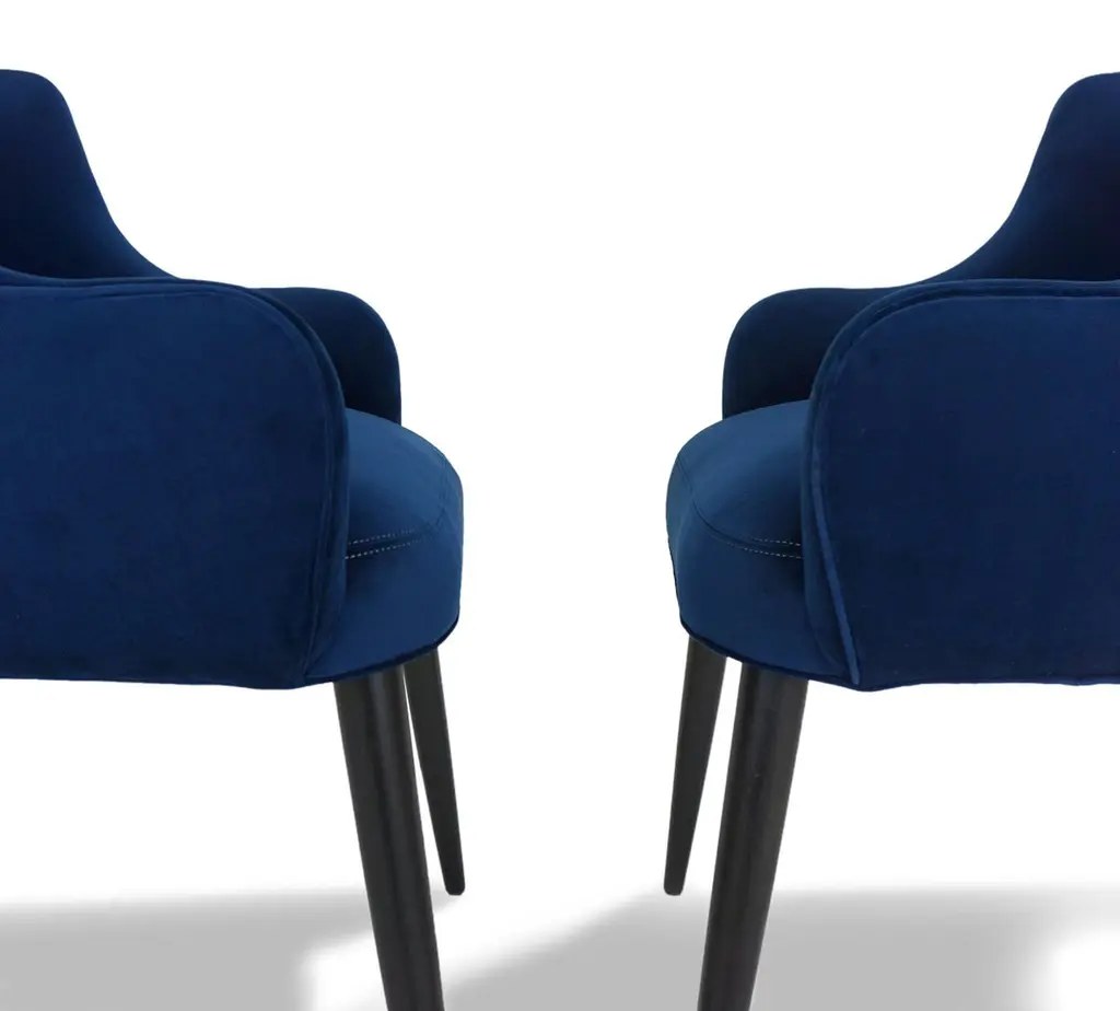 Like our dining chairs with the same name, the Beccacino armchairs designed to be comfortable and modern with a relaxed pitch. The chair hugs your back for comfortable support while the sloping arms give a place for your arms to rest. The chairs shown feature an ebony finish and are covered in soft blue velvet with piping accent. This chair is completely customizable and can be remade as shown or with the customers’ choice of fabric and finish.Measurements:Outside 33.5” H x 22” W x 27” DInside 14” H x 17” W x 20” DSeat height 20” (includes belly height of cushion).
