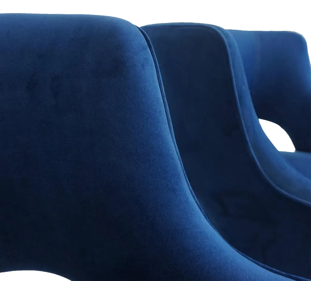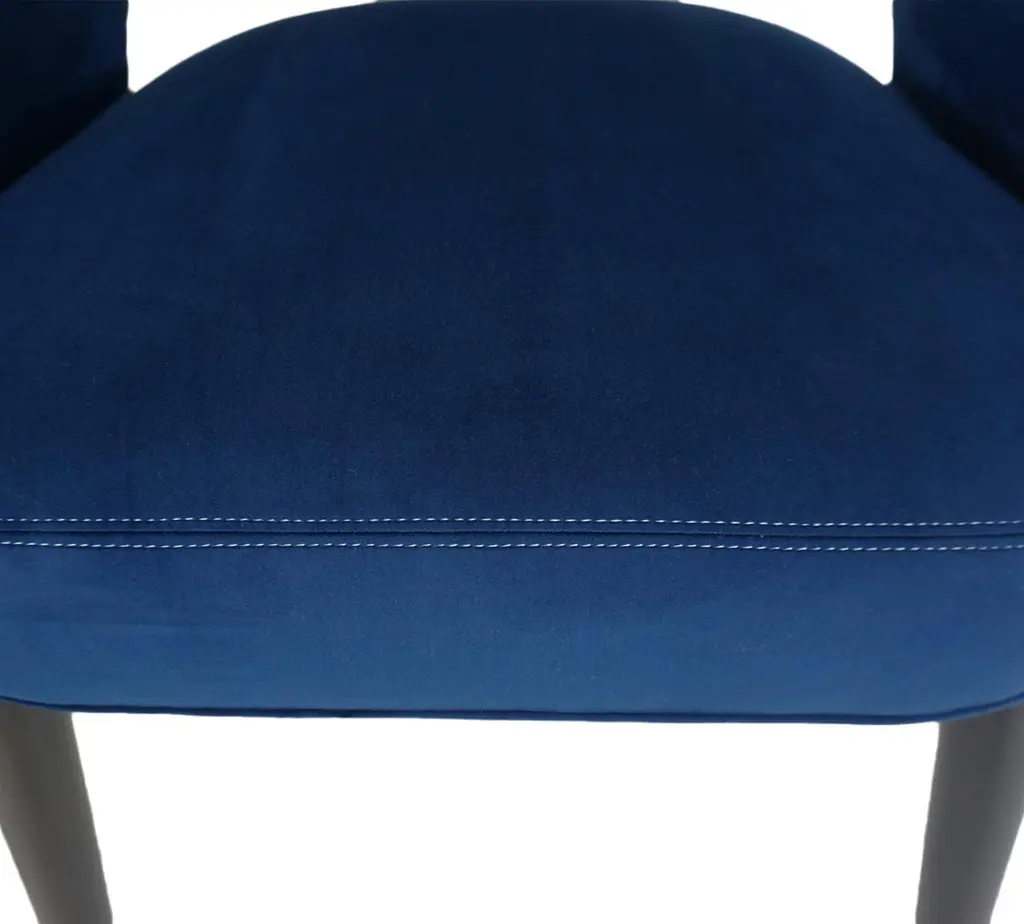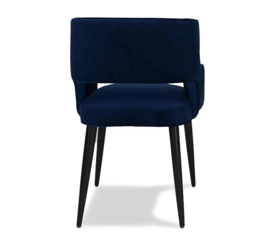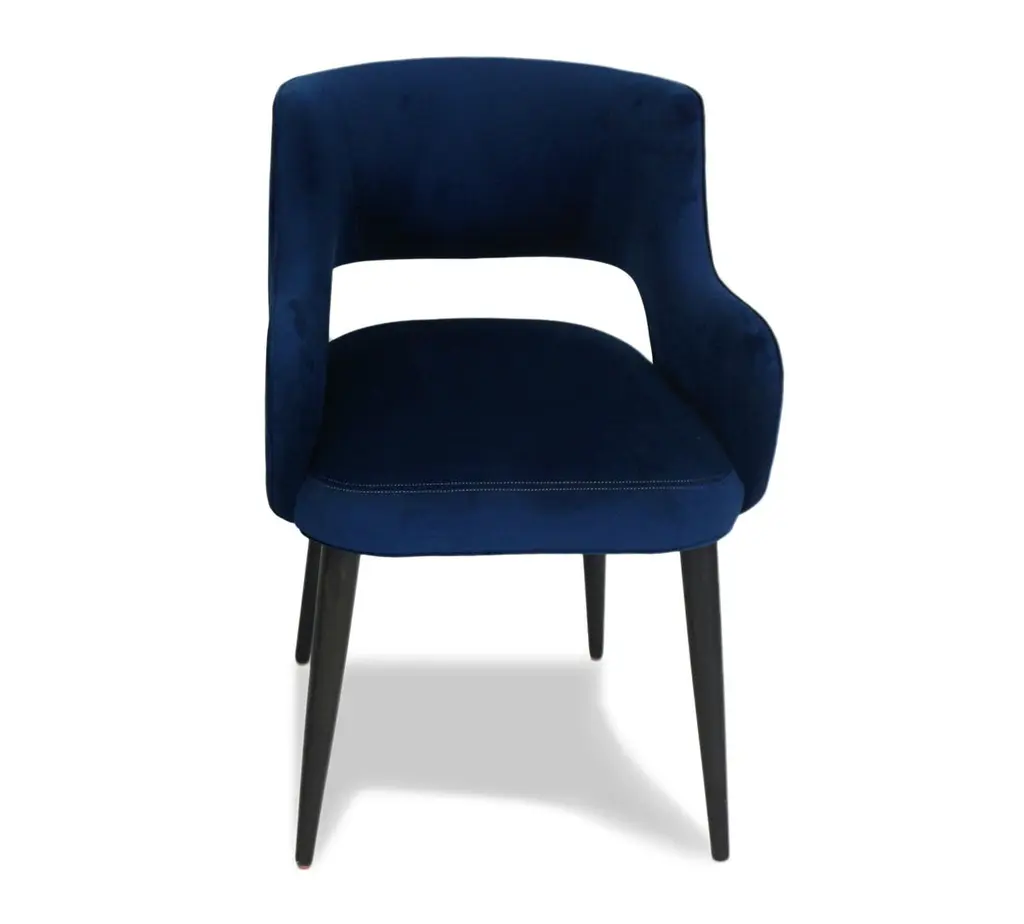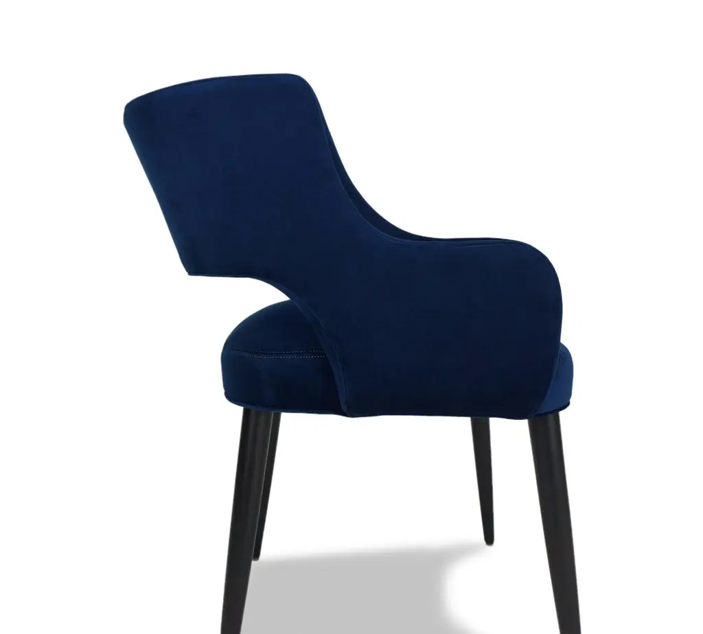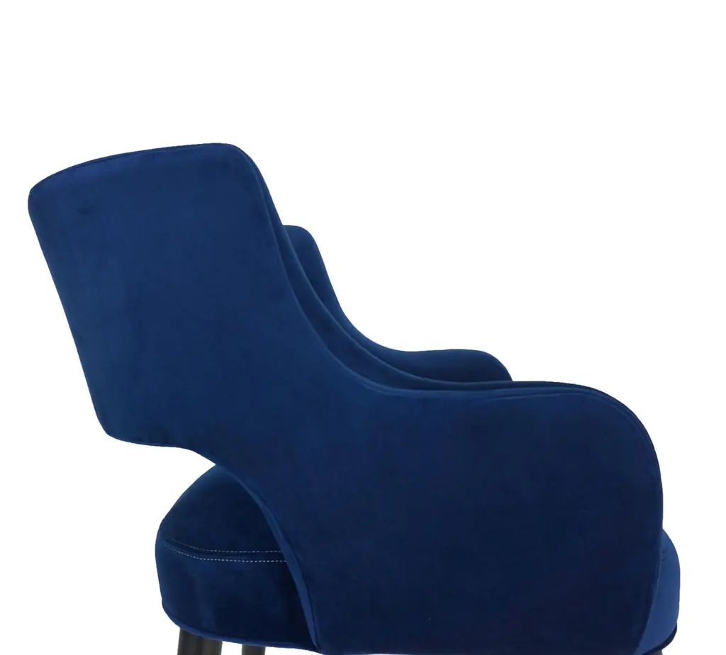 Like our dining chairs with the same name, the Beccacino armchairs designed to be comfortable and modern with a relaxed pitch. The chair hugs your back for comfortable support while the sloping arms give a place for your arms to rest. The chairs shown feature an ebony finish and are covered in soft blue velvet with piping accent. This chair is completely customizable and can be remade as shown or with the customers’ choice of fabric and finish.Measurements:Outside 33.5” H x 22” W x 27” DInside 14” H x 17” W x 20” DSeat height 20” (includes belly height of cushion).