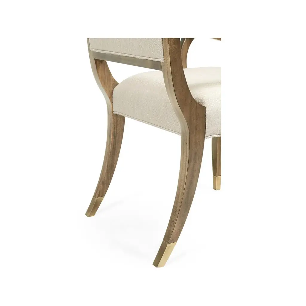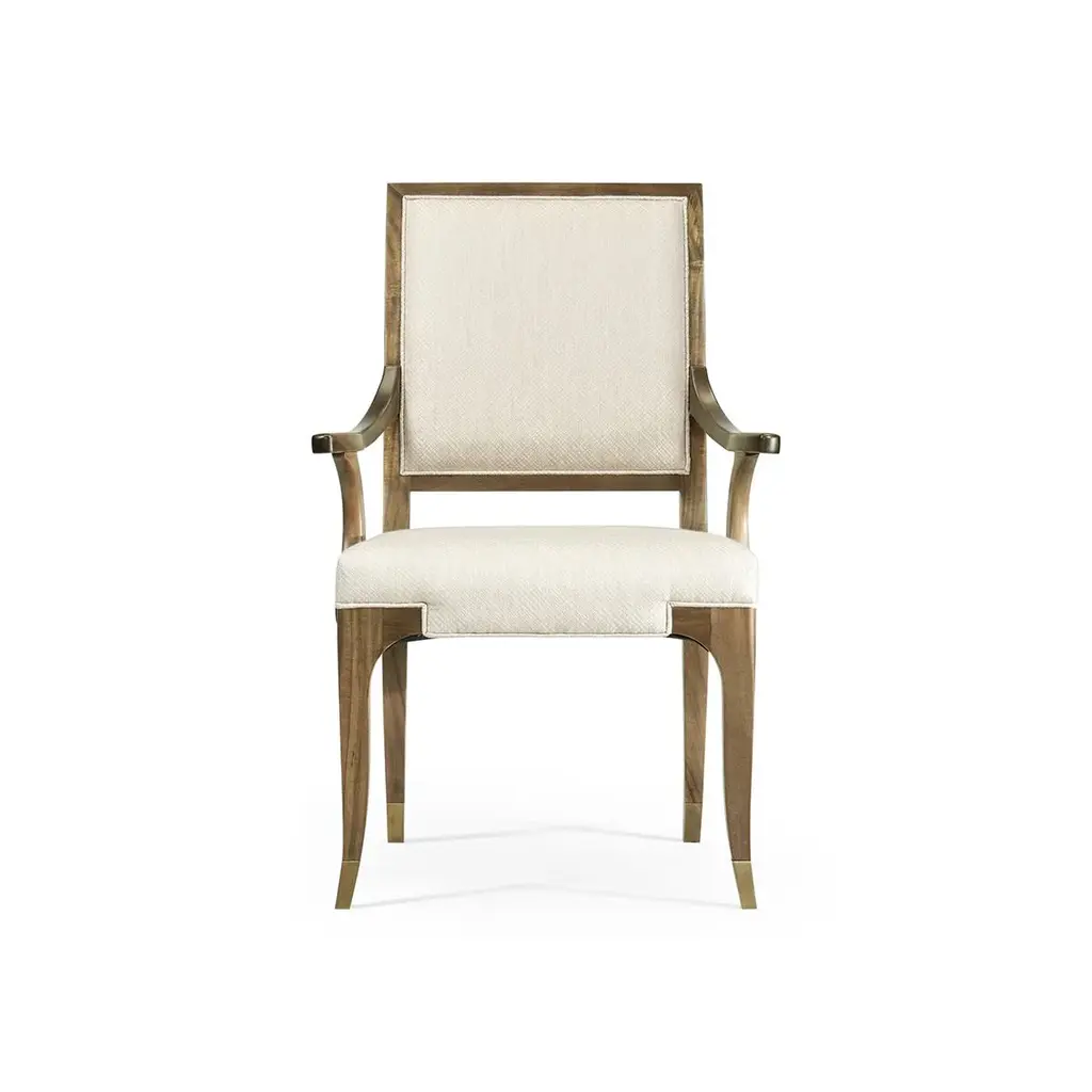 The Modern High Back Dining Armchair is a beautiful piece of furniture that combines both comfort and style. The padded backrest, carved and curved arms, and boxed upholstered cushion provide excellent support and make it perfect for long dining sessions with family and friends. The flared legs ending with brass caps add to the chair's stability and elegance, while the use of hardwood ensures its durability. The use of performance fabric for the upholstery is a great choice, as it makes the chair easy to maintain and clean, while also being resistant to stains and spills. This means the chair can withstand regular use and still look as good as new. Dimensions: 23 5/8" W x 26 3/8" D x 39 1/8" H" Seat - 19 1/2" Arm - 24 3/4"