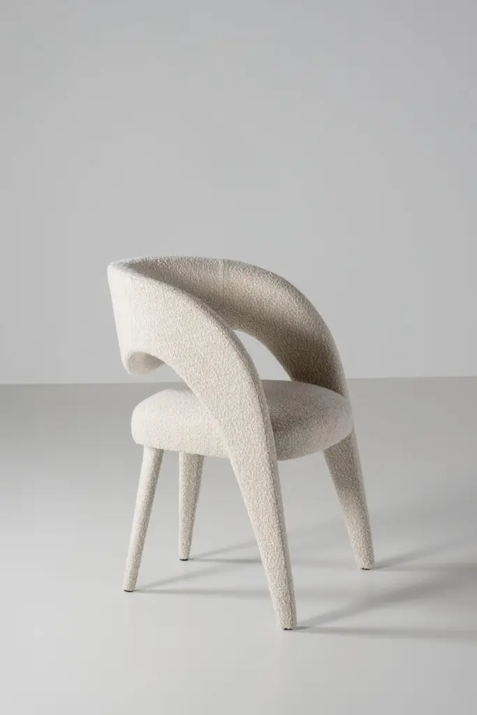 Mid-Century Modern Laurence Chair, Contemporary Collection, Handcrafted in Portugal - Europe by Greenapple.The Laurence dining chair is an artistic tribute to the essence of femininity in contemporary design. With its elegant and daring silhouette, this dining chair is a sensory trigger, revealing dynamic and vibrant contours with each encounter. Meticulously crafted in premium fabric, Laurence combines fine craftsmanship and unique design, becoming a favorite dining chair among designers and a versatile addition to sophisticated interiors.The Laurence chair is upholstered in cream bouclé, offering a soft and elegant seating experience for indoor spaces. The fabric can be treated with a stain-resistant finish for added durability.Its structure is made from anti-fungal and vermin-free solid steamed beechwood and birch plywood, ensuring strength and stability. Designed to withstand humid environments, it is also suitable for outdoor use when customized with weather-resistant fabric. Metal connecting components provide additional reinforcement, making it a versatile choice for different settings.The Laurence chair can be customized in terms of dimensions, materials and finishes.Laurence Chair Material CodesM104678 Bouclé, WhiteHandcrafted in Portugal - Europe by GreenappleUnique by design, Crafted by peopleGreenapple transforms contemporary spaces into exclusive narratives of design and craftsmanship. From custom-made furniture to bespoke interiors, each creation is a timeless work of art, shaped by master artisans who honor centuries-old techniques.Founded in 2005 by Sérgio Rebola and Rute Martins, Greenapple has earned global recognition among high-end clientele and leading design firms. While Rute designs each unique piece, Sérgio ensures uncompromising quality from design to production and from production to your home. We provide a seamless experience, offering short production lead times, worldwide delivery within 7 to 10 days, and white-glove service upon request.For U.S. clients, we can handle all customs clearance, cover duties, and offer white-glove service as well upon request.Seat, Office Chair, Chair with Arms