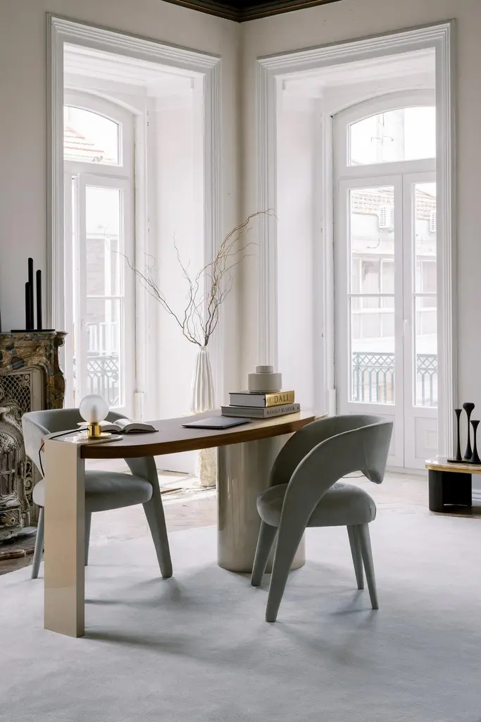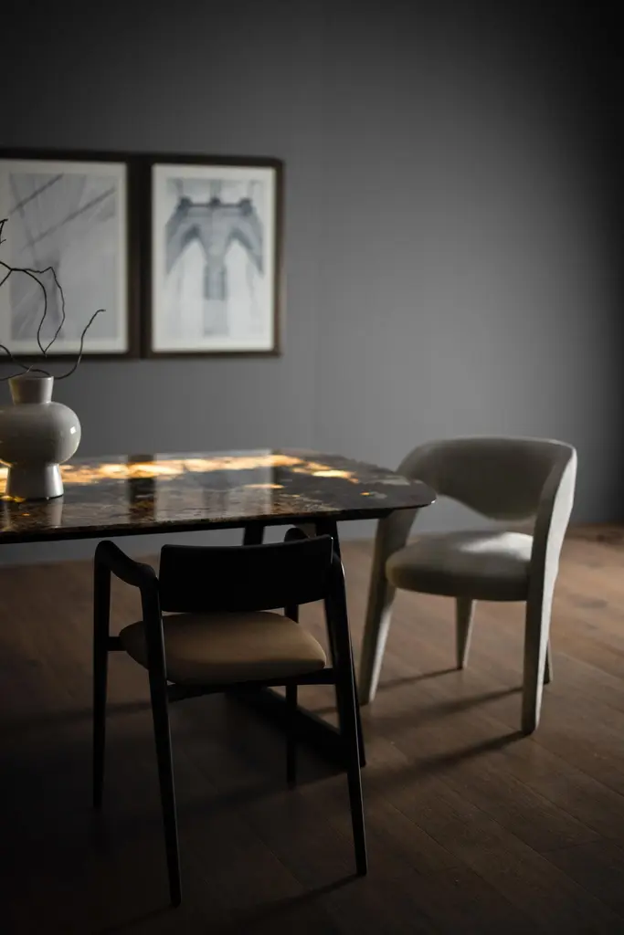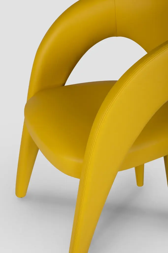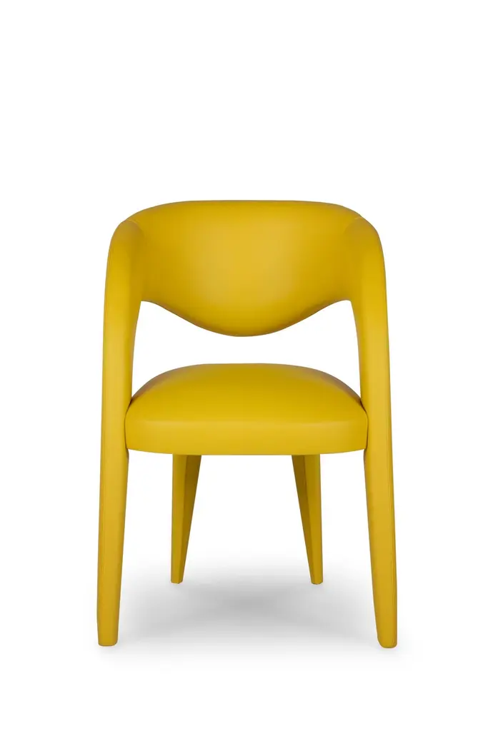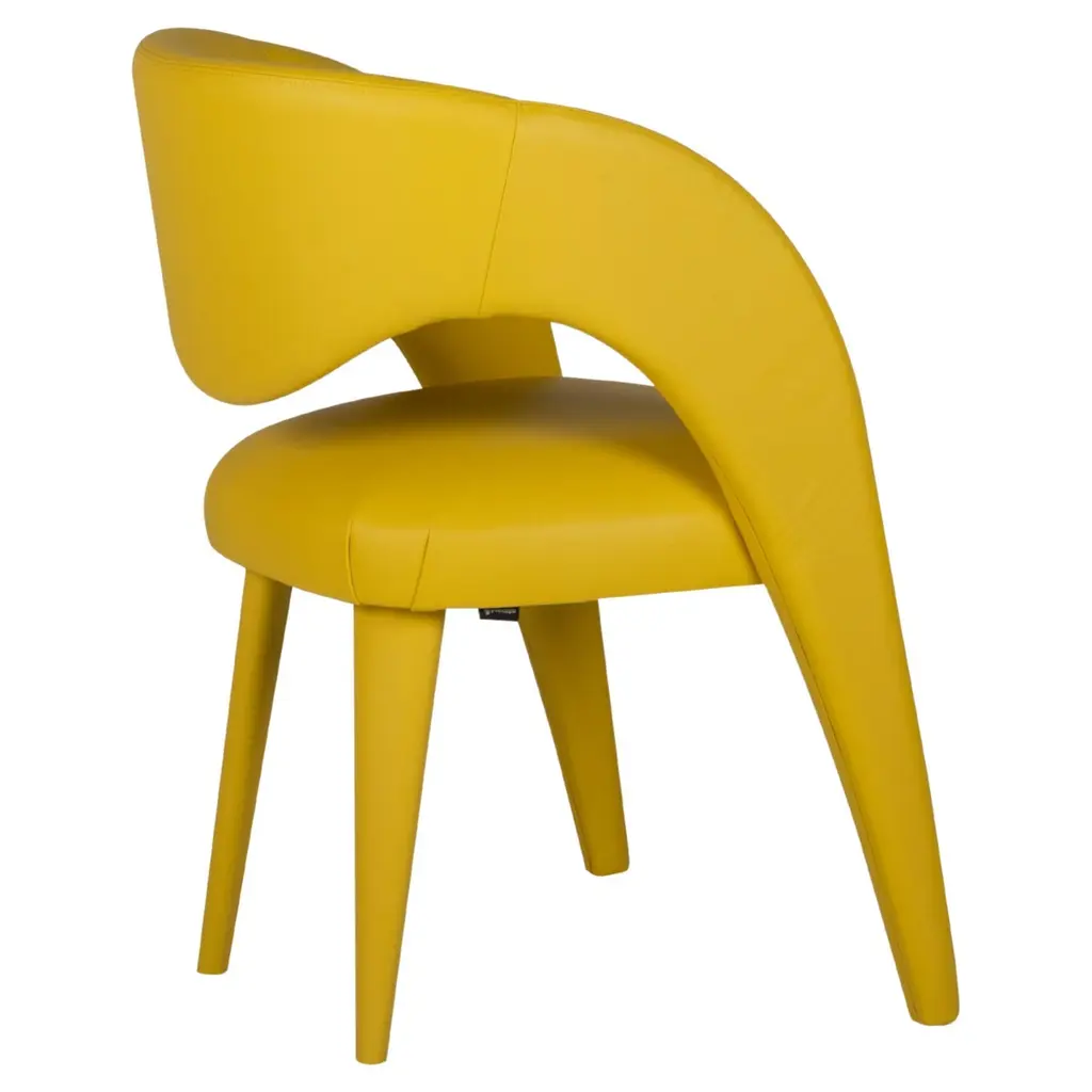 Laurence Chair, Contemporary Collection, Handcrafted in Portugal - Europe by Greenapple.The Laurence leather dining chair is an artistic tribute to the essence of femininity in contemporary design. With its elegant and daring silhouette, this leather dining chair is a sensory trigger, revealing dynamic and vibrant contours with each encounter. Meticulously crafted in premium leather, Laurence combines fine craftsmanship and unique design, becoming a favorite dining chair among designers and a versatile addition to sophisticated interiors.The Laurence chair is upholstered in yellow leather, offering a vibrant and stylish seating experience for indoor spaces. The leather can be treated with a stain-resistant finish for added durability.Its structure is made from anti-fungal and vermin-free solid steamed beechwood and birch plywood, ensuring strength and stability. Designed to withstand humid environments, it is also suitable for outdoor use when customized with weather-resistant fabric. Metal connecting components provide additional reinforcement, making it a versatile choice for different settings.The Laurence chairs can be customized in terms of dimensions, materials and finishes. Laurence Chair Material CodesM104736 Leather, YellowHandcrafted in Portugal - Europe by GreenappleUnique by design, Crafted by peopleGreenapple transforms contemporary spaces into exclusive narratives of design and craftsmanship. From custom-made furniture to bespoke interiors, each creation is a timeless work of art, shaped by master artisans who honor centuries-old techniques.Founded in 2005 by Sérgio Rebola and Rute Martins, Greenapple has earned global recognition among high-end clientele and leading design firms. While Rute designs each unique piece, Sérgio ensures uncompromising quality from design to production and from production to your home. We provide a seamless experience, offering short production lead times, worldwide delivery within 7 to 10 days, and white-glove service upon request.For U.S. clients, we can handle all customs clearance, cover duties, and offer white-glove service as well upon request.Seat, Office Chair, Chair with Arms